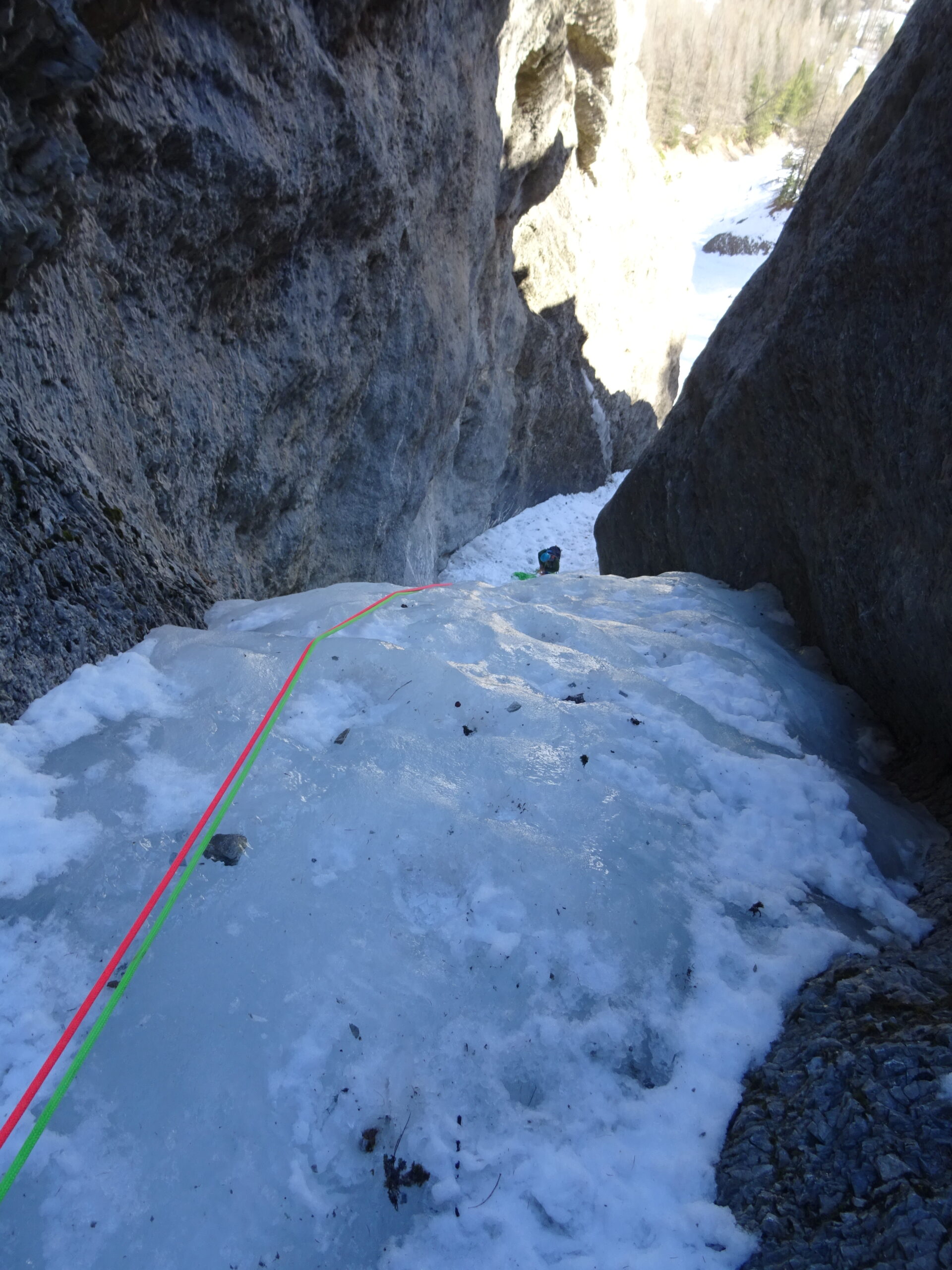 Arrivati in discesa dopo Y droite. Ghiaccio ancora abbondante e visto l’esposizione molto duro su L1 (mooolto lavorato). S1 comoda a ch.+fix. L2 più bagnato ma altrettanto lavorato. S2 su albero sulla dx (cordoni un po’ scomodi da raggiungere). Gradazione francamente alta, niente a che vedere con i 3 nostrani, 2+ è sicuramente più verosimile.