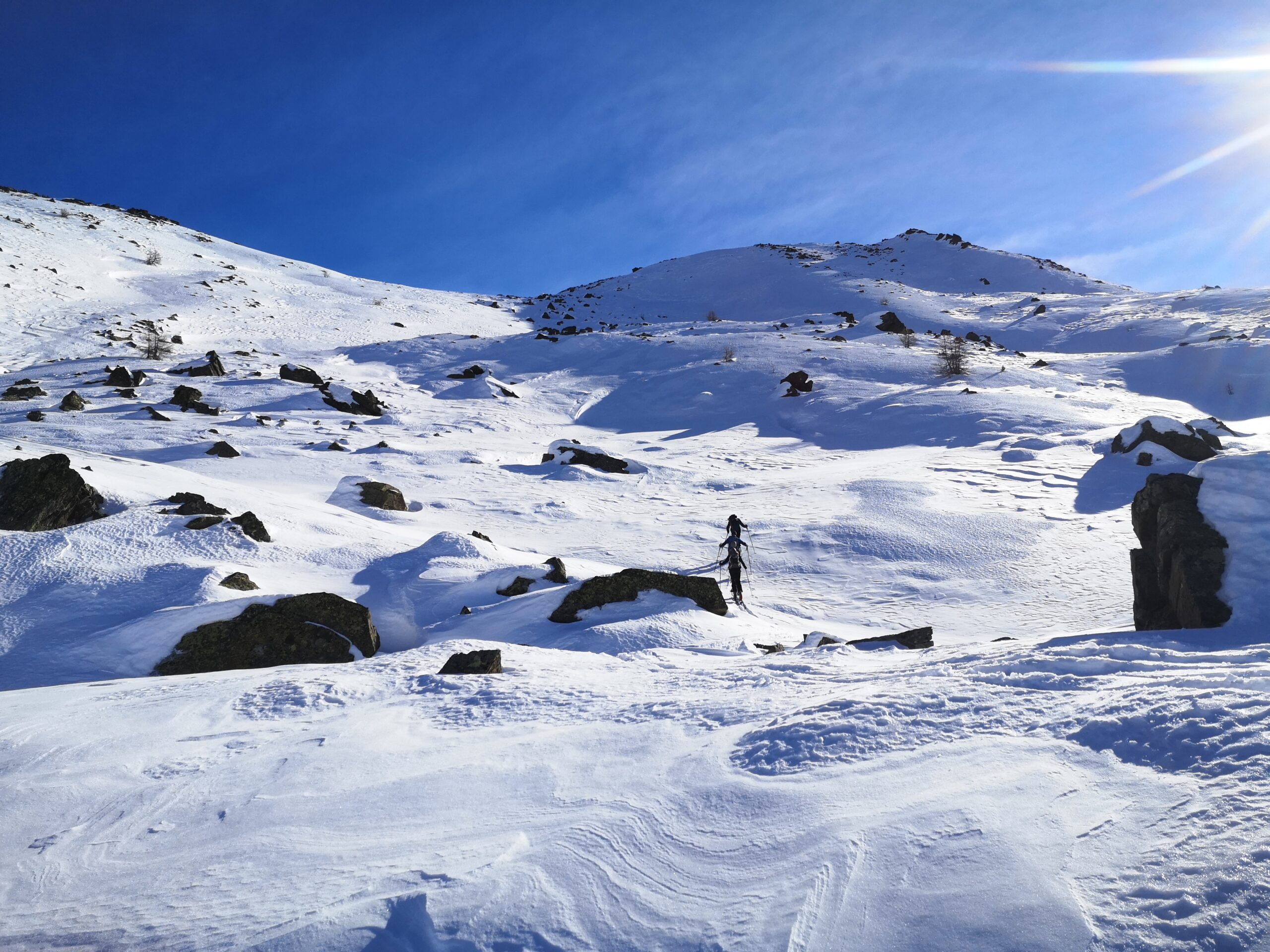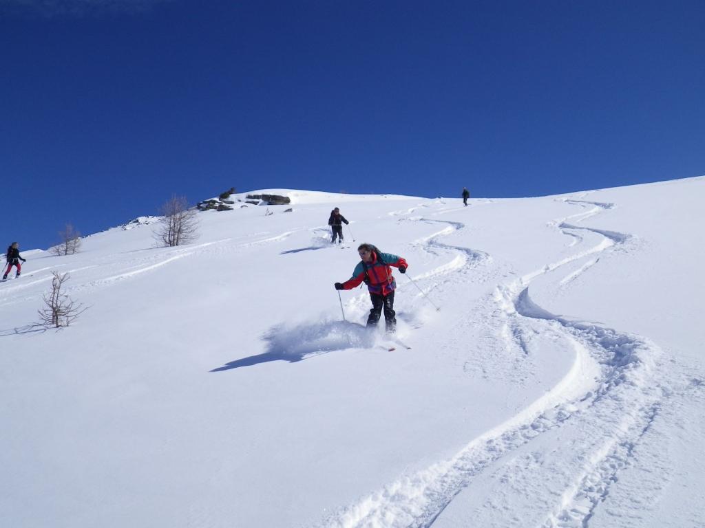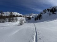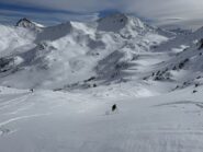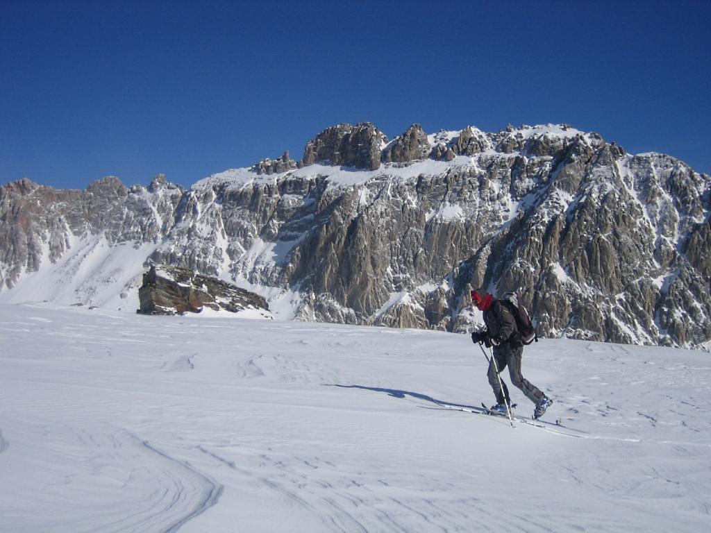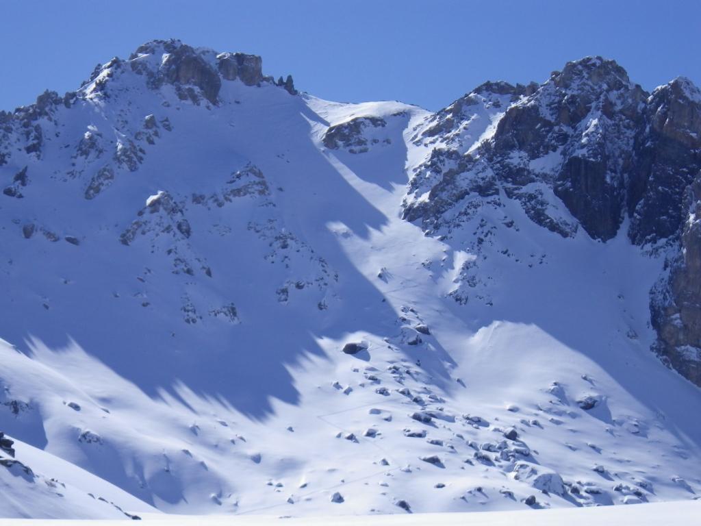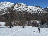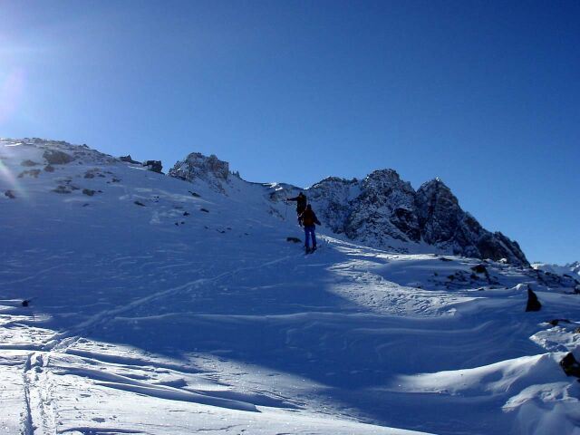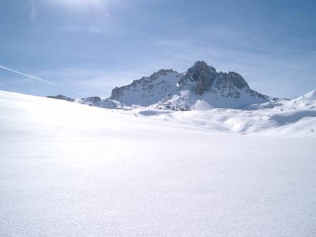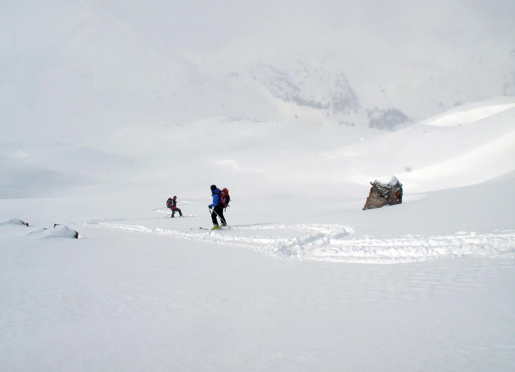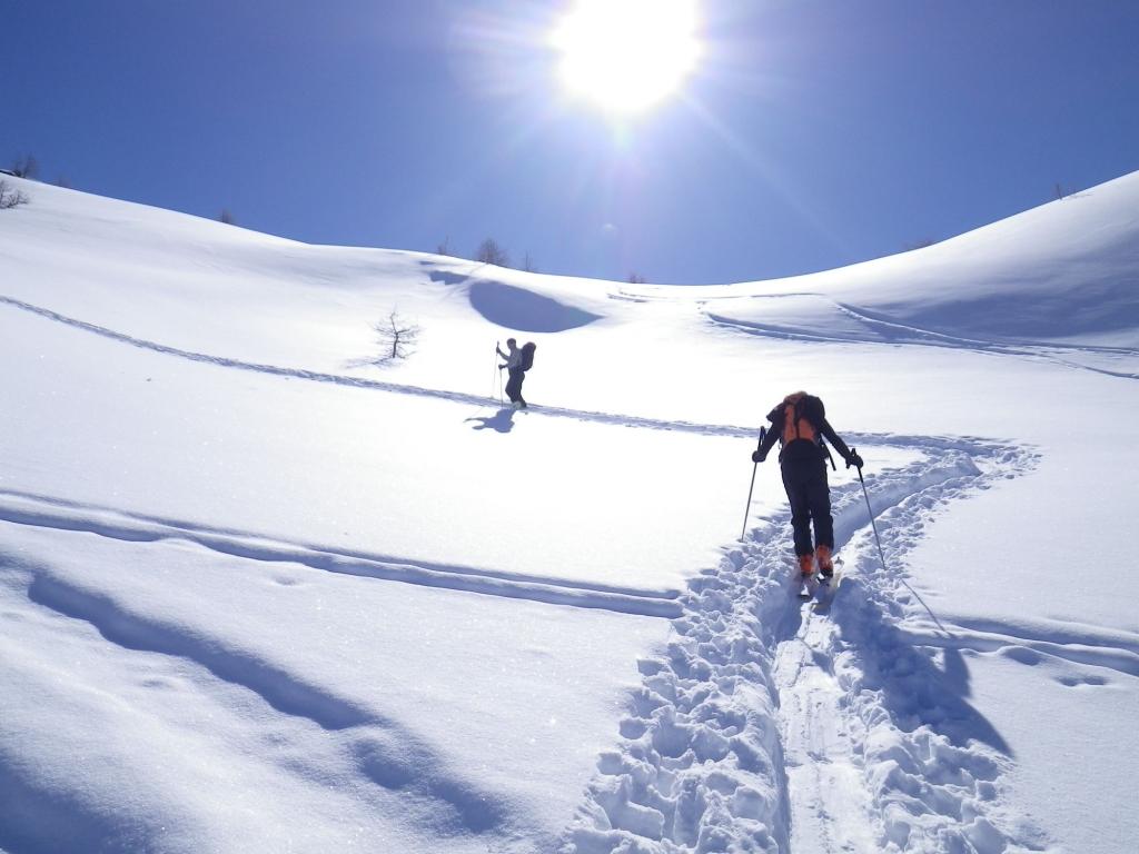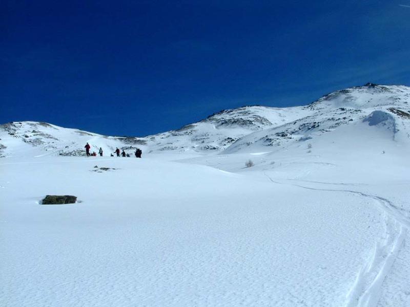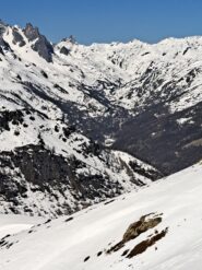 Di qui si prosegue nell’0monimo vallone per deviare poi a sx in direzione di un evidente colle, per ampi pebdii in moderata pendenza. Dal Colle si prosegue per cresta con gli sci fino alla cima, se l’innevamento lo consente.