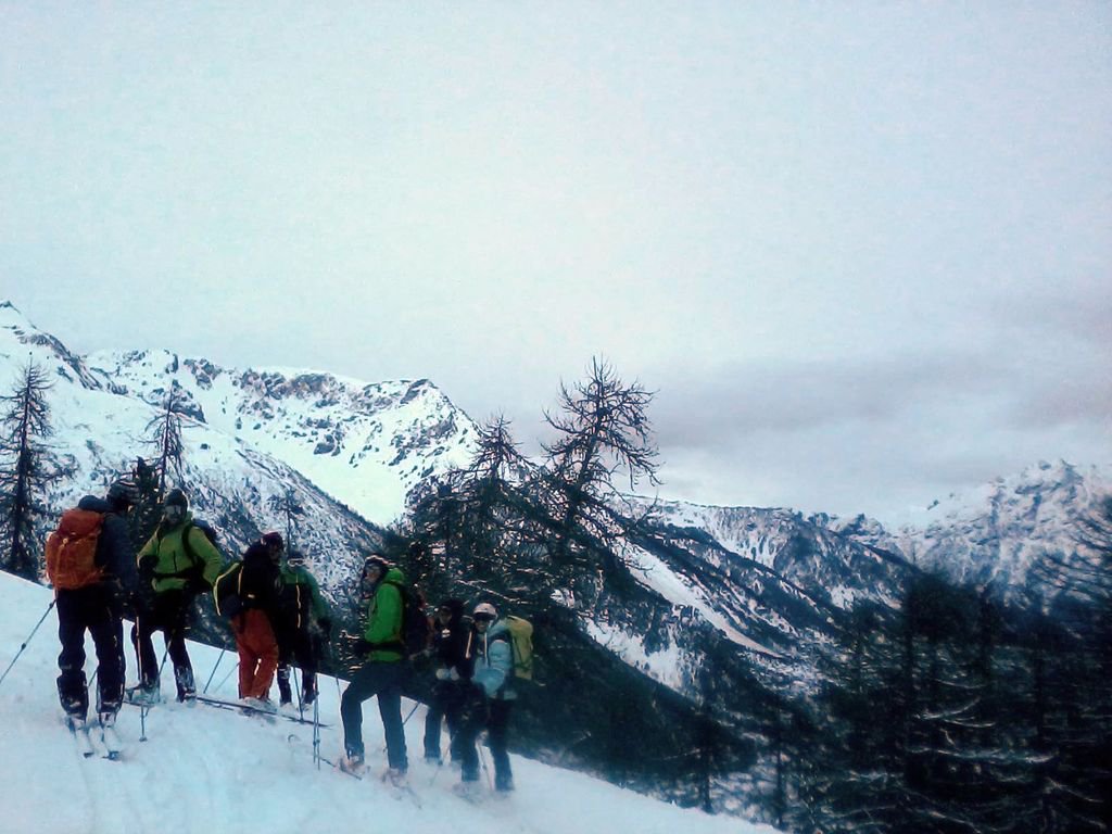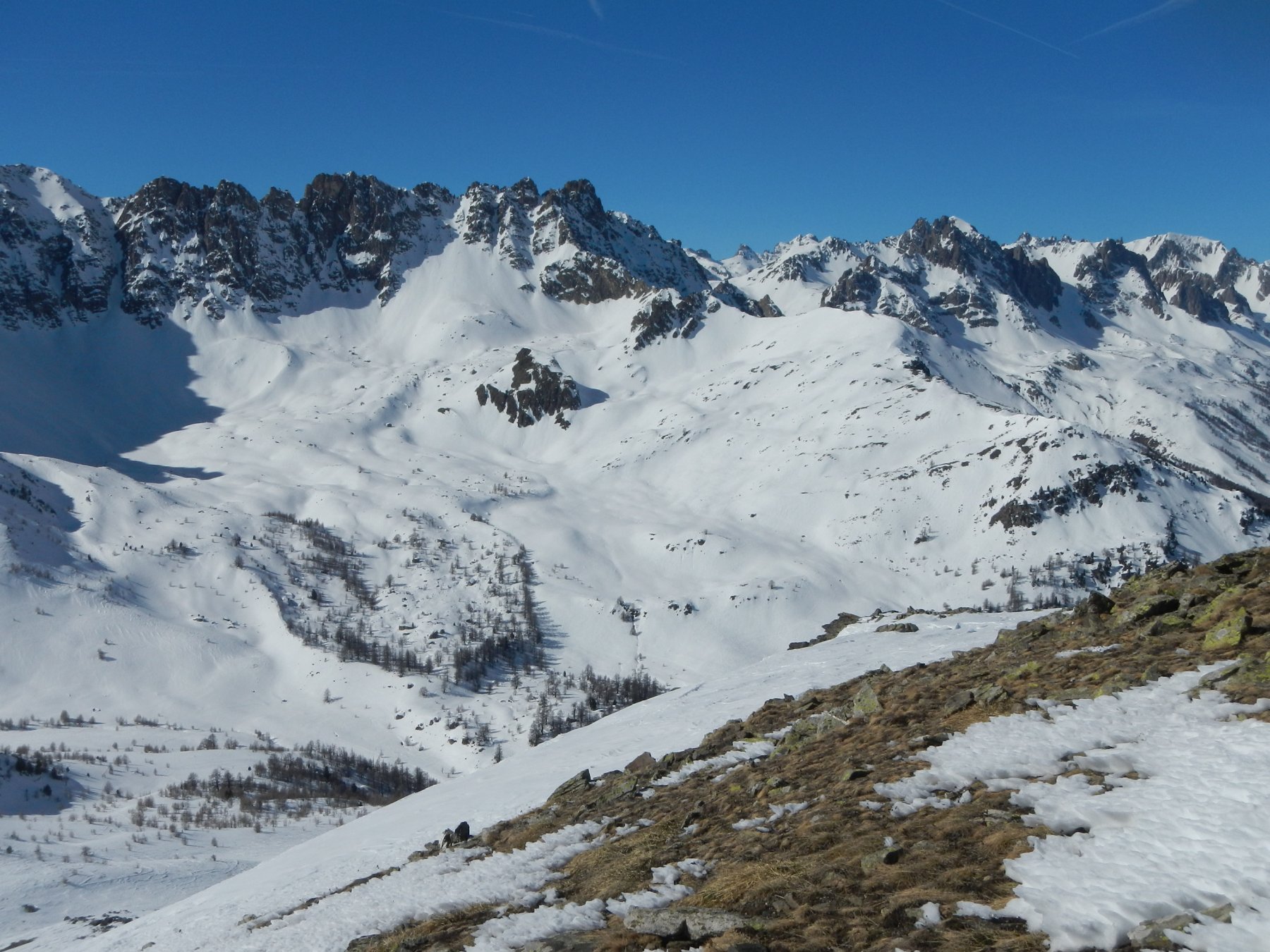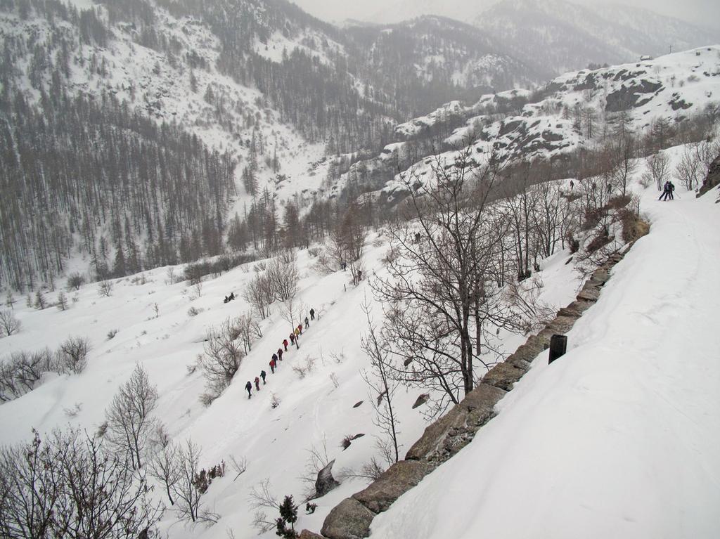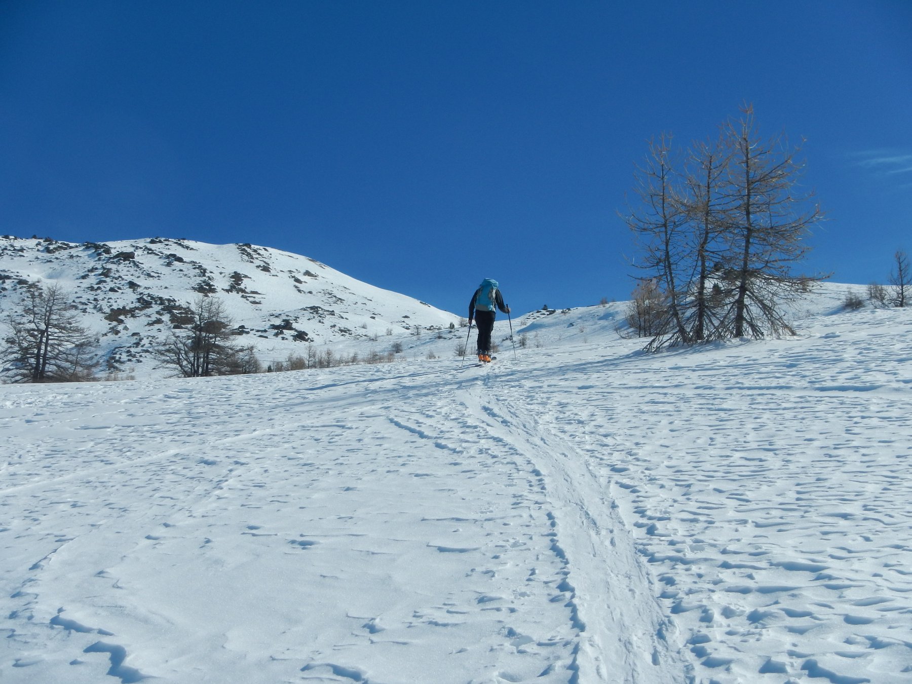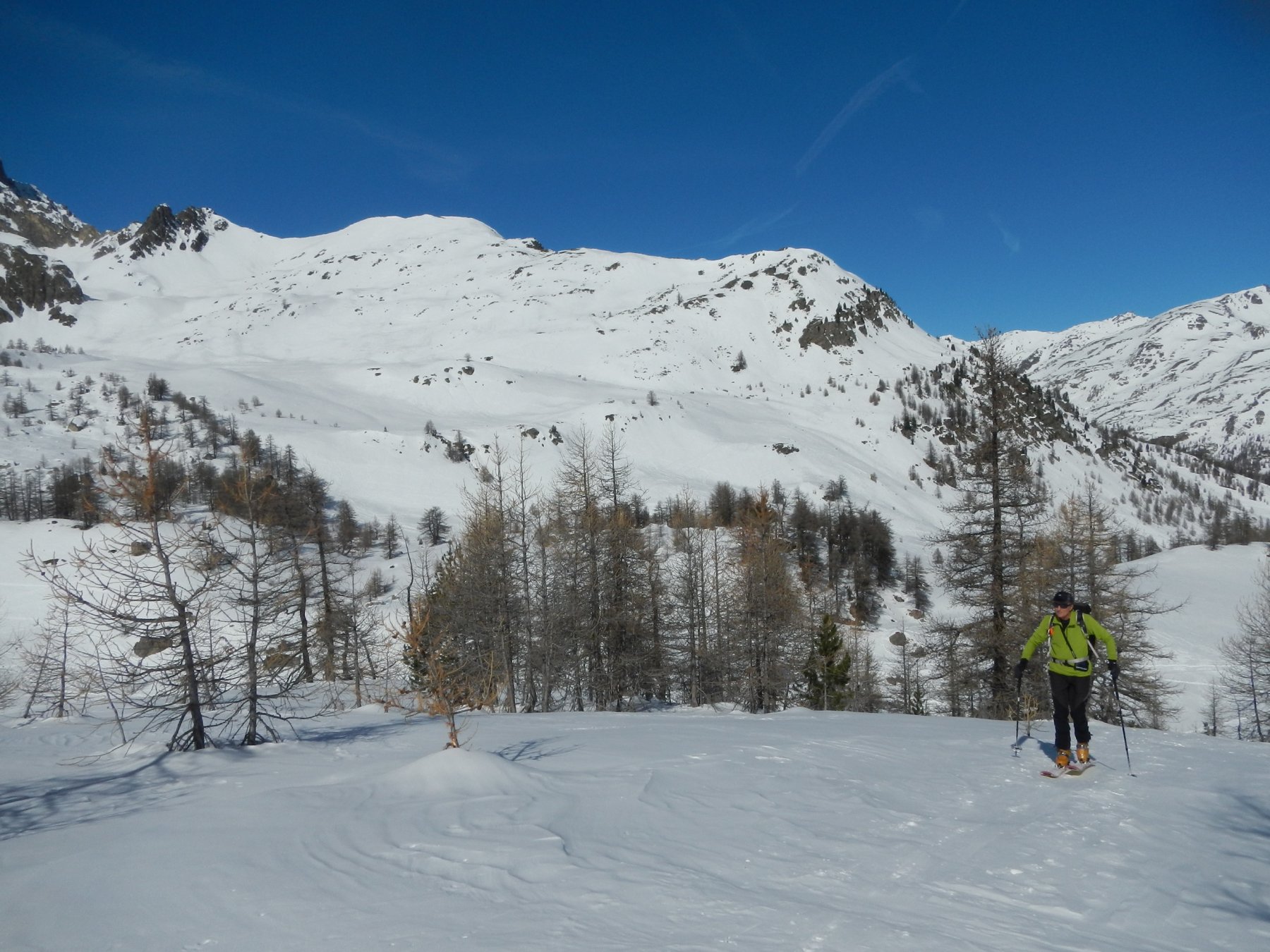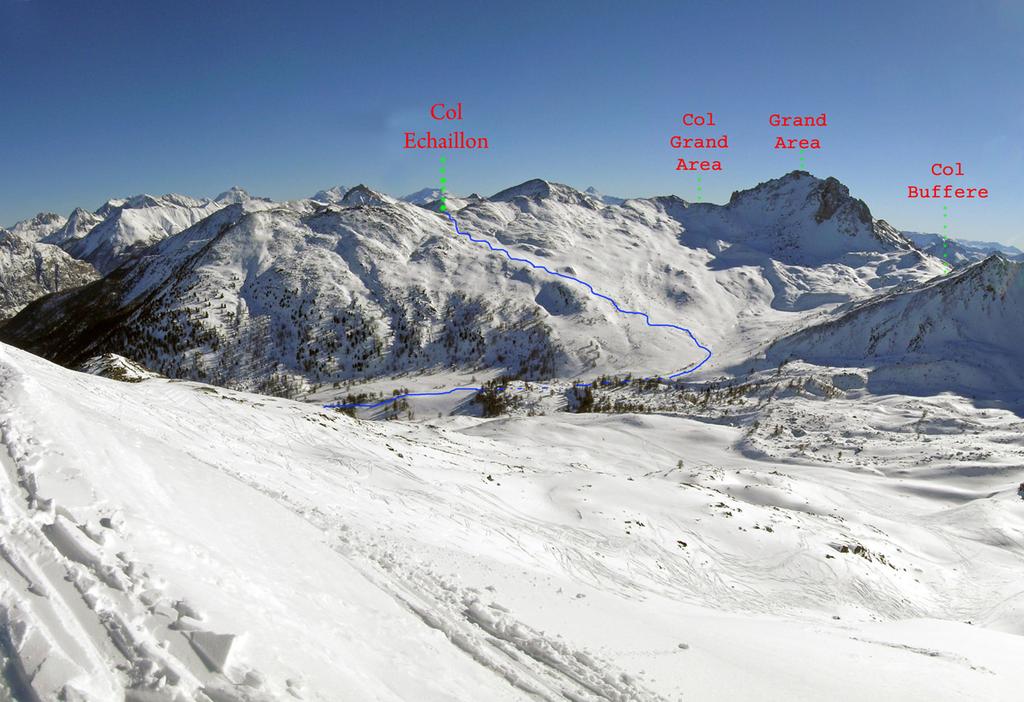 Di qui si prosegue nell’0monimo vallone per deviare poi a sx in direzione di un evidente colle, per ampi pebdii in moderata pendenza. Dal Colle si prosegue per cresta con gli sci fino alla cima, se l’innevamento lo consente.