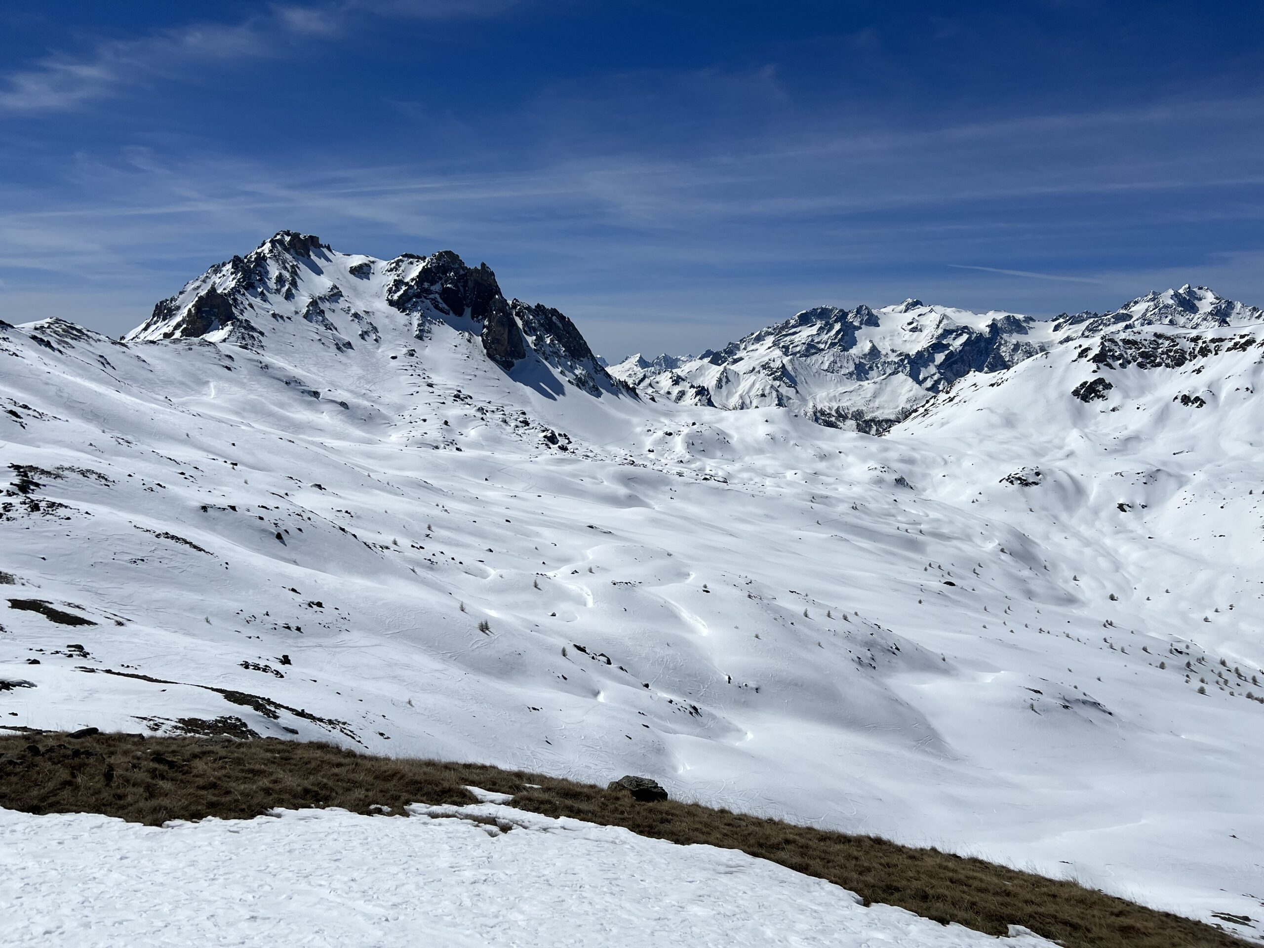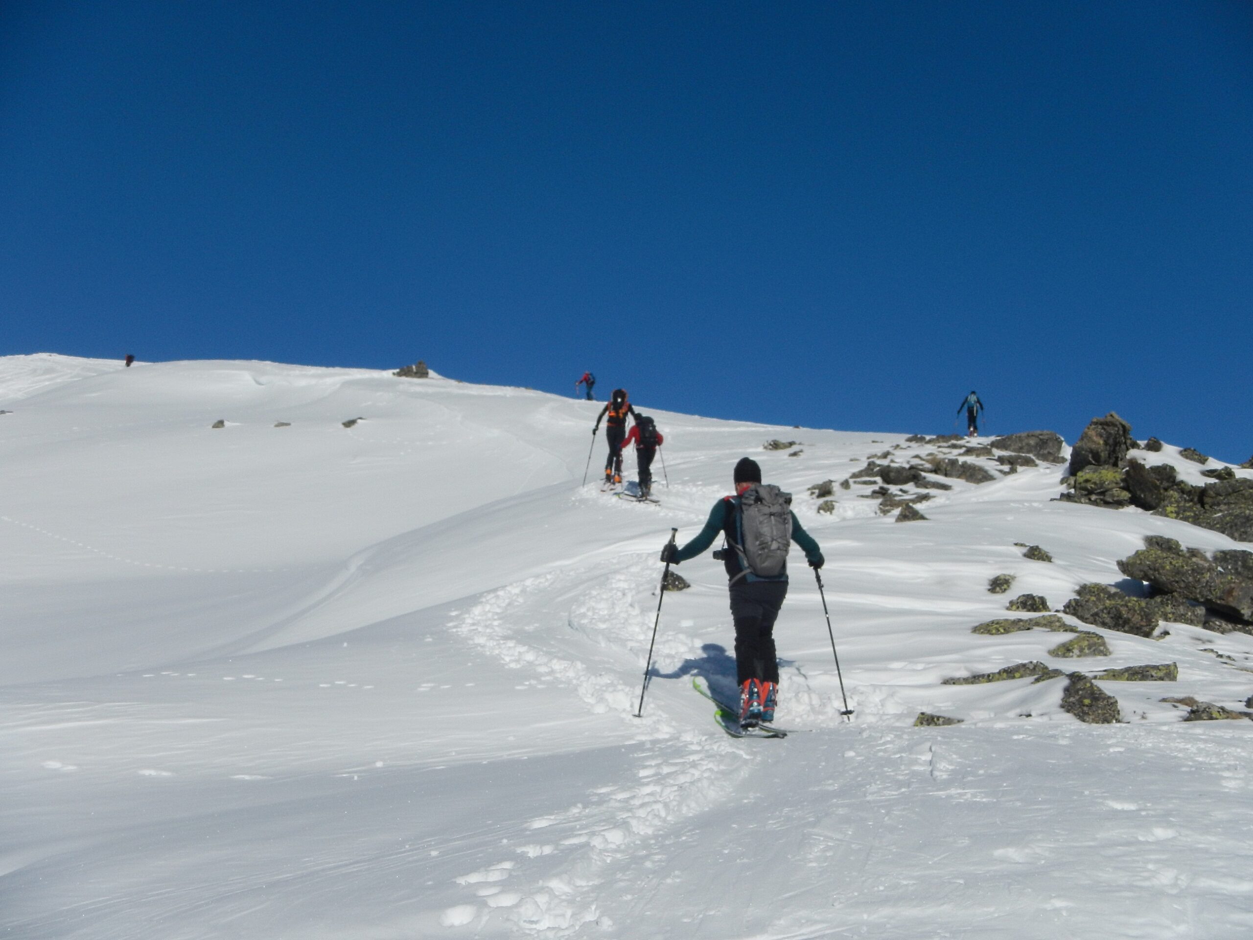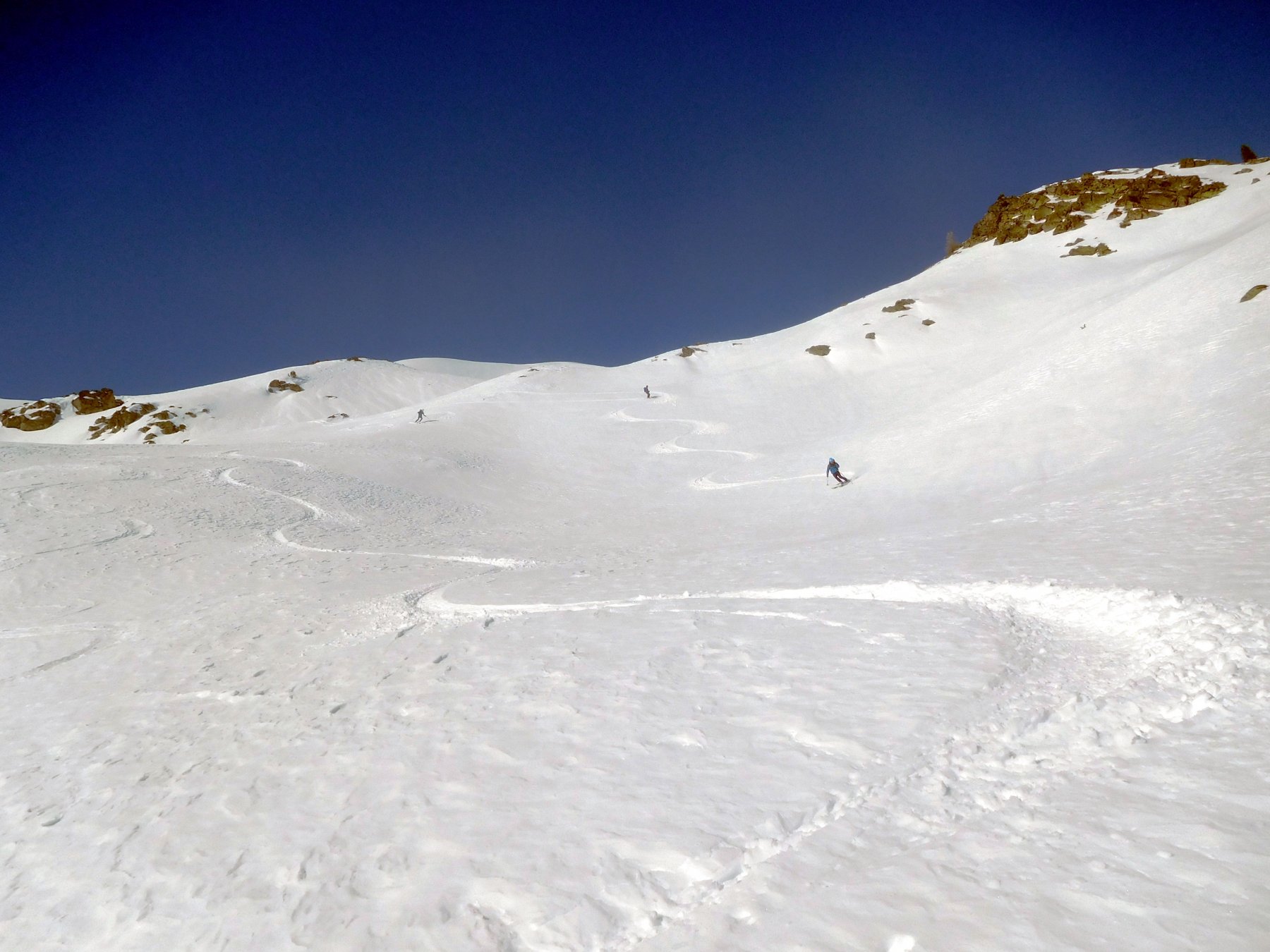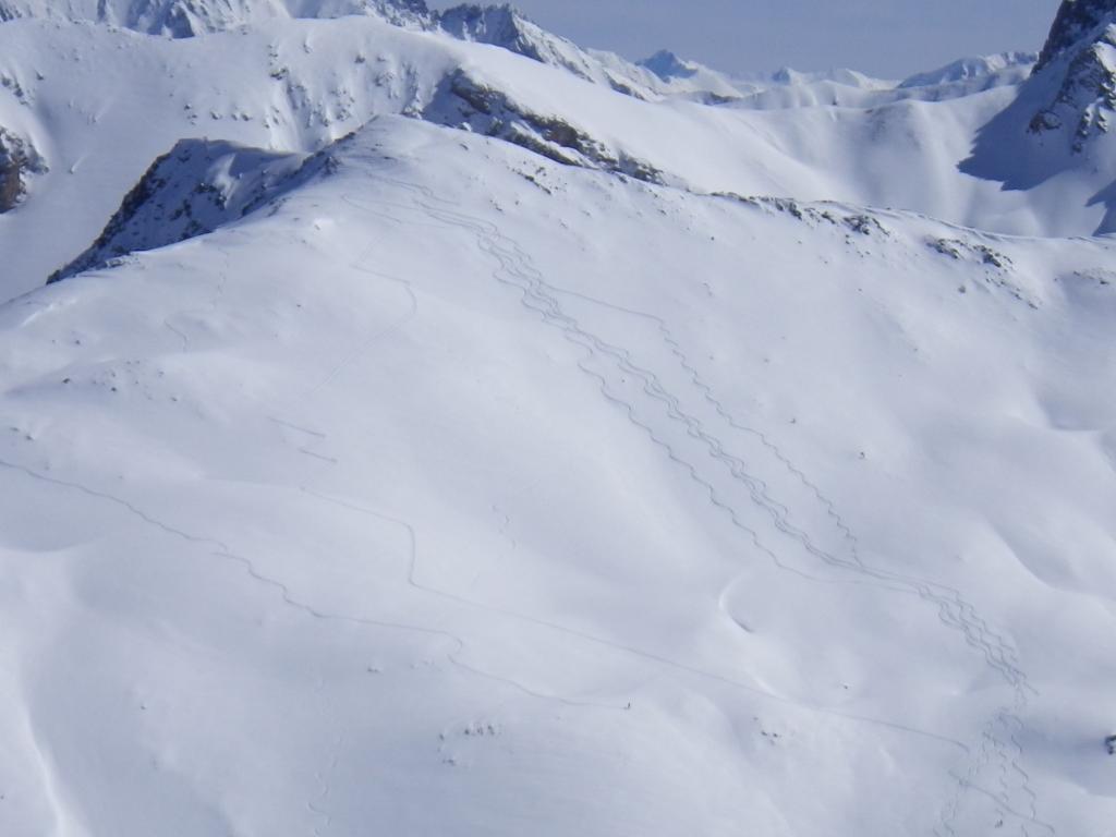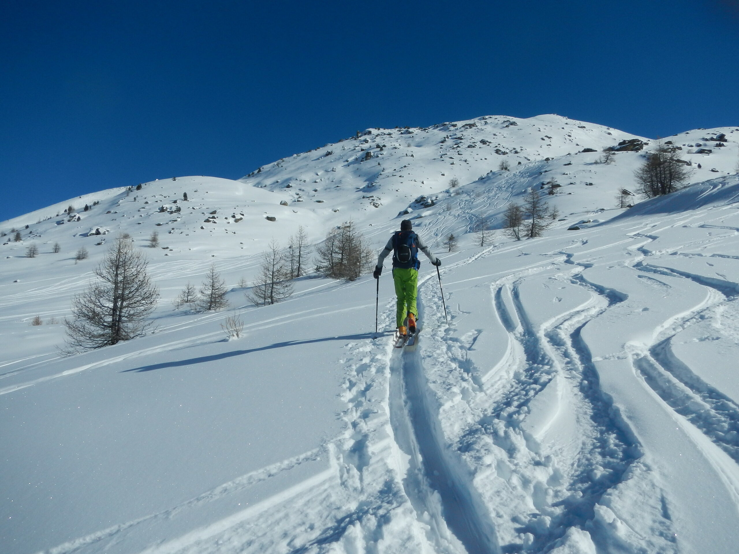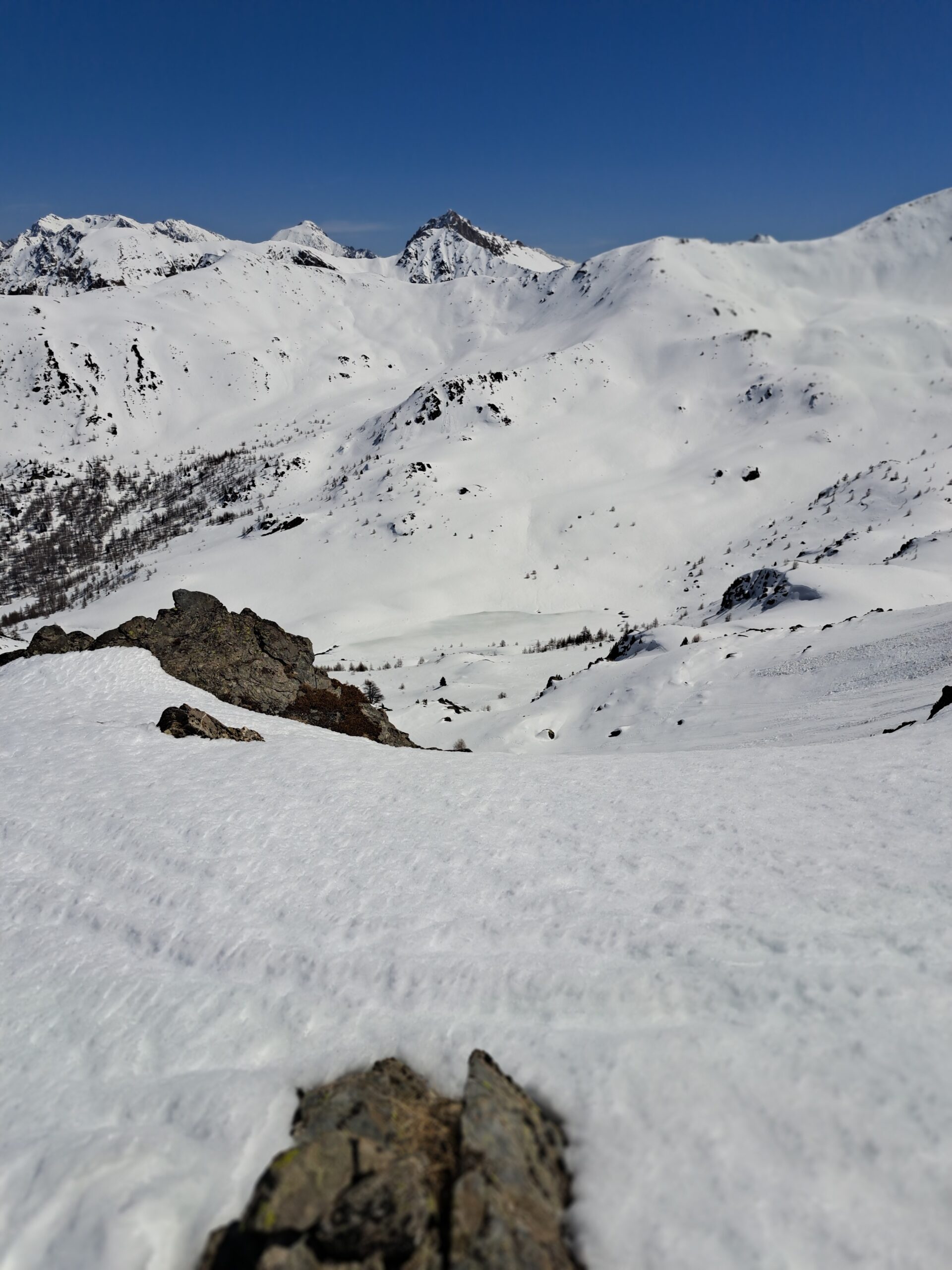 Di qui si prosegue nell’0monimo vallone per deviare poi a sx in direzione di un evidente colle, per ampi pebdii in moderata pendenza. Dal Colle si prosegue per cresta con gli sci fino alla cima, se l’innevamento lo consente.