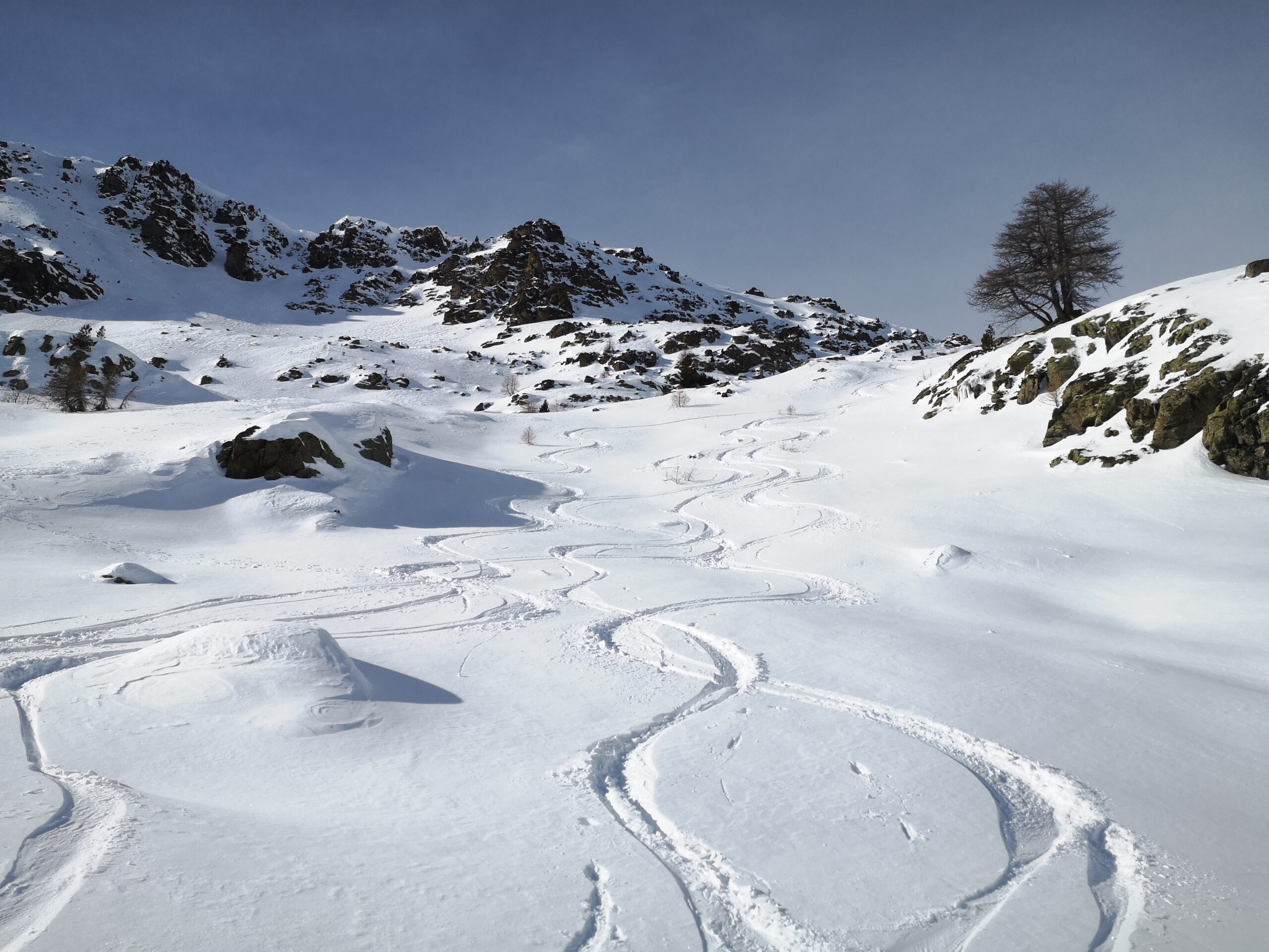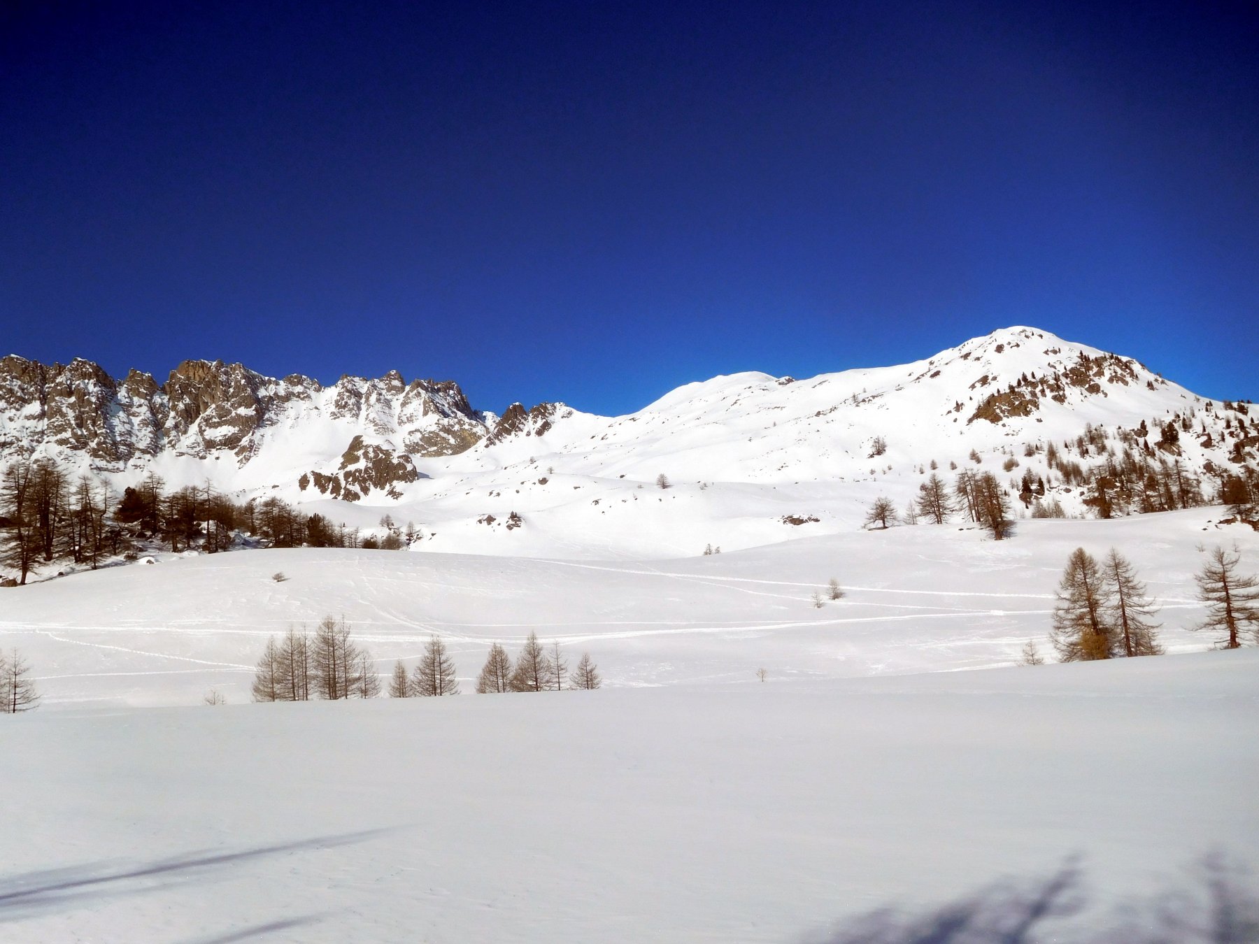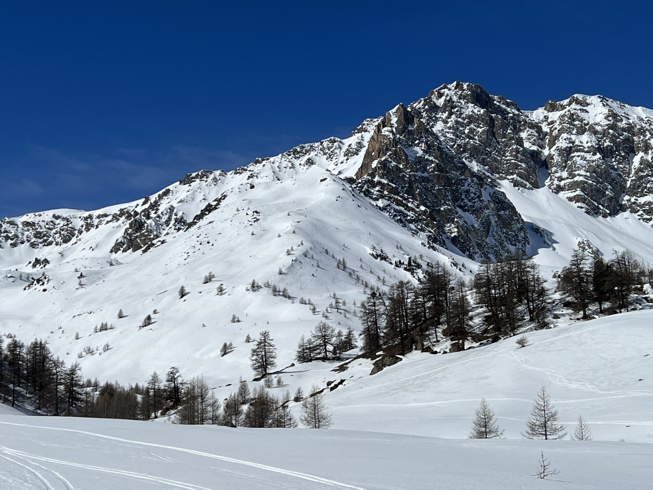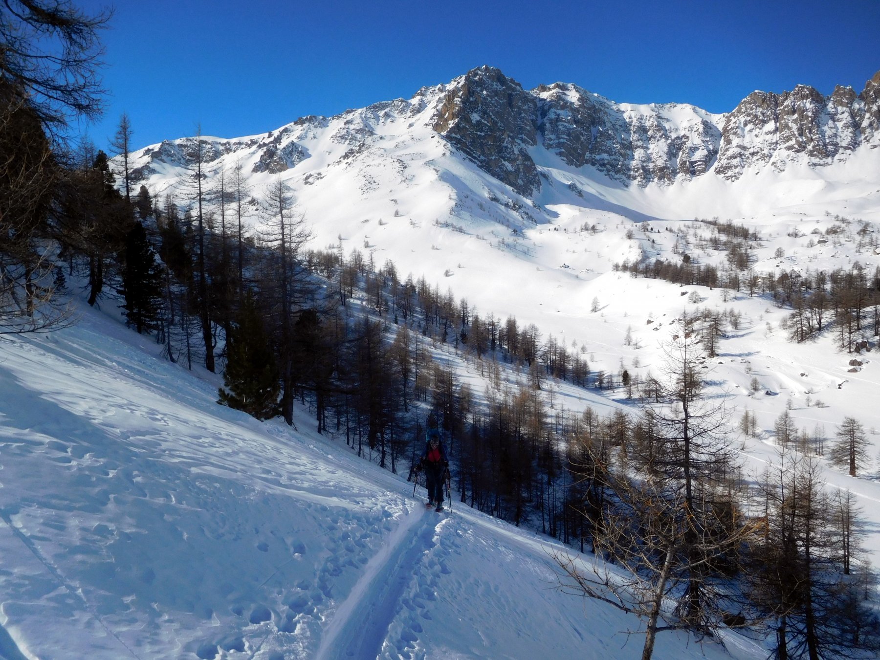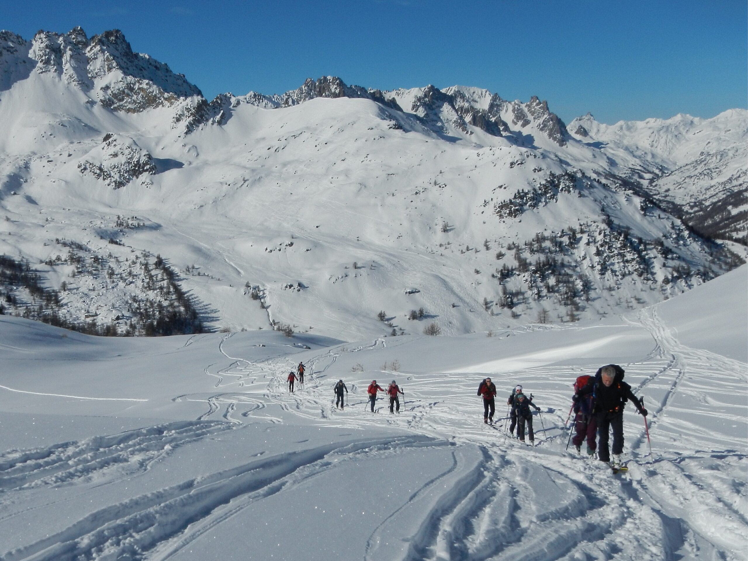Di qui si prosegue nell’0monimo vallone per deviare poi a sx in direzione di un evidente colle, per ampi pebdii in moderata pendenza. Dal Colle si prosegue per cresta con gli sci fino alla cima, se l’innevamento lo consente.