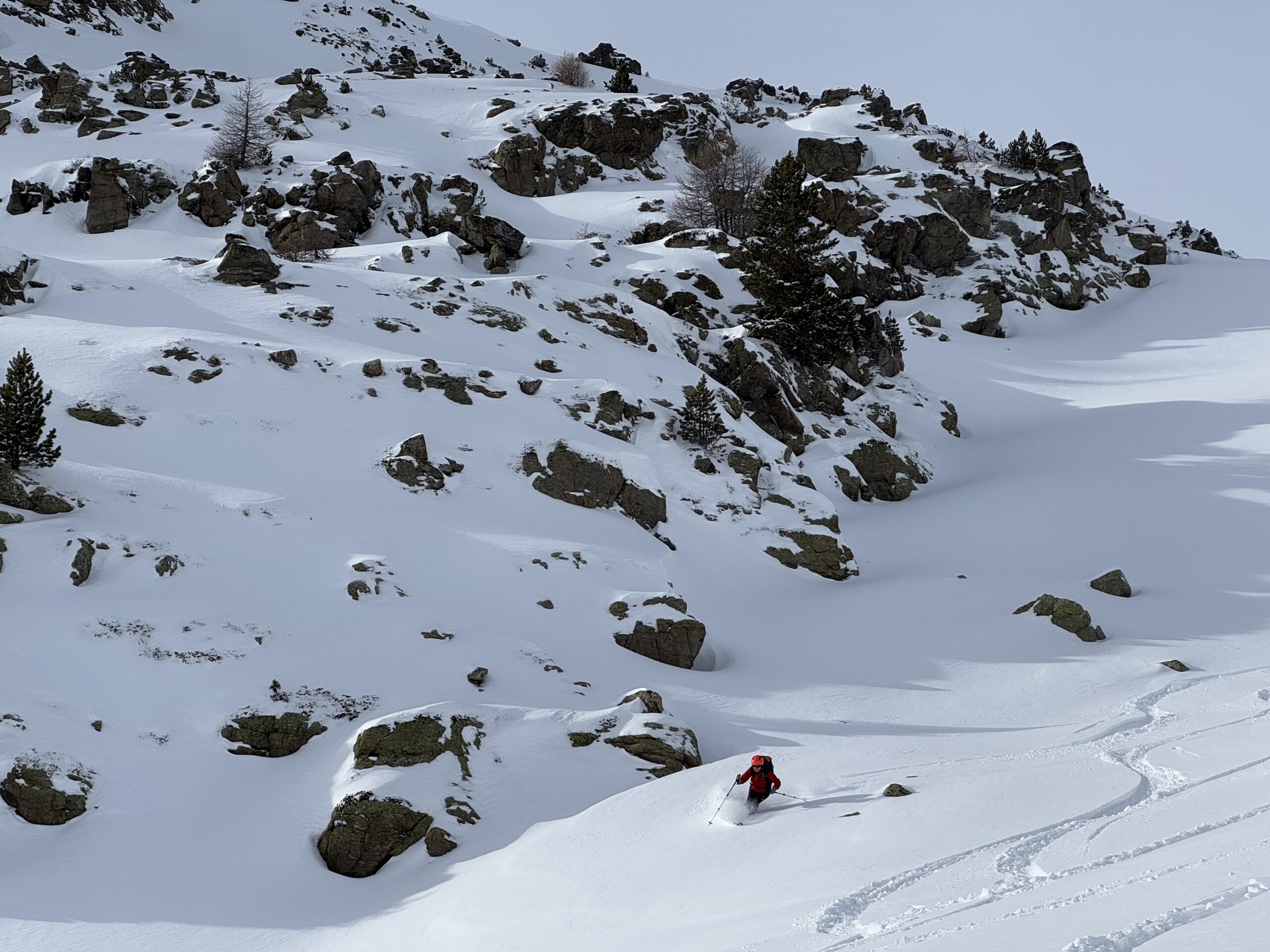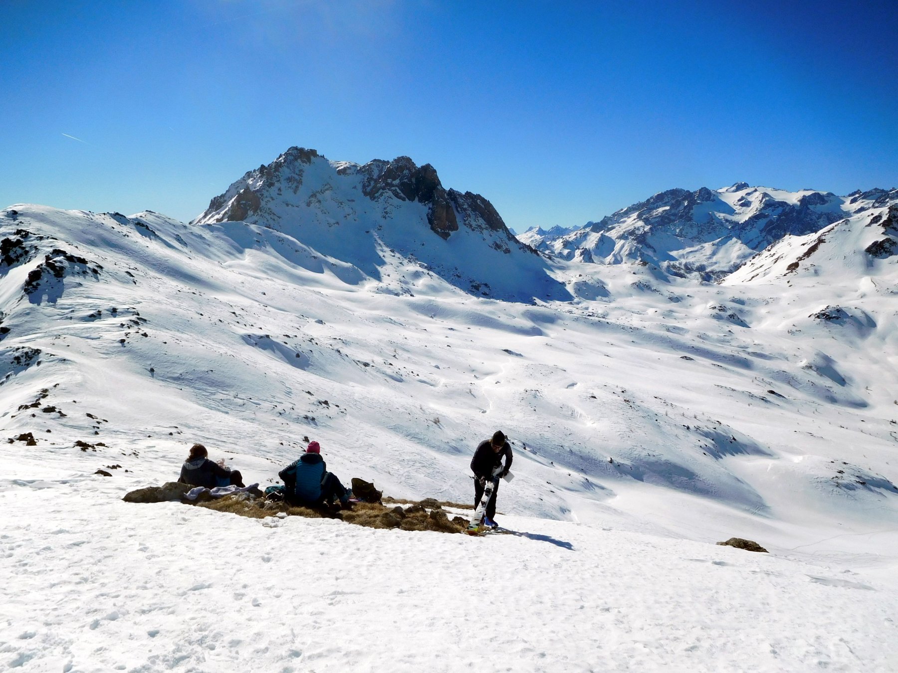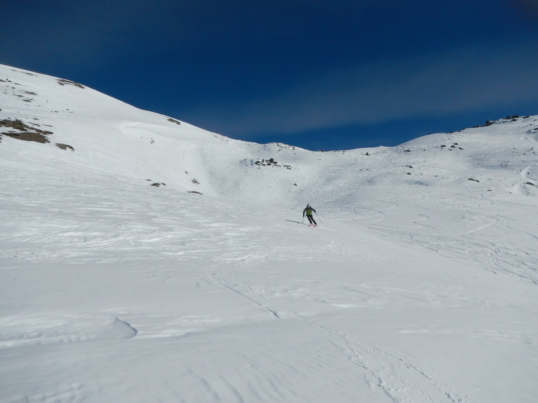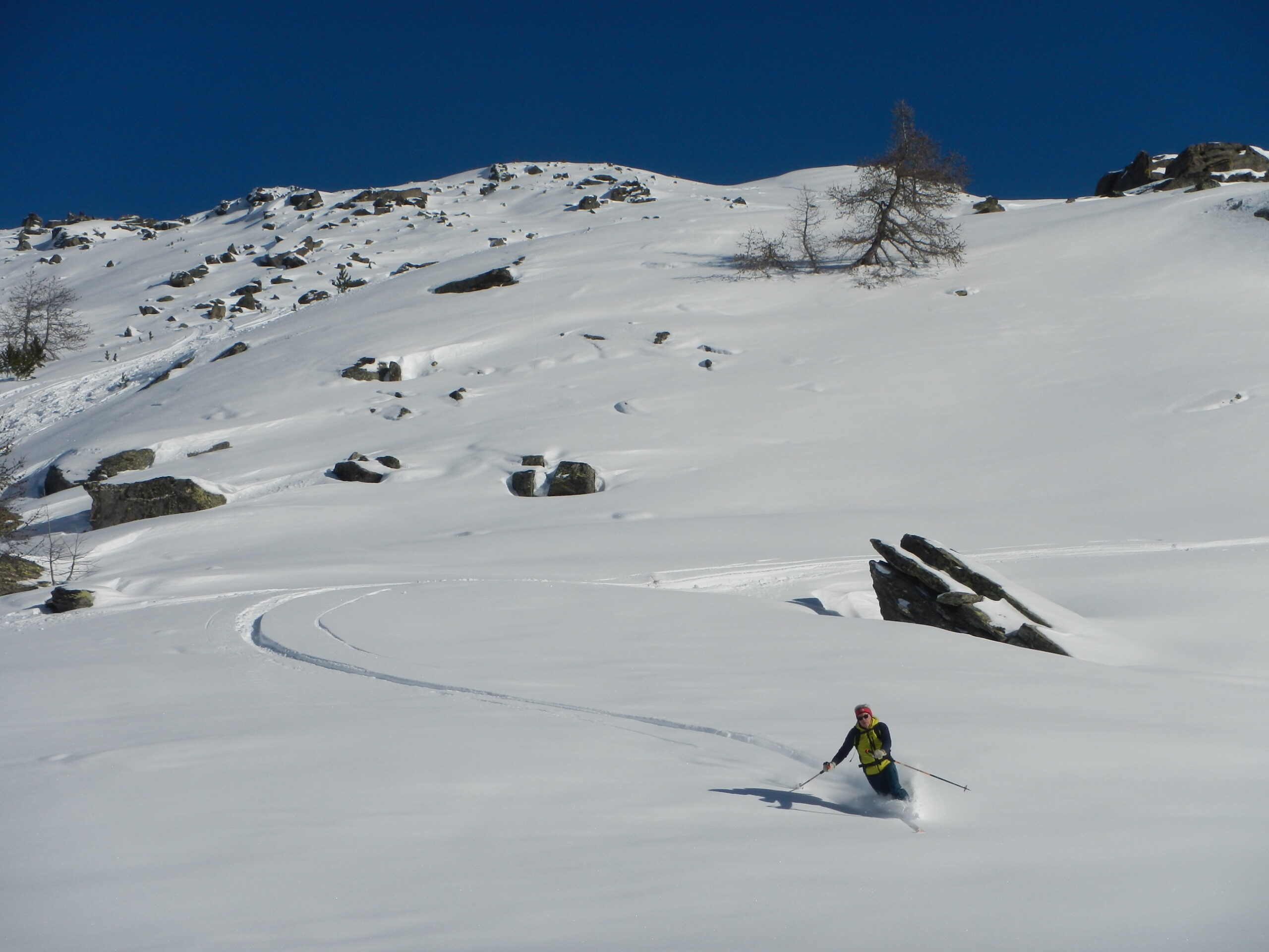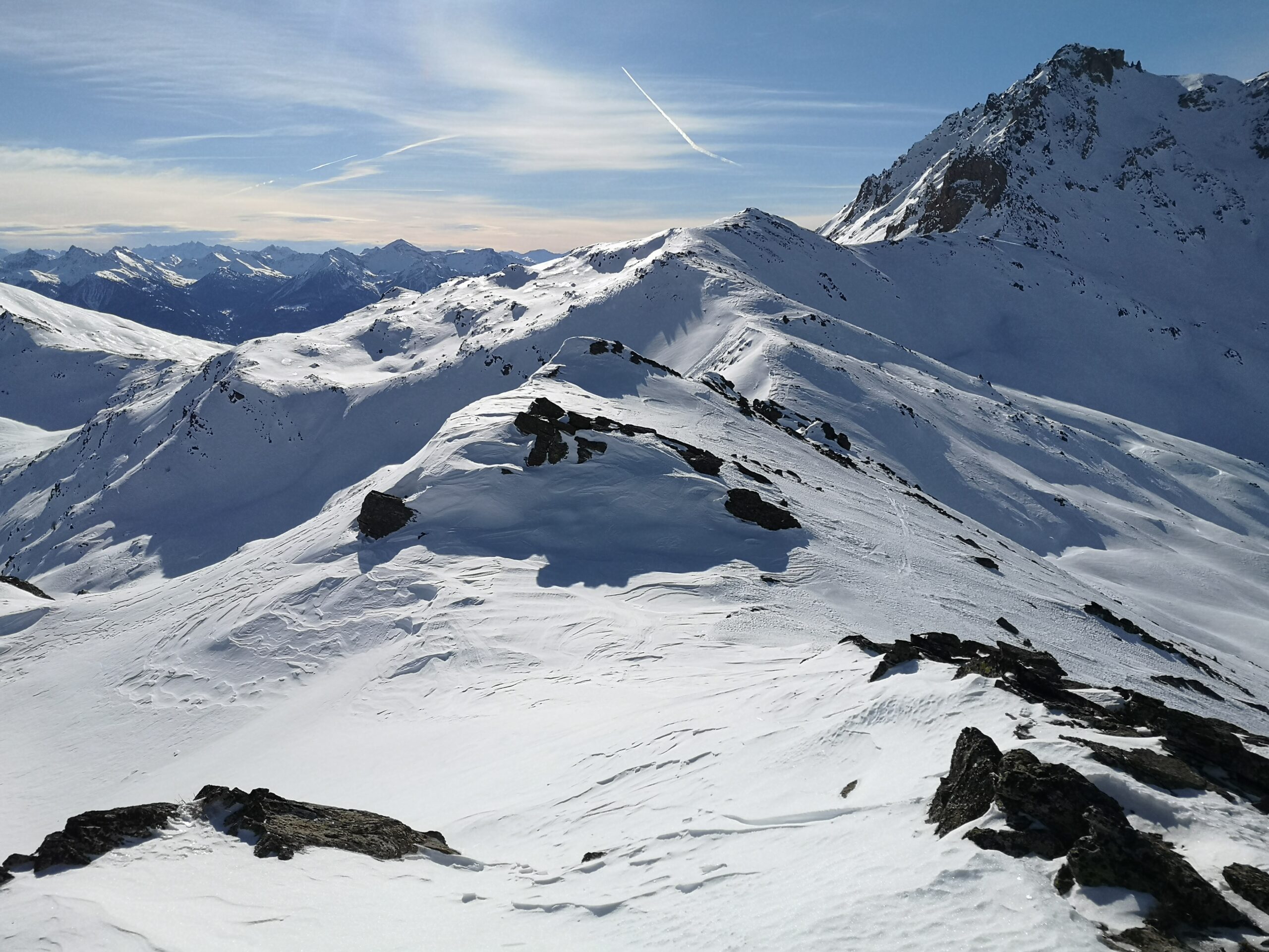 Di qui si prosegue nell’0monimo vallone per deviare poi a sx in direzione di un evidente colle, per ampi pebdii in moderata pendenza. Dal Colle si prosegue per cresta con gli sci fino alla cima, se l’innevamento lo consente.