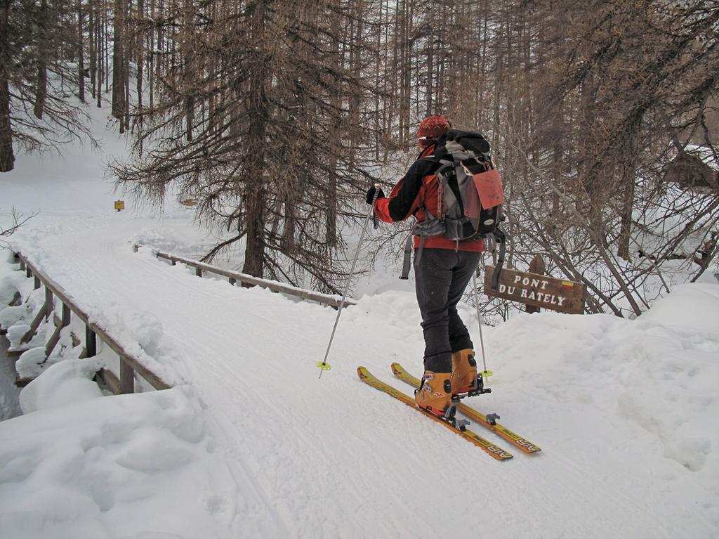 Ottima omelette con lardons al rifugio, poi discesa lungo la stradina con un pò di bosco fino al pont du Rately, risalita di 30m poi strada fino a Nevache. Temperatura fresca -10°C alla partenza, -10°C all’arrivo, con un pò di bufera, però.