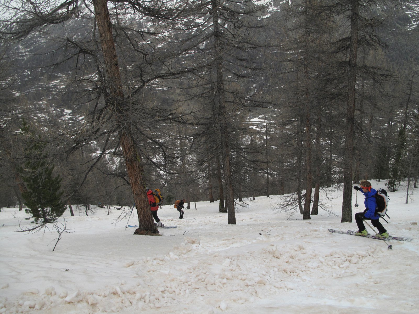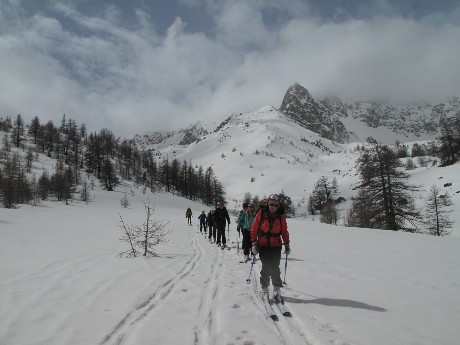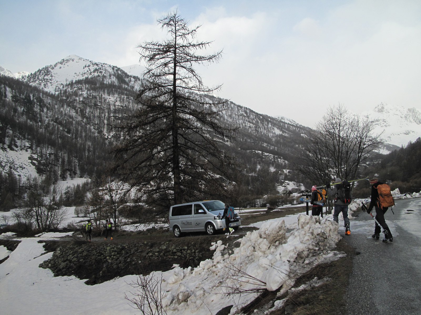 La prima cosa importante (piacevole sorpresa) è che la strada è aperta fino a oltre gli chalet di Lacou, quindi per il vallone di Buffere il portage è nullo. La seconda cosa che il meteo incerto fino all’ultimo, ha tenuto e ci ha regalato anche un po’ di sole. Bella visione sul vallone di Cristol. Negli ultimi 250m di salita 10-15cm di neve fresca. Discesa polentosa fino al rifugio, poi bella nel bosco, mai troppo ripido sulla neve vecchia e abbastanza assestata.