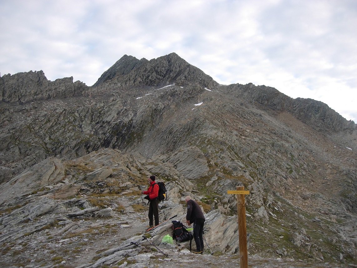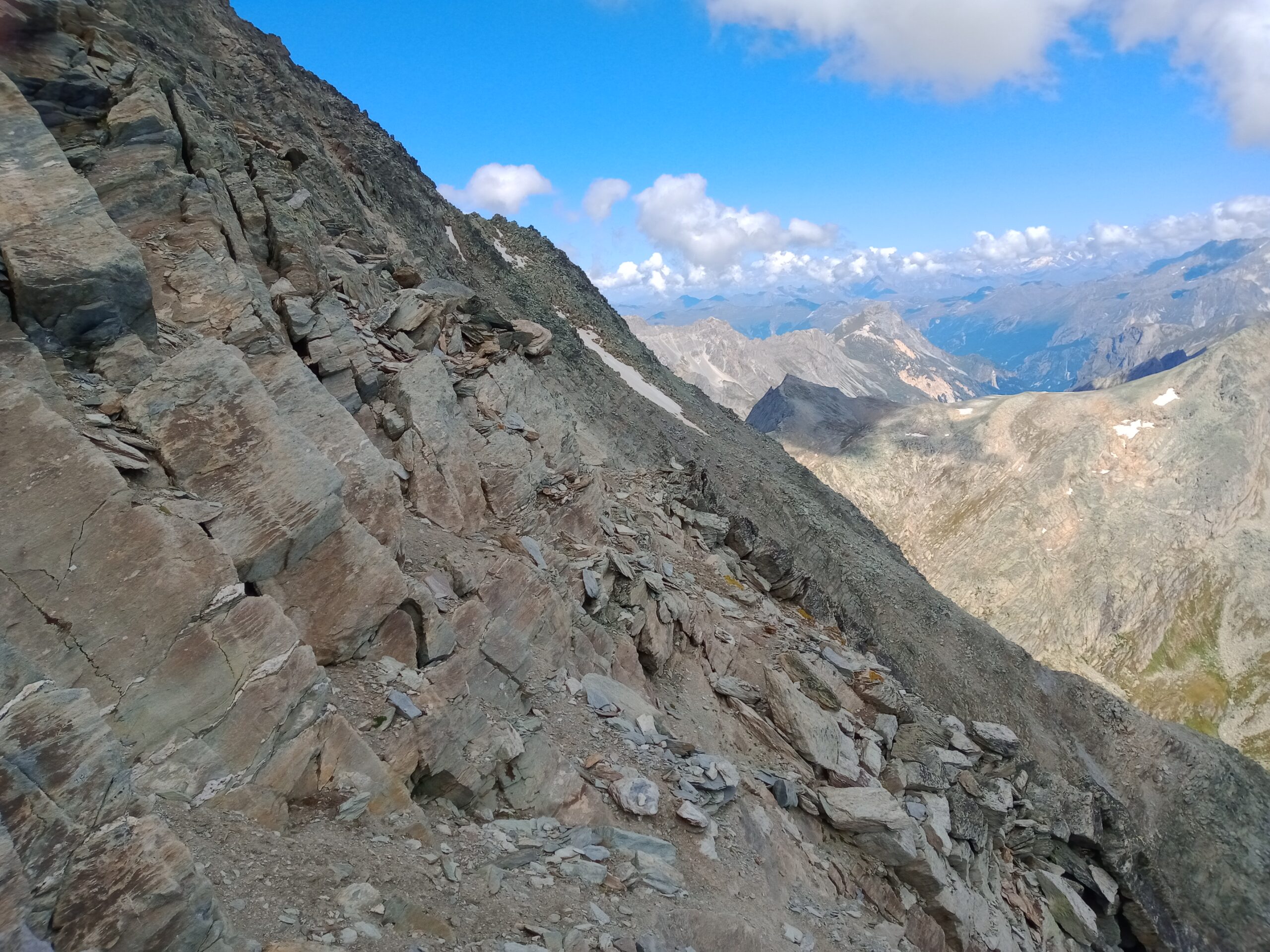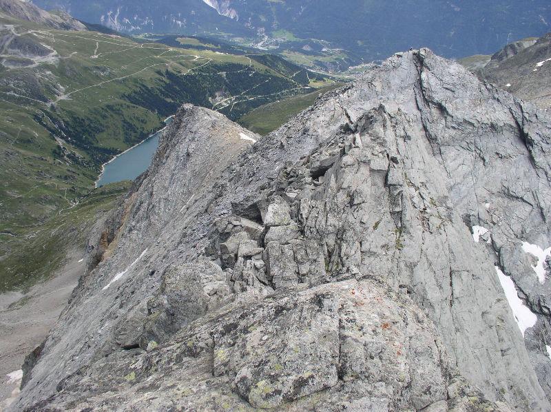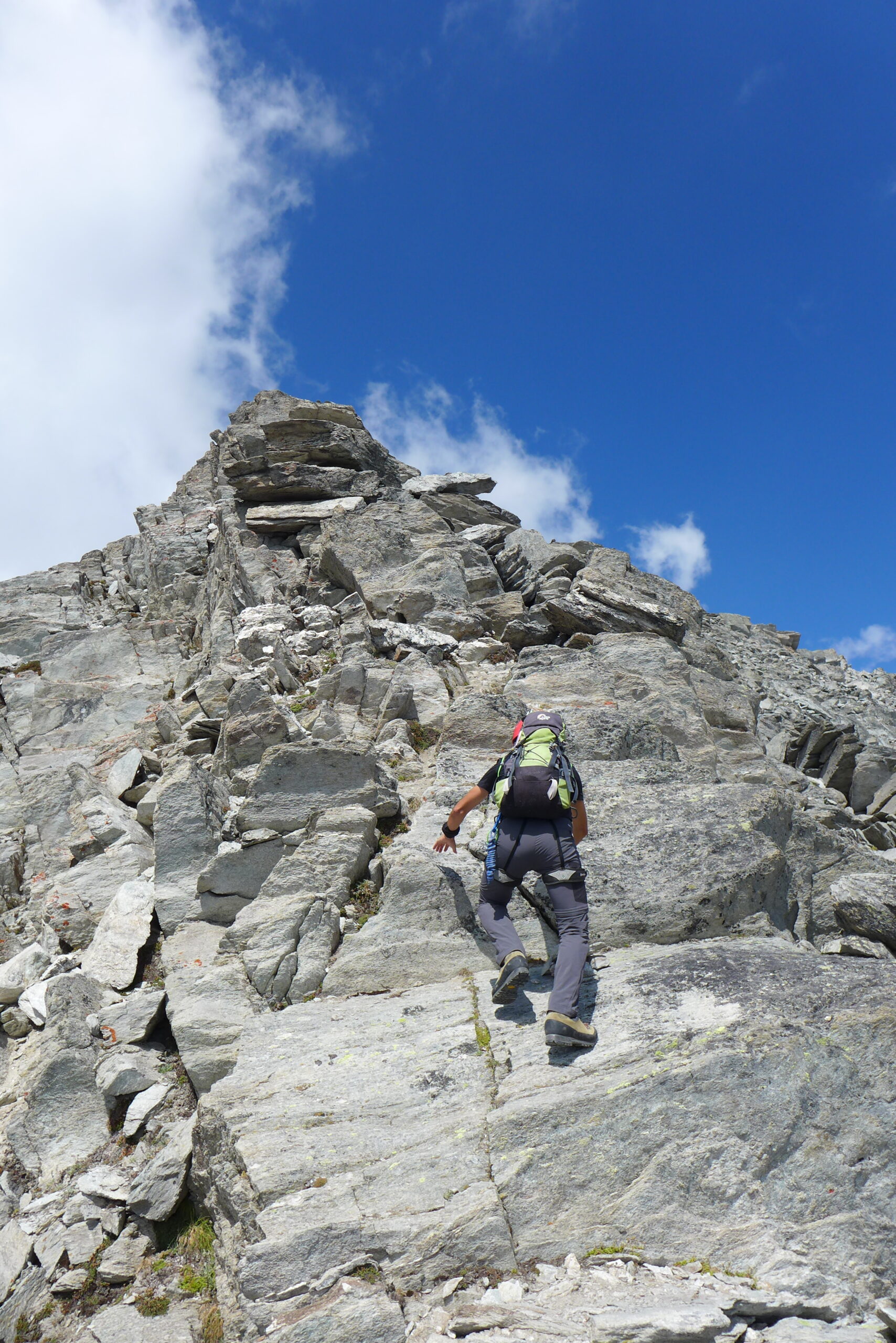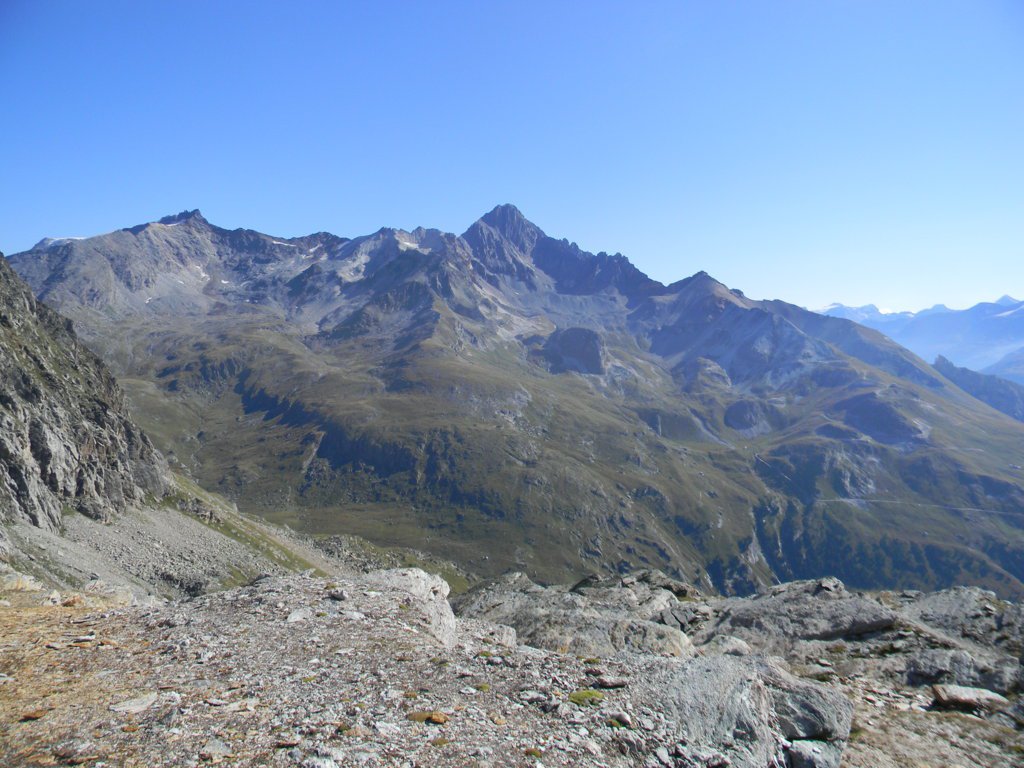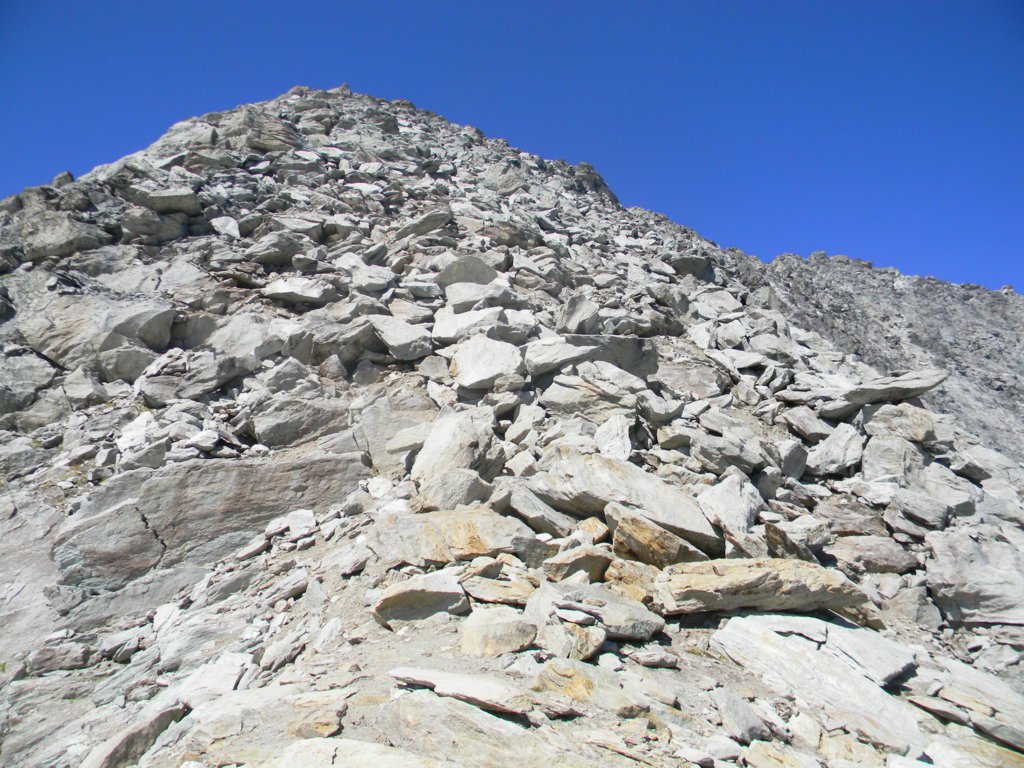 In prossimità del colle si stacca sulla destra una traccia (ometti) che risale una morena che va ad esaurirsi al colletto posto a destra del Grand Roc. Si risale sulla sinistra per tracce e massi la cresta e si raggiunge la cima del Grand Roc (3316 mt.).
