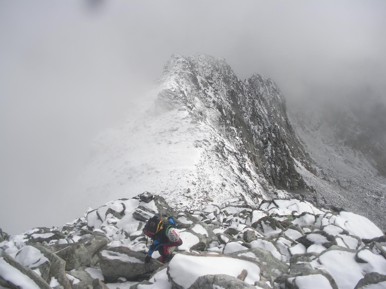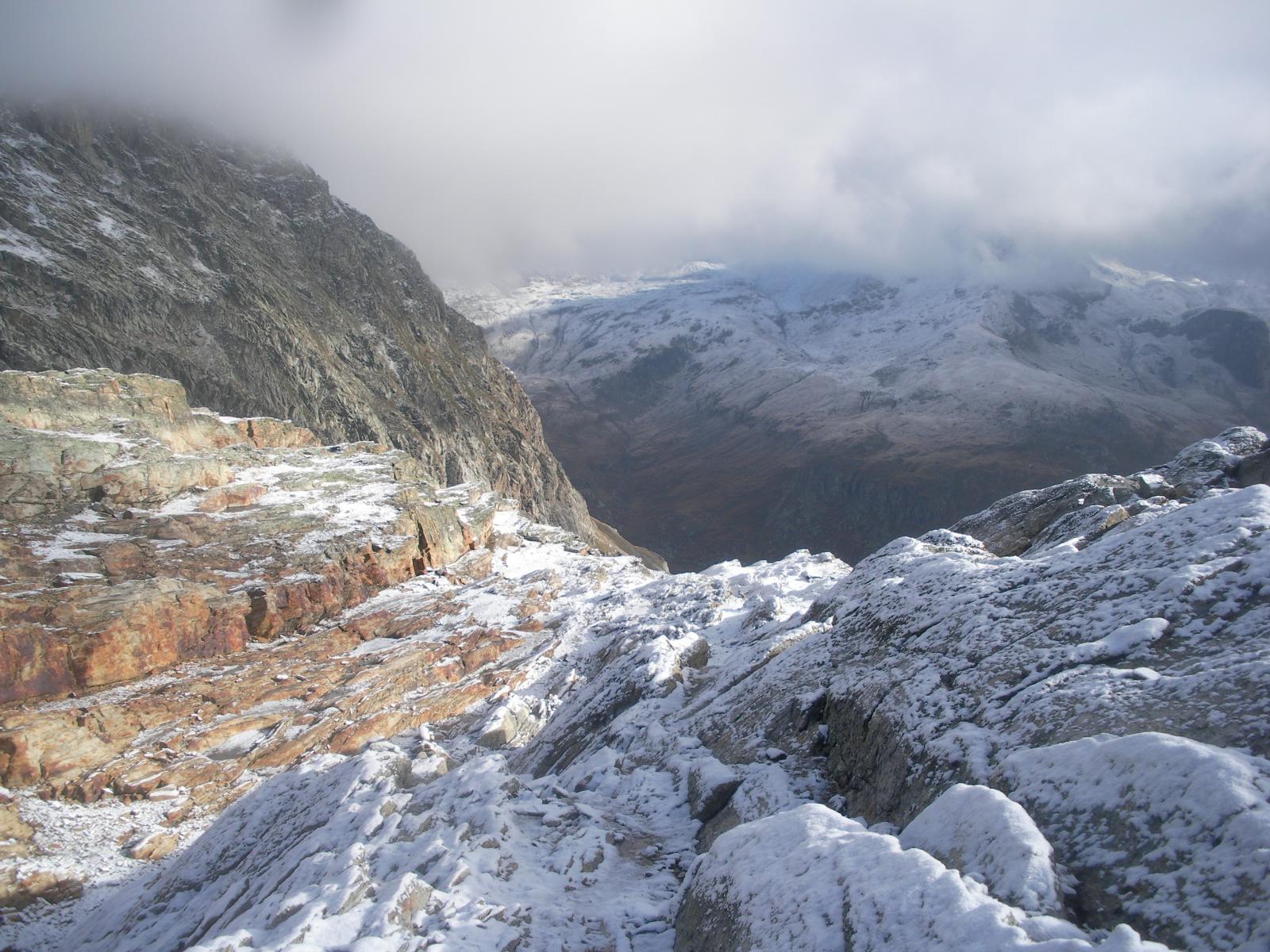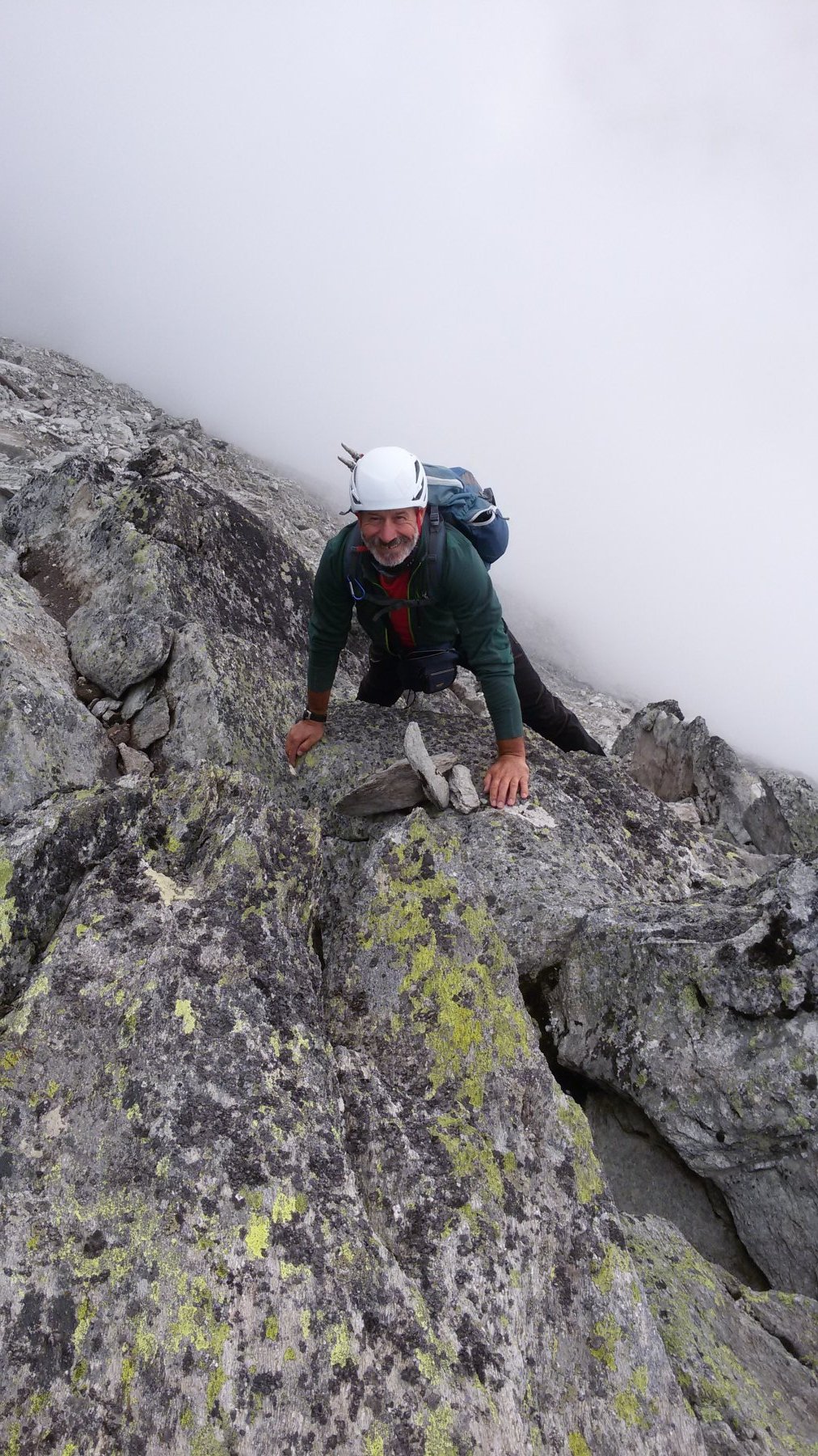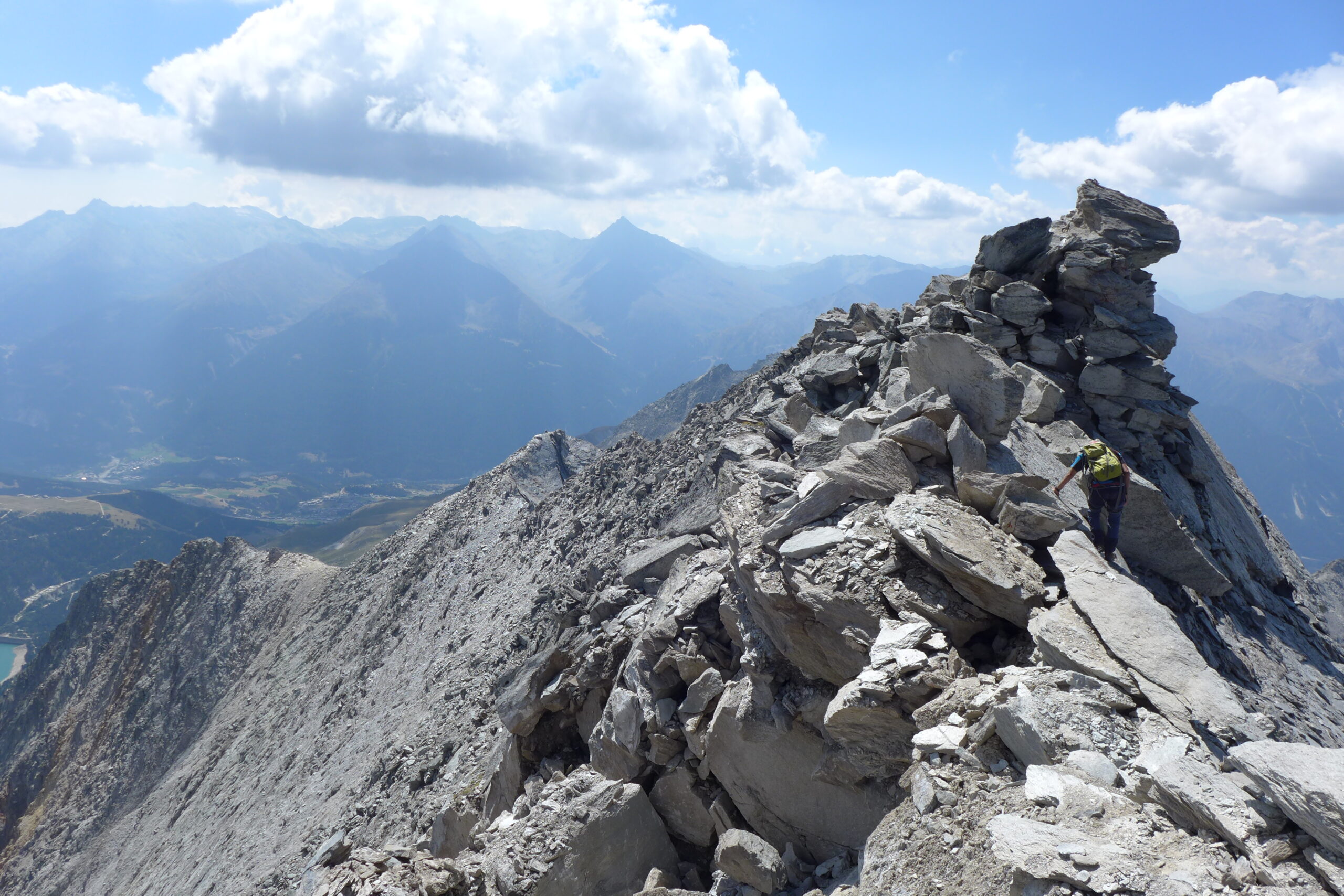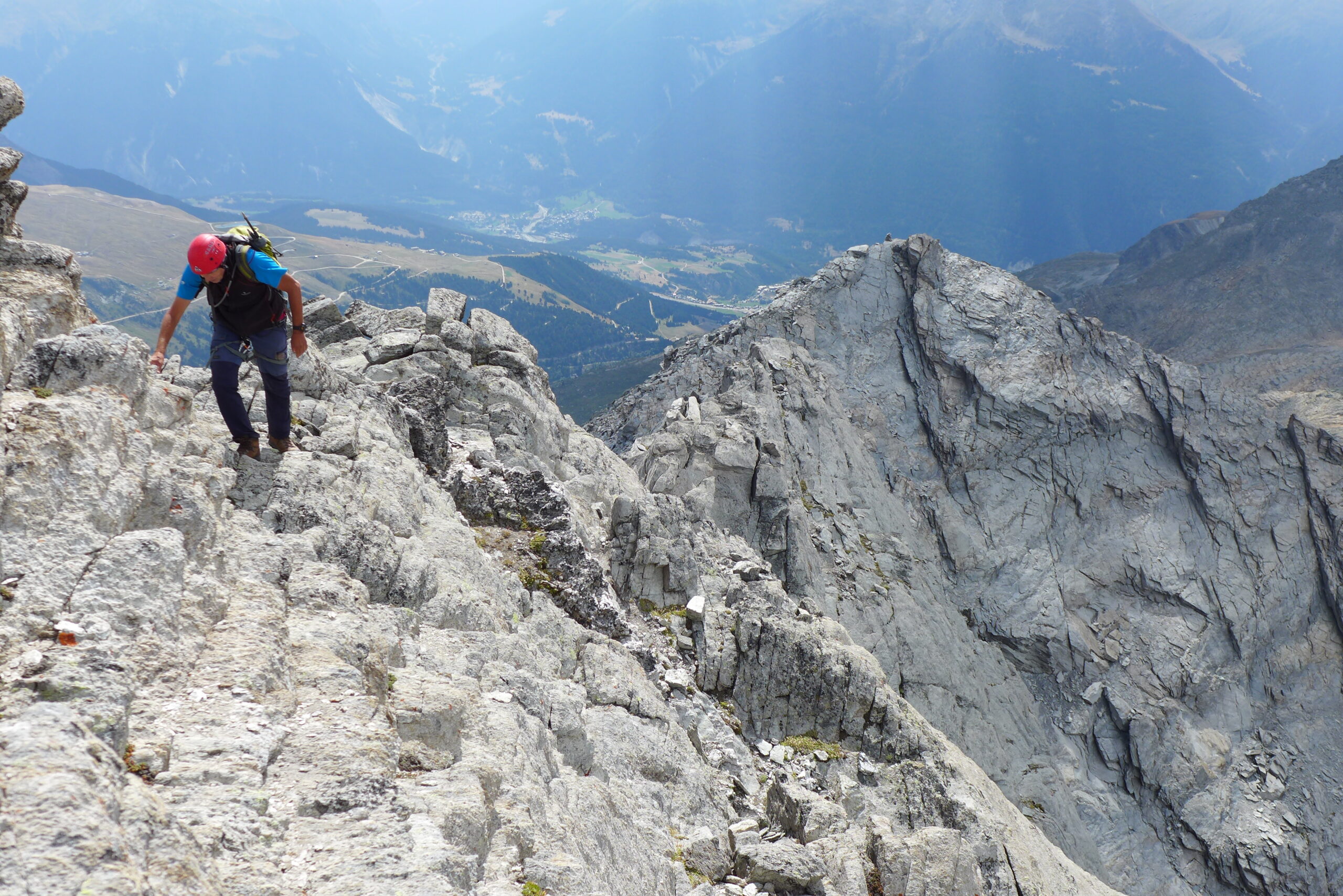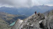 La cresta si fa più aerea e la si risale prevalentemente sul suo filo, aggirando le asperità sulle cenge a destra. Panorama di tutto rispetto.