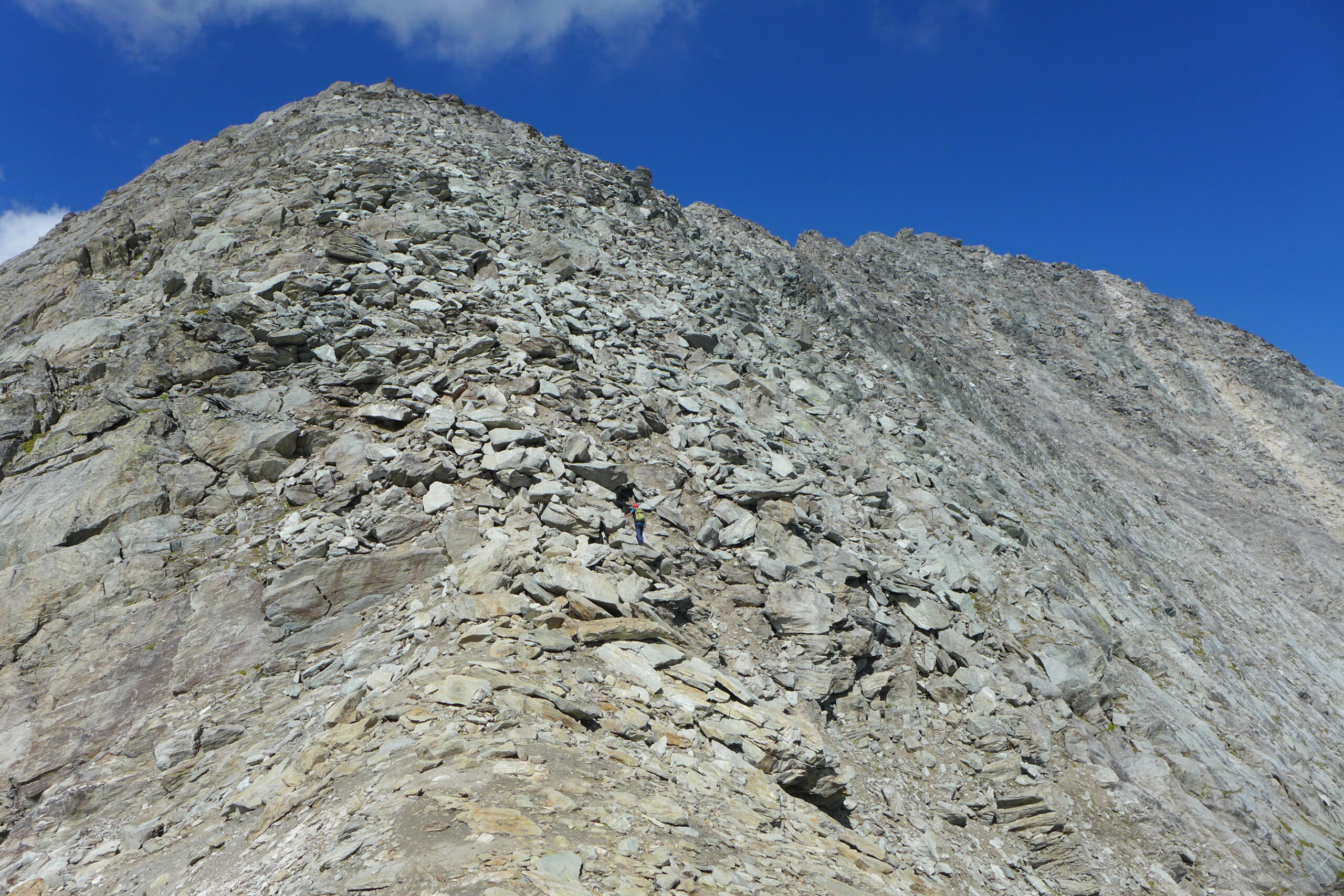 Arrivati al Gran Roc, l’imponenza de l’Echelle fa un certo effetto. Per la salita della cresta occorre inizialmente stare sul filo o appena sotto lato est, sconsiglio di abbassarsi troppo su evidenti cenge, la roccia è pessima. Sul filo o poco sotto la roccia è buona, passaggi max di II grado non eccessivamente esposti. Circa a metà percorso, nei pressi di un torrione ci si sposta sul versante ovest, dove una comoda cengia permette di scavalcarlo e ritornare sul filo. Seguendo alcuni ometti, sempre con passi di semplice arrampicata, si giunge al torrione finale della vetta che si sale aggirandolo lato nord. Oggi ottime condizioni, roccia calda e asciutta, con parecchio grip, percorsa in 45 minuti circa dal Gran Roc. Avevamo con noi la corda che non abbiamo utilizzato (anche in discesa) ma consiglio di averne con se almeno uno spezzone da 20 mt. Al ritorno, nei pressi del colle delle Masse salito anche la cima La Masse, con evidente ometto sulla cima.