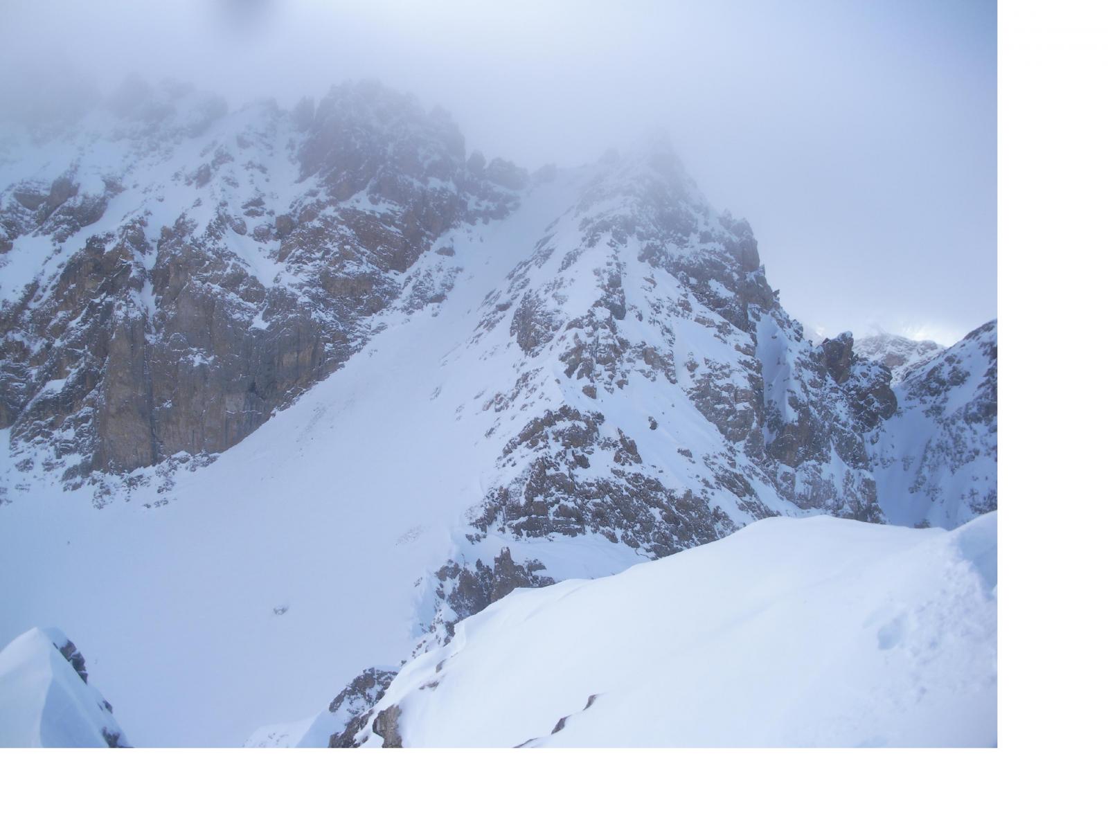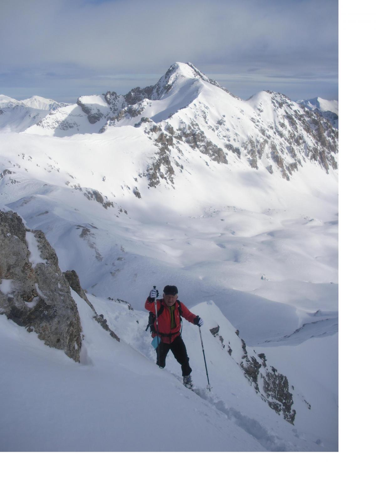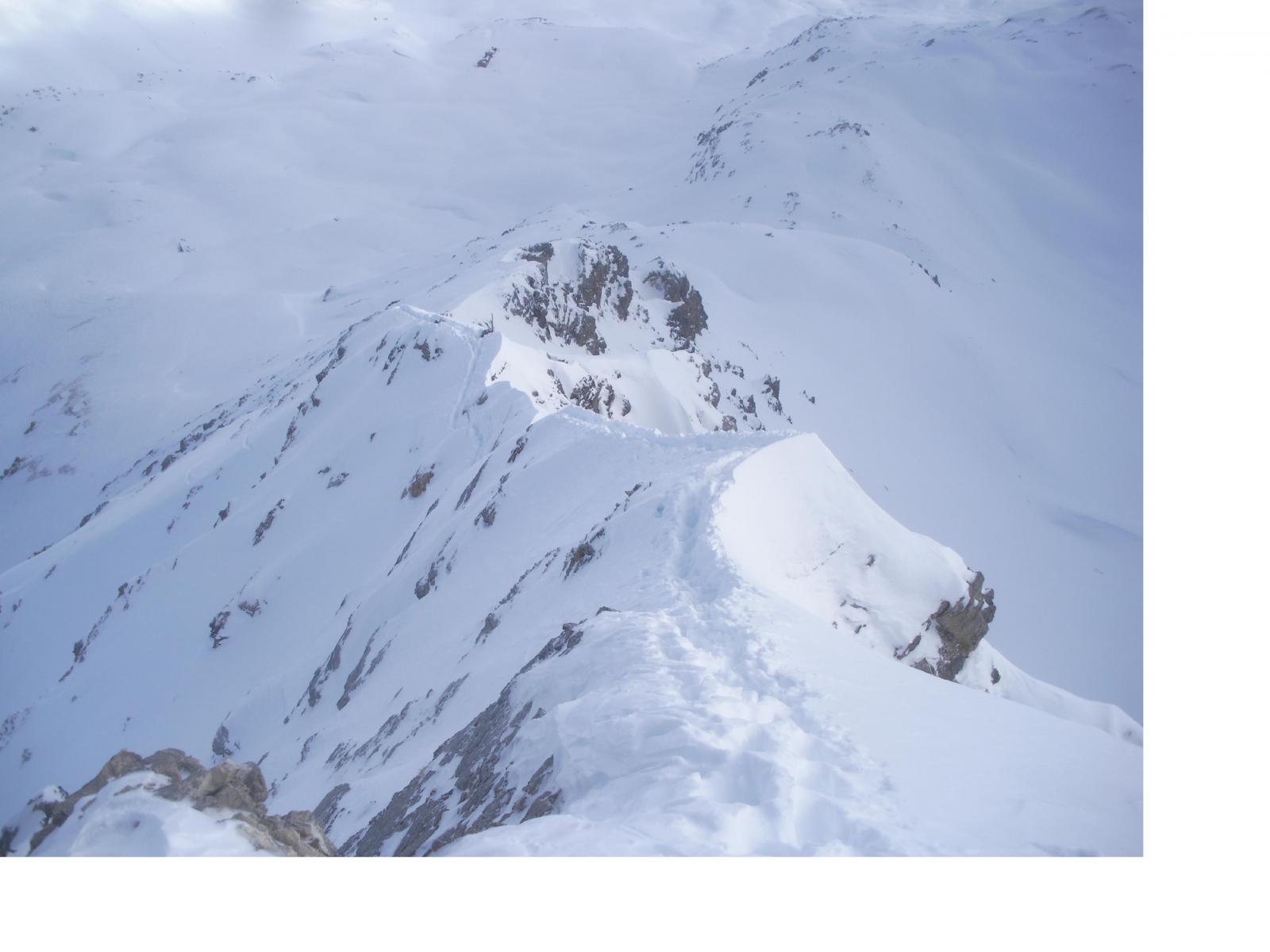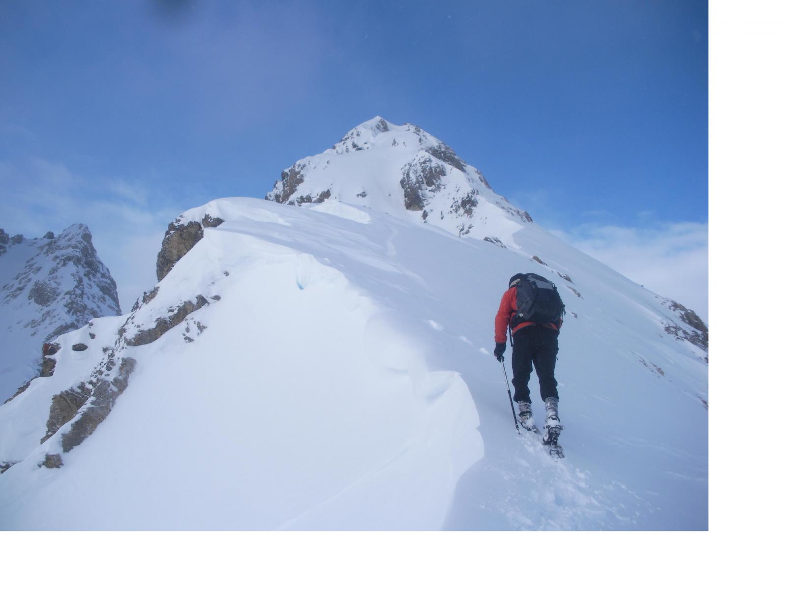 Poco prima del passo, prendere gli ampi pendii sulla dx,sinistra orografica,piuttosto ripidi che portano all’inizio della cresta est del monte Eco. Si portano gli sci fino che la cresta diventa di misto.Si prosegue per crestine affilate e tratti di roccette.