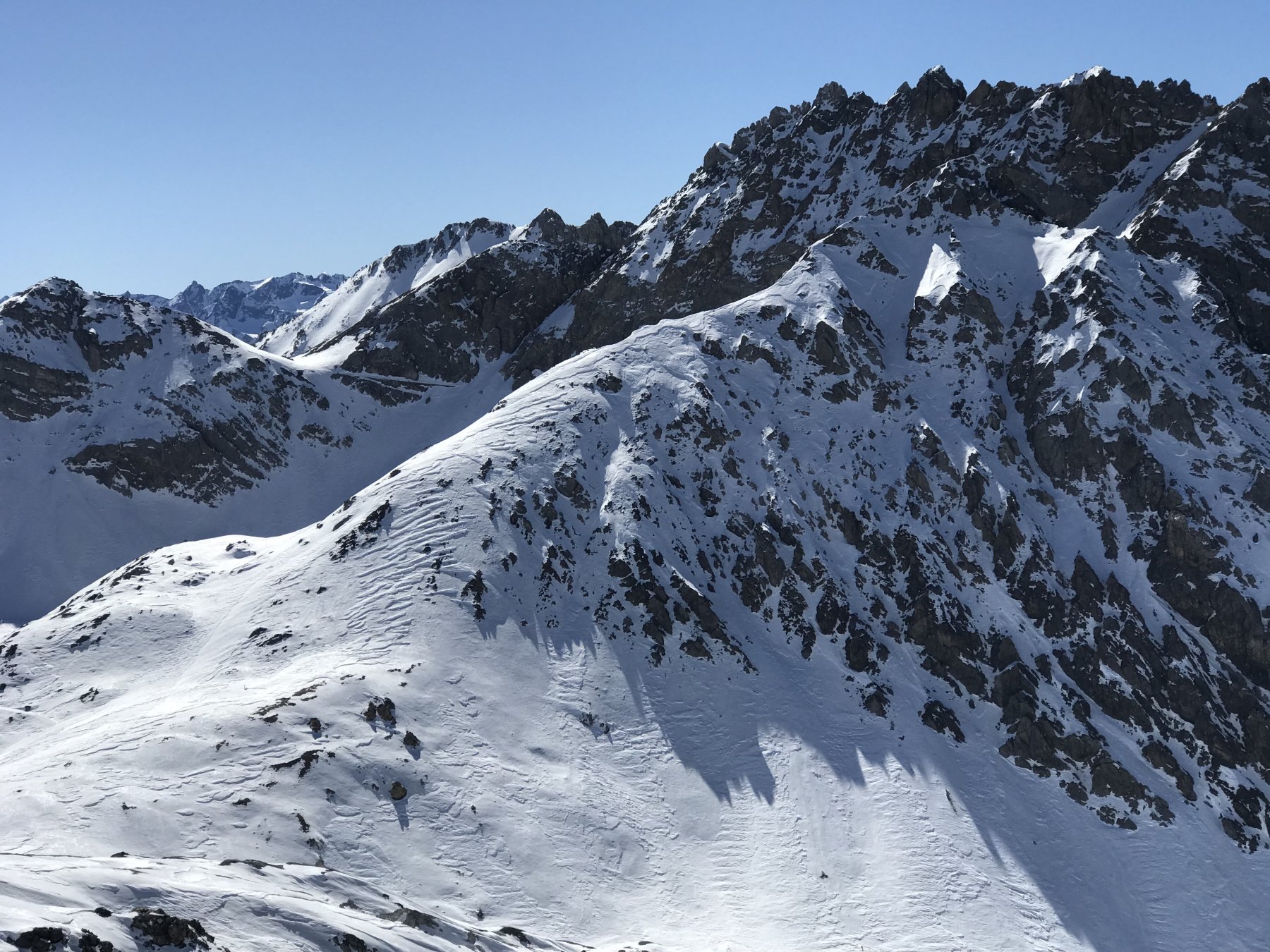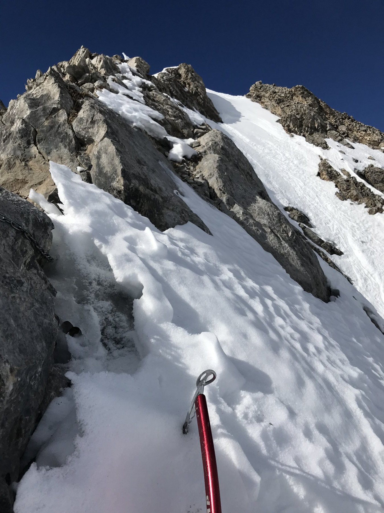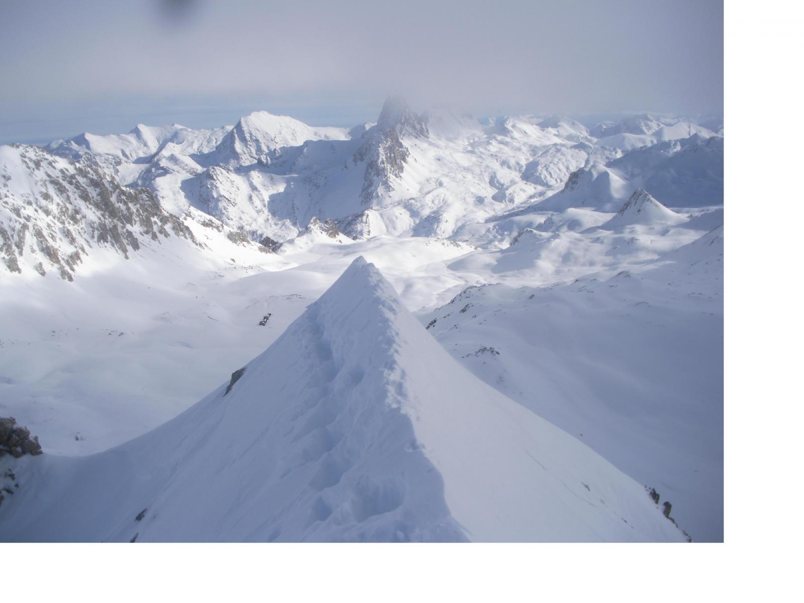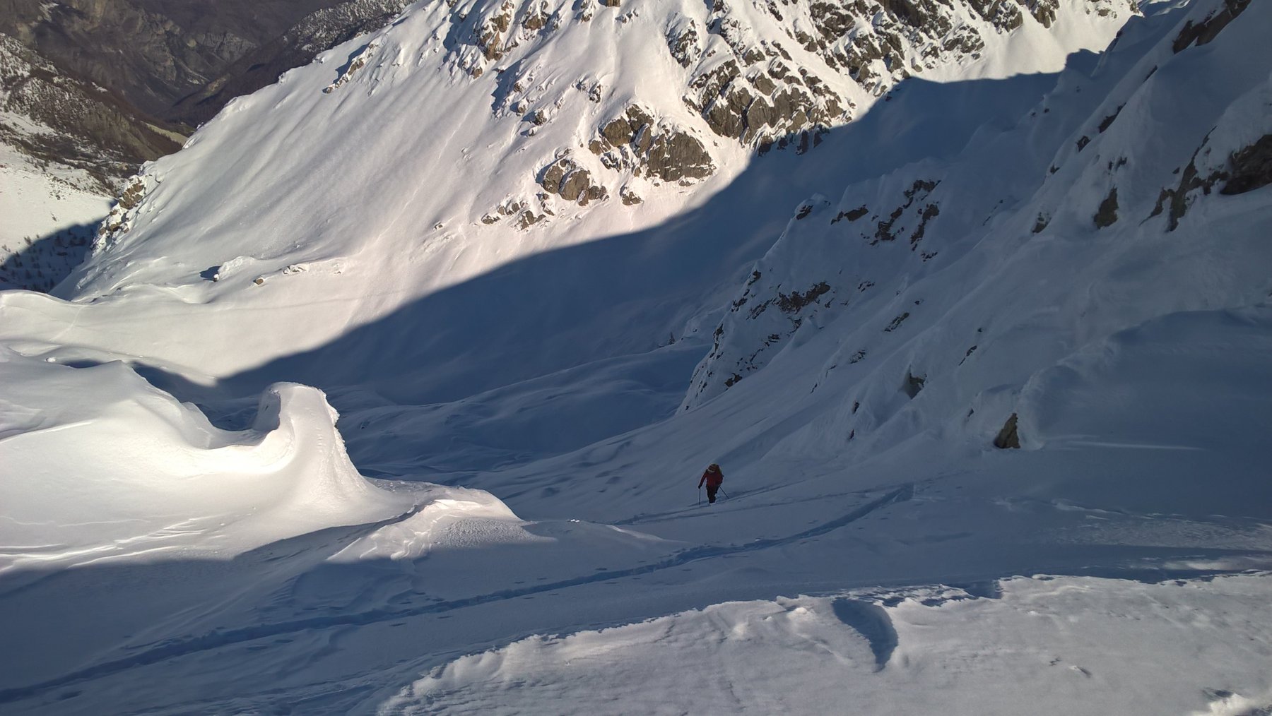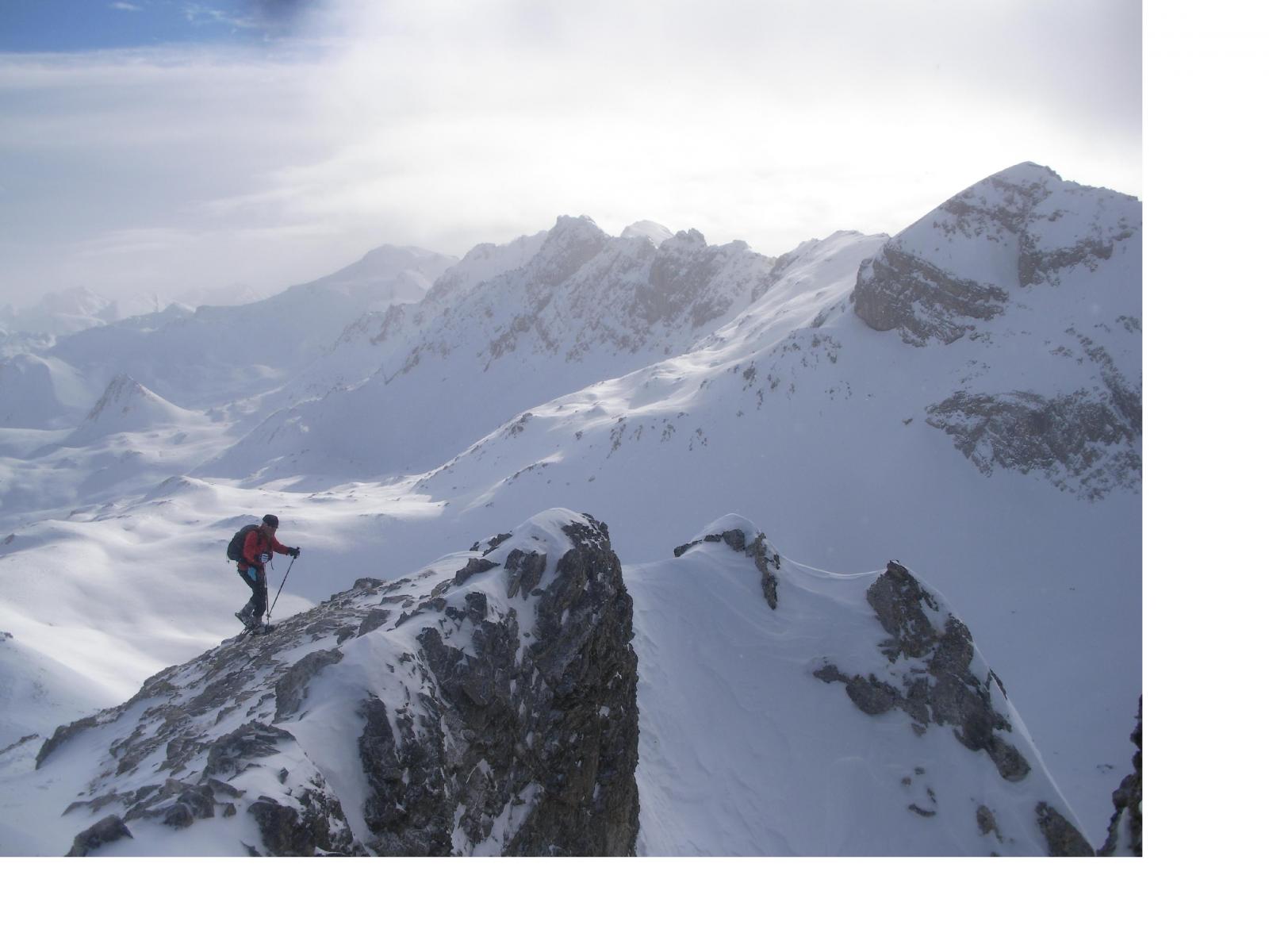 Poco prima del passo, prendere gli ampi pendii sulla dx,sinistra orografica,piuttosto ripidi che portano all’inizio della cresta est del monte Eco. Si portano gli sci fino che la cresta diventa di misto.Si prosegue per crestine affilate e tratti di roccette.