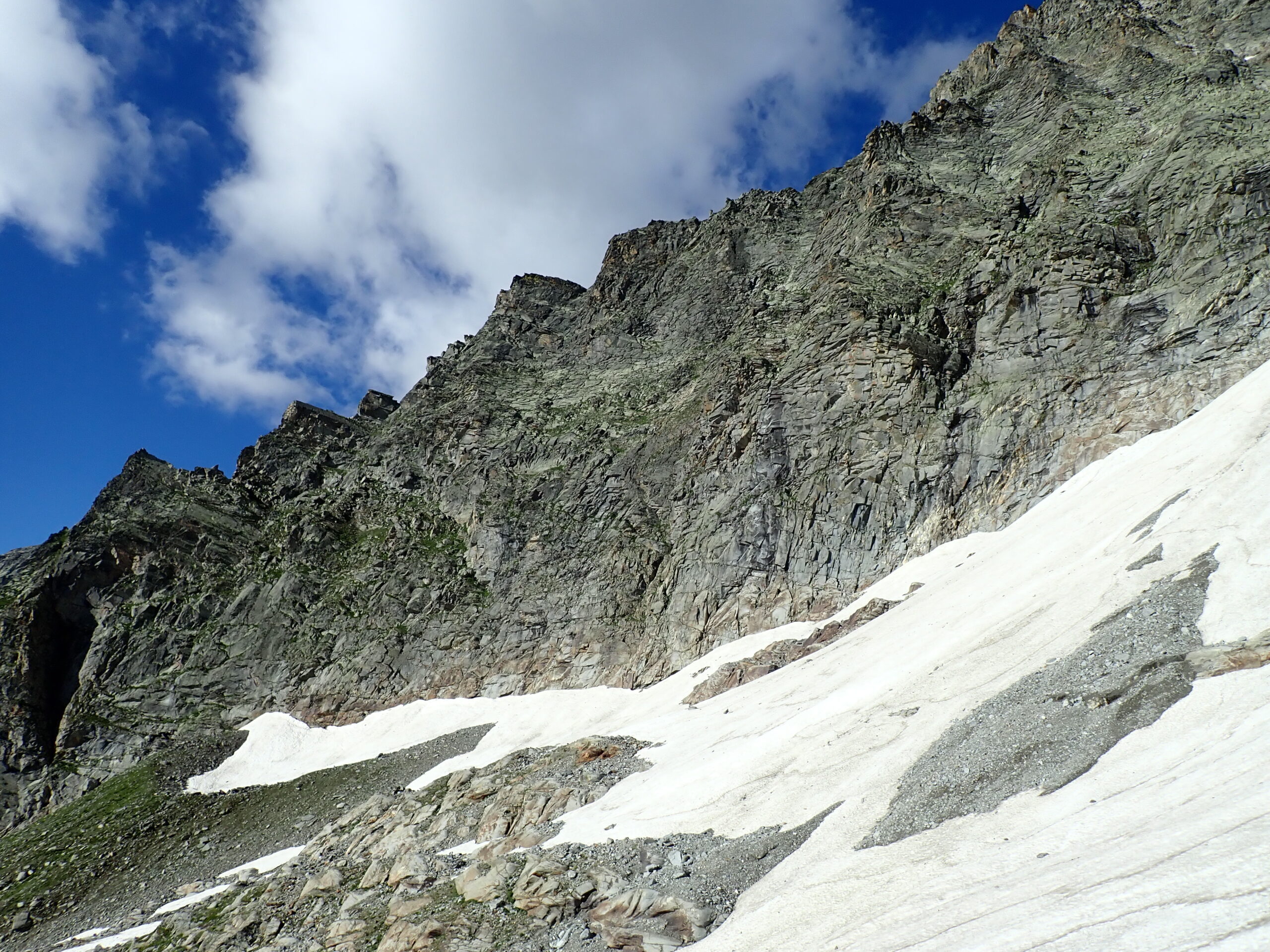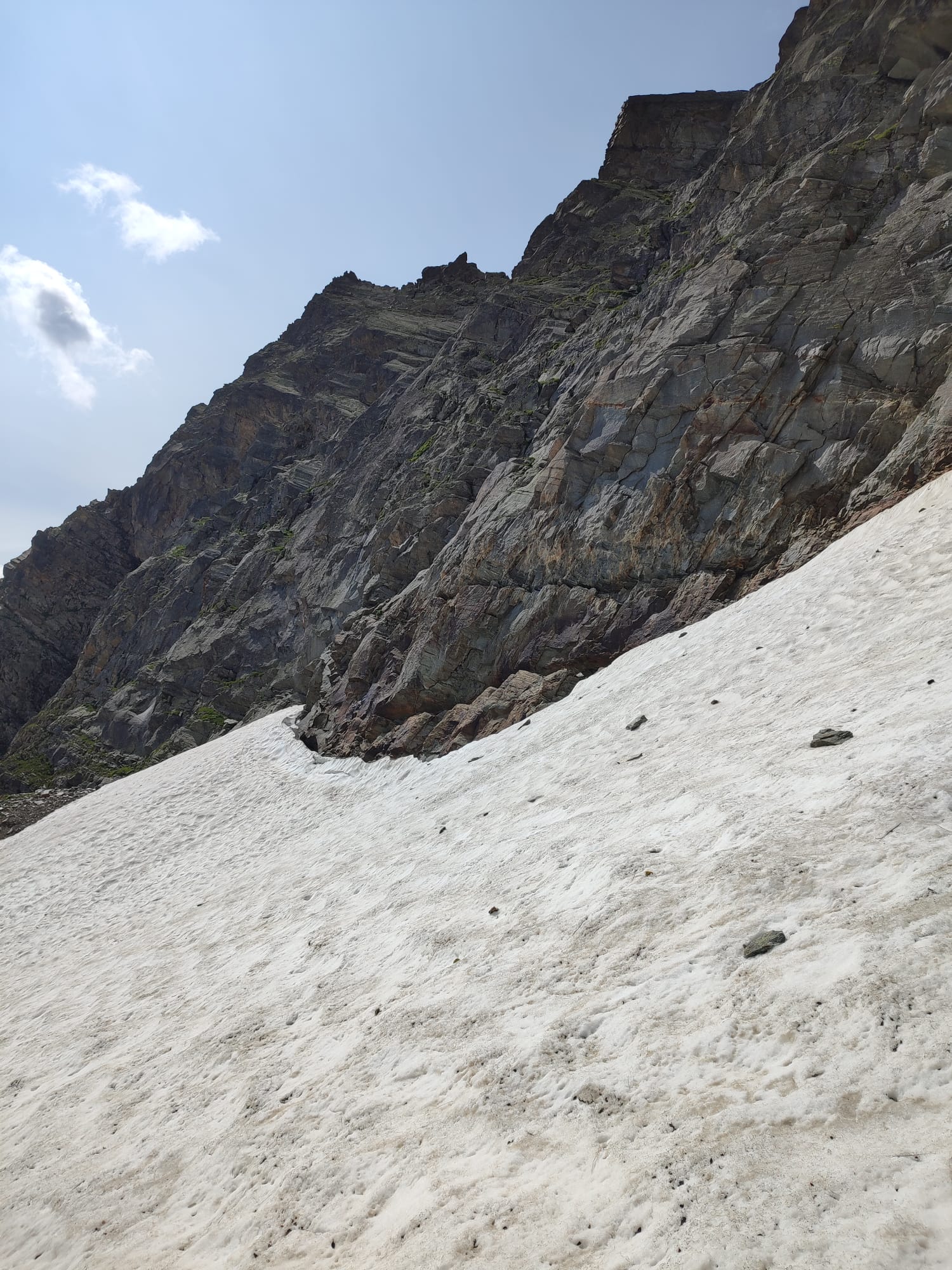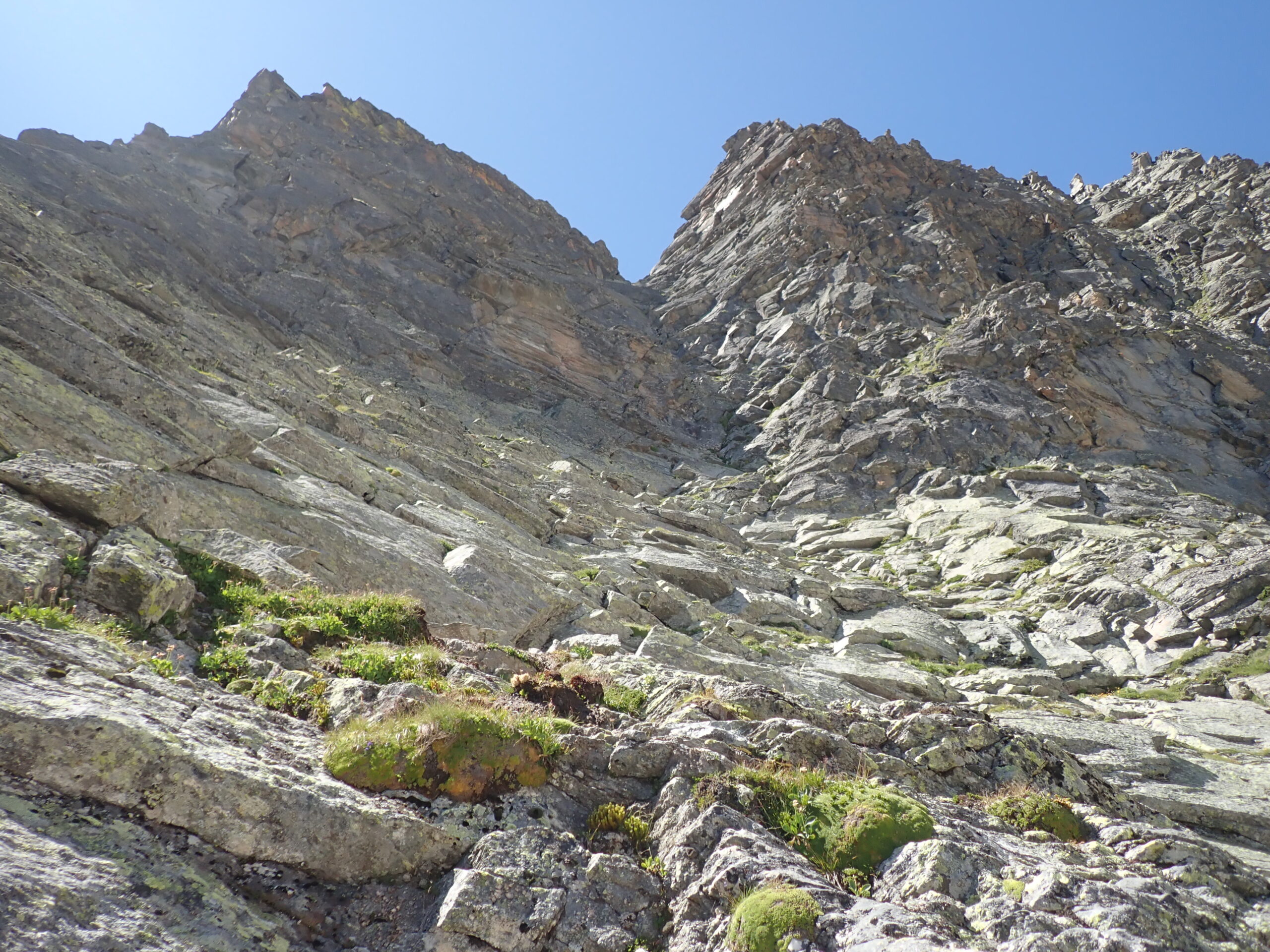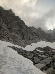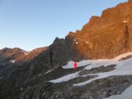 Dalla base della via, se si è guardato attentamente il percorso dall’alto, si può scendere lungo i nevai traversando verso il canalone che scende dal Colle di Martellot. Lo si raggiunge scendendo sulle facili balze erbose a fianco della cascata. Attraversatolo si taglia per prati in direzione del rifugio (30 min).