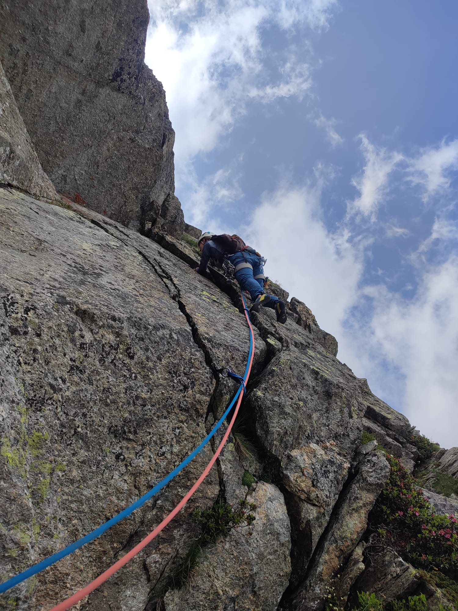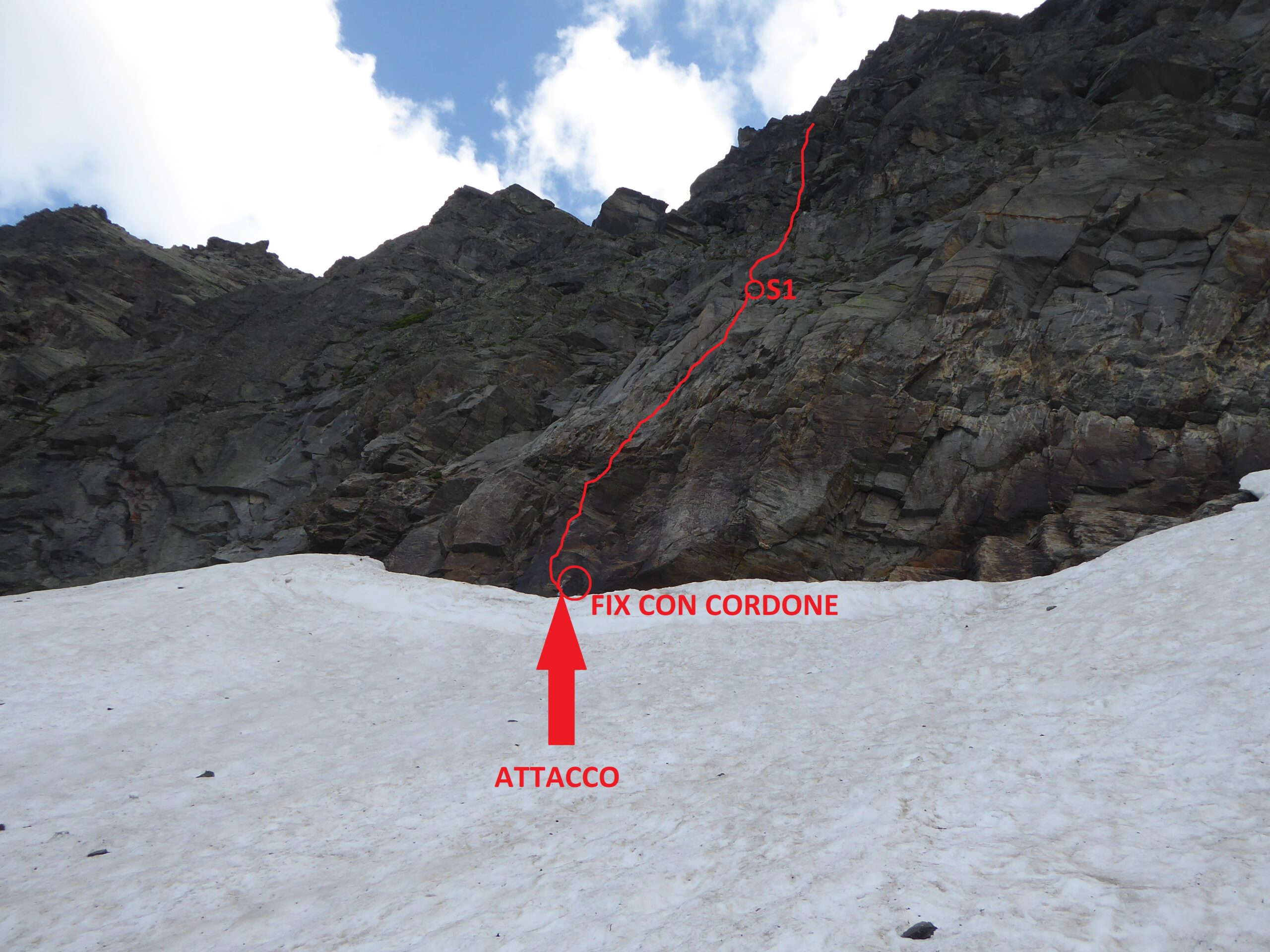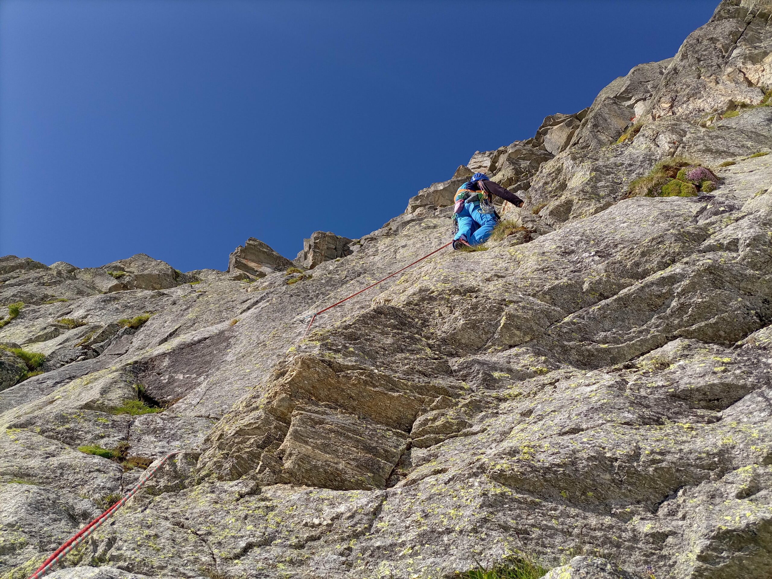 - L1: dallo spit-fix con cordone rosa non salire direttamente sulla levigata placca rossastra ma traversare qualche metro a sinistra per poi tornare più facilmente a destra sopra allo spit-fix. Salire quindi verso il secondo spit-fix ben visibile. Il tiro prosegue con andamento ascendente a destra su roccia granitica molto bella e compatta. Sul tiro 5 spit-fix più la sosta. Grado 6a