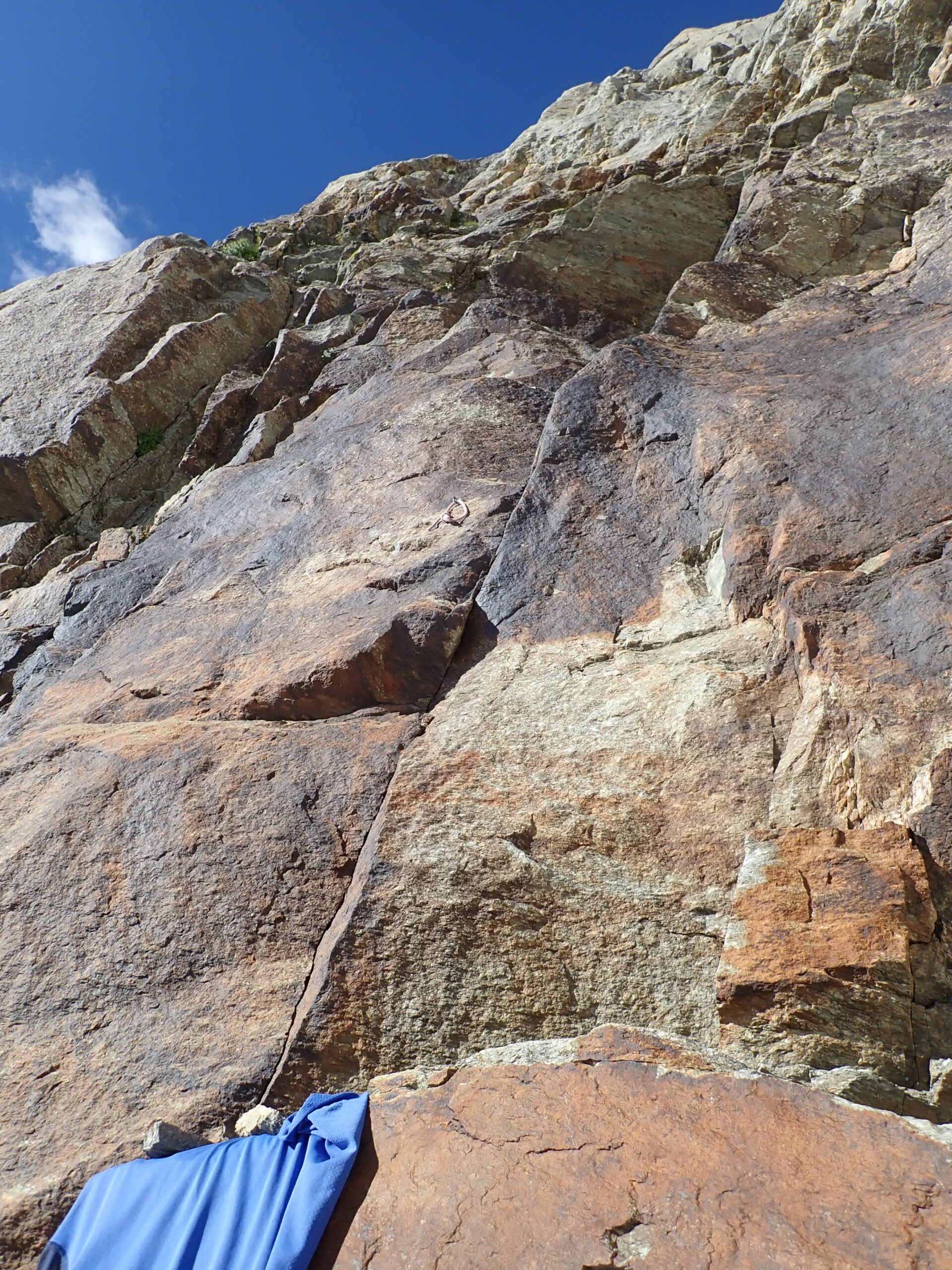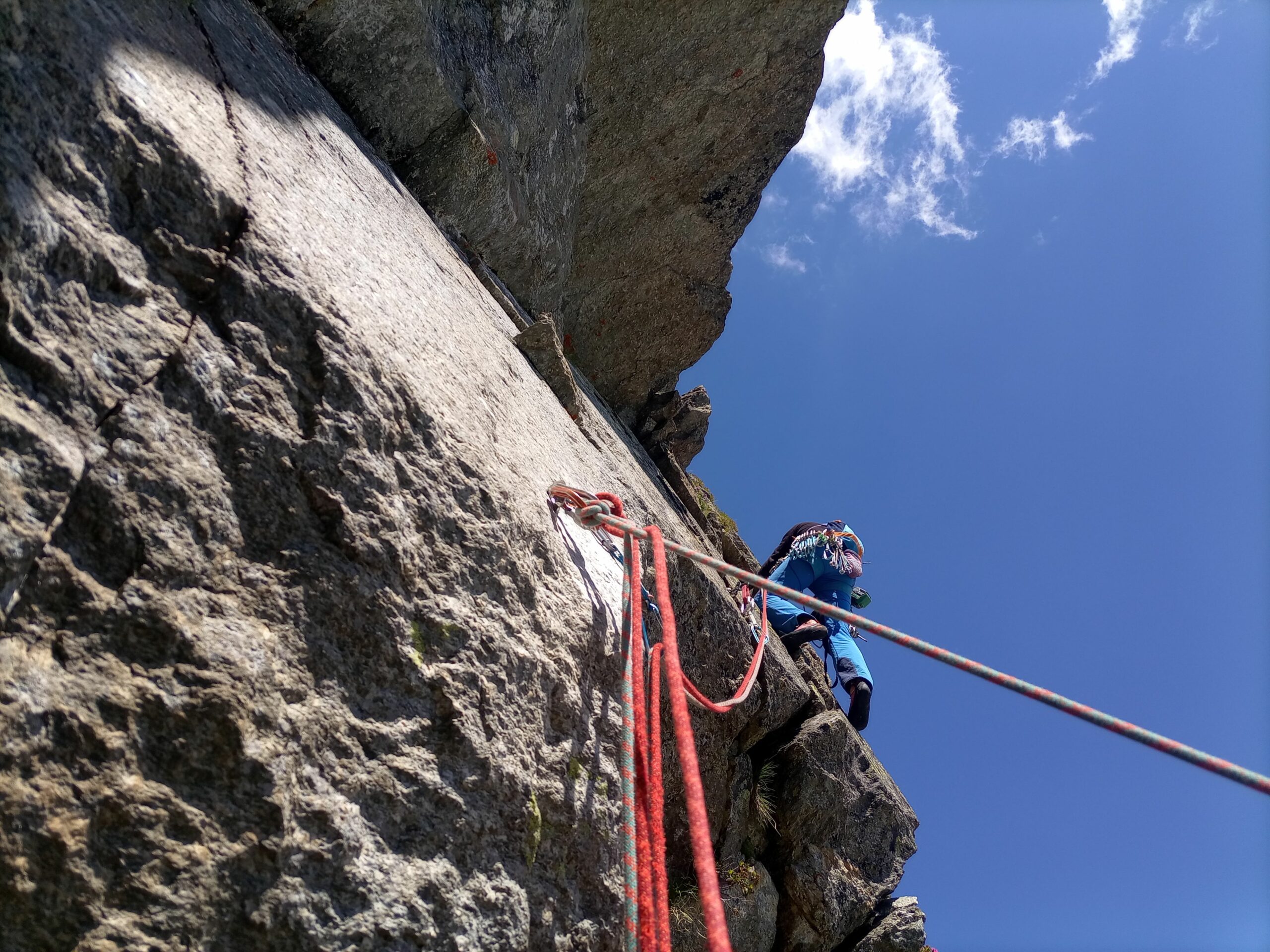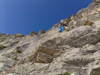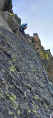 - L9: dalla sosta salire a sinistra dove la roccia è più articolata. Moschettonato l’unico spit-fix del tiro (allungare bene!) , posto sotto uno strapiombo (visibile dalla sosta), ribaltarsi oltre lo spigolo e seguire le fessure con bella arrampicata in stile granitico. Sosta su cornice a destra. Sul tiro 1 spit-fix più la sosta. Grado V