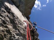 - L10: salire inizialmente nella larga spaccatura, poi uscire sul muro a tacche a sinistra e quindi traversare a destra in una nicchia da cui si vince l’ultima placca-diedro verso sinistra. Sul tiro 3 spit-fix più la sosta. Grado 6a