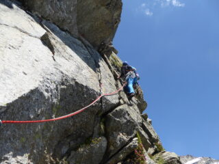 - L6: superare le belle fessure sopra la sosta fino allo spigolo e da qui a sinistra nel diedro compatto e cieco (2 spit-fix). Sul tiro 2 spit-fix più la sosta. Grado V+