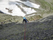 - L4: trasferimento. Dalla sosta a destra si sale sulla dorsale di blocchi fino al suo termine dove si trova uno spit-fix di sosta.