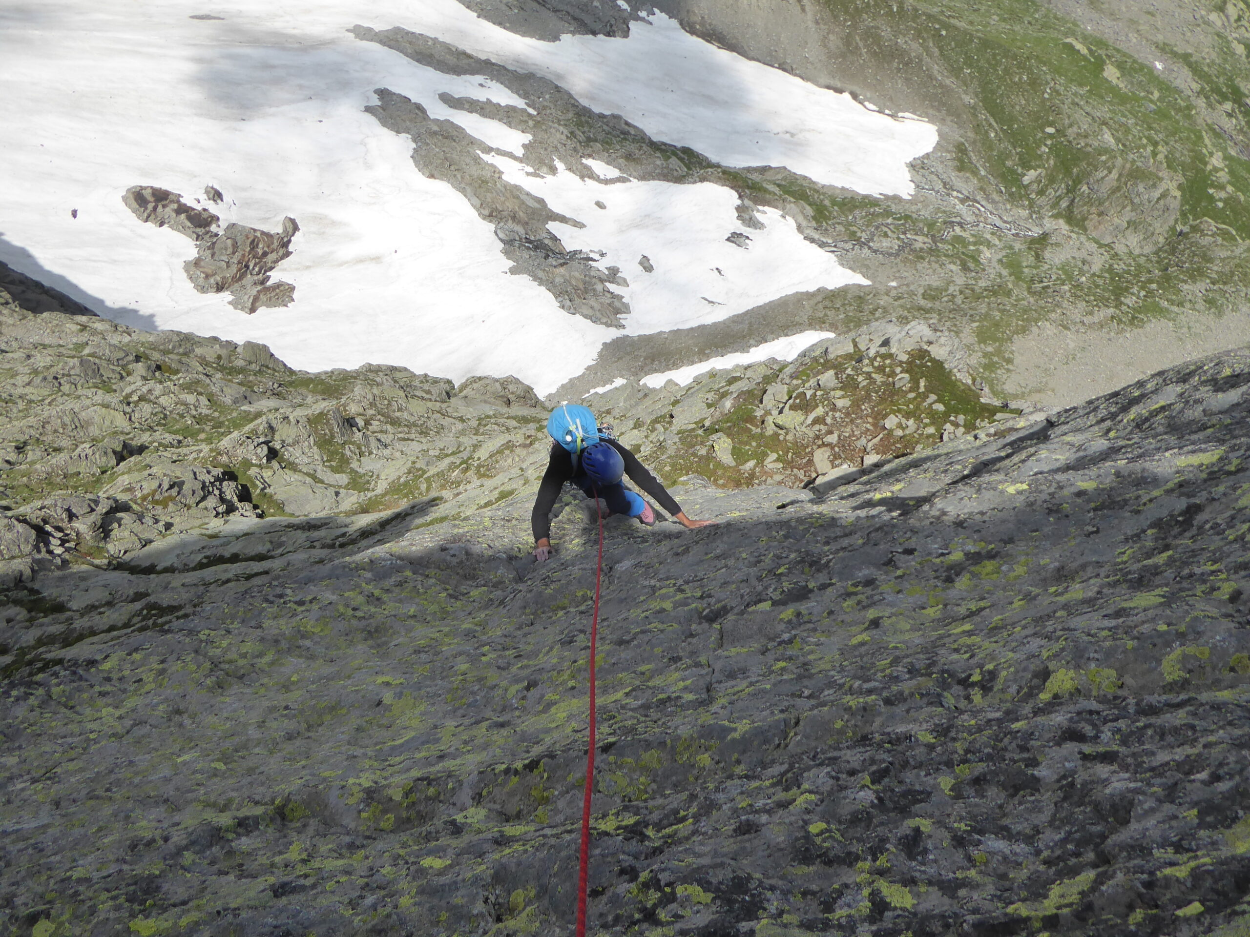 - L7: si è ora alla base del catino di placche verdastre ben visibile dal basso. Salire dritti sopra la sosta verso l’unico spit-fix del tiro. Salire ancora dritti con piacevole arrampicata fino alla cengia di sosta. Sul tiro 1 spit-fix più la sosta. Grado: un passo di IV-