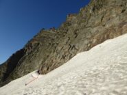 Dal rifugio prendere il sentiero 315A per il Colle della Fea che inizia alla destra della costruzione, vicino alla stanza adibita a locale invernale. Lo si segue fino a quota 2400m dove lo si abbandona per seguire la diramazione a sinistra per il Colle Girard, sentiero 315B. Il bivio è segnalato da un palo in ferro. Si segue per un breve tratto questo sentiero per poi abbandonarlo tagliando a sinistra su prati e pietraie verso l’evidente morena che delimita il canalone che scende dal Colle Martellot. Si giunge alla morena e la si risale sul suo filo fino a quota 2500m circa, dove è possibile scavalcarla. Si traversa allora verso i nevai dei rimasugli del ghiacciaio del Martellot. Si procede sul glacio-nevato in diagonale verso sinistra transitando sotto alle cascate e puntando all’ultimo evidente filo morenico all’estrema sinistra, oltre il quale il pendio inizia a scendere. La via attacca sulla porzione di parete a destra dello scudo di placche verde-grigio (poste sopra tale morena), in corrispondenza di una fascia di rocce basali dal colore rossastro. Spit-fix con cordone rosa appena sopra il nevaio. Ci si può cambiare su uno degli isolotti detritico-rocciosi e poi portarsi in breve verso l’attacco. Passare quindi dalla neve ai gradoni di roccia addossati alla parete dove ci si può cambiare le scarpe. La neve arriva in questo punto abbastanza ben contro alla parete, in stagione particolarmente avanzata potrebbe però anche crearsi una più profonda crepaccia terminale. Quota attacco 2580m, 300m di dislivello, 1h 15’ dal rifugio.