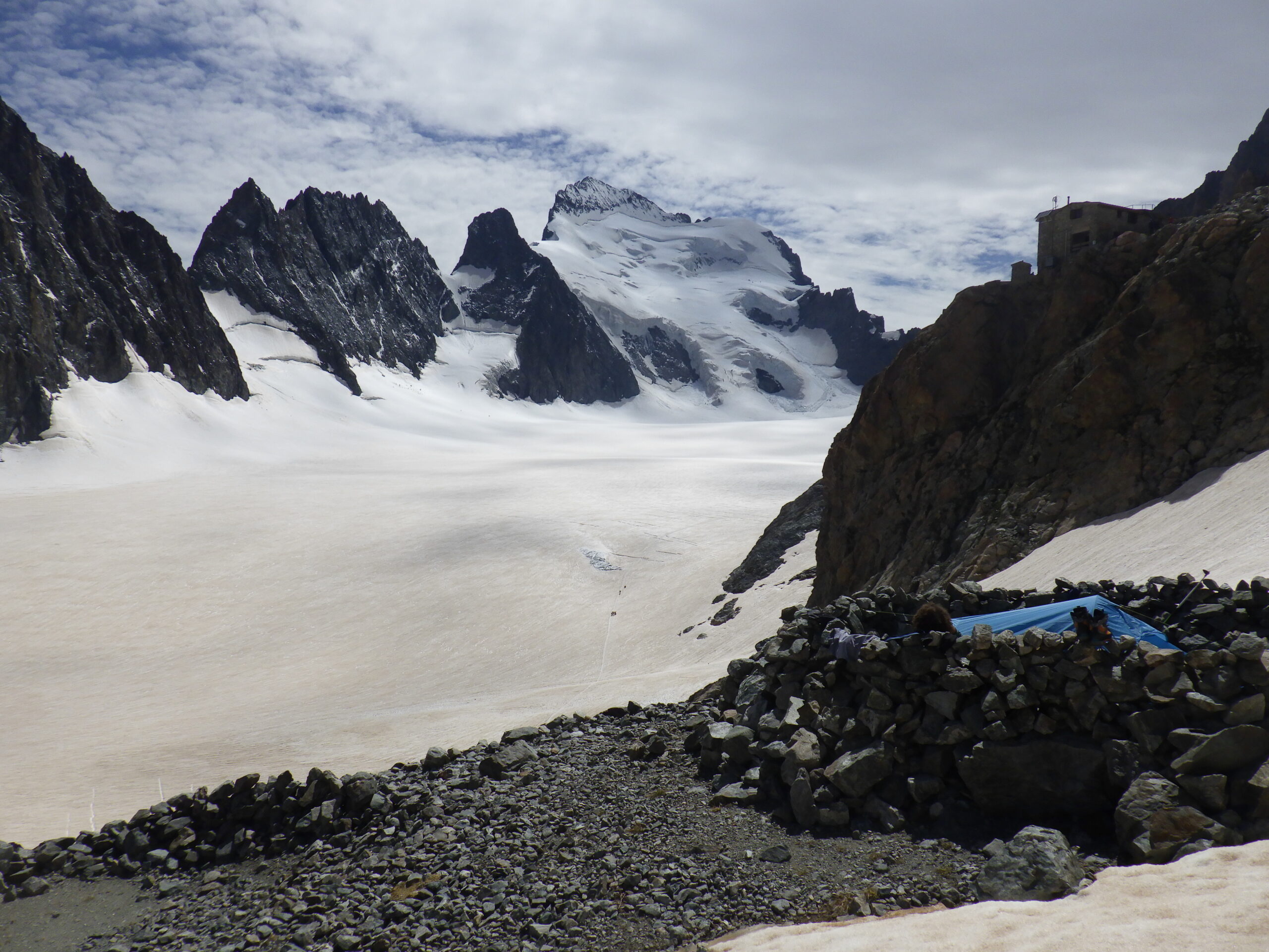 Condizioni mediocri, neve marmorea nella parte bassa ma verso la cresta, dove è via via più sottile e inframezzata da rocce affioranti, a tratti croste e ghiaccio sottile (piazzato un paio di viti psicologiche strozzate a metà prima dell’uscita). Passaggio agevole della terminale più o meno a metà tra il Whimper e il Coolidge, poi traverso per portarsi a piombo sotto la cima e risalita cercando la linea di neve migliore. Cresta ancora da ramponi ma in ordine, un paio di doppiette per la breche (corda da 30, diverse soste disponibili), per fortuna per primi in vetta e pochi incontri, dopo gran traffico. Via normale ben tracciata, pendii ripidi da non sottovalutare, terminali dal passaggio risicato in entrambe le varianti dopo i seracchi. Bivaccato in tenda in una delle ottime piazzole accanto al Refuge des Ecrins.