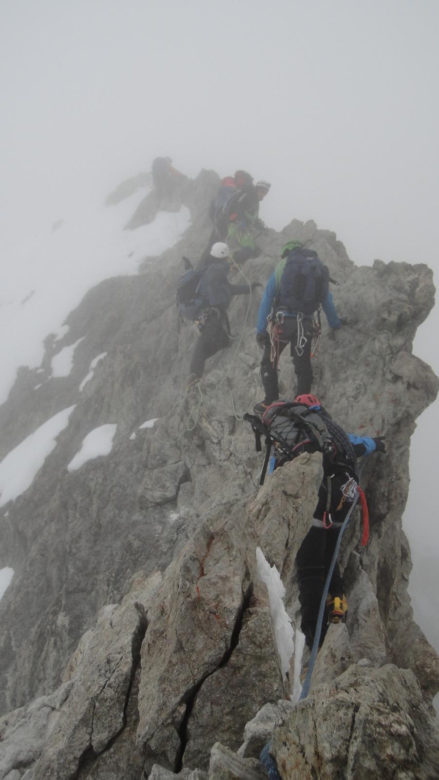 Bella salita tuttora in ottime condizioni in un ambiente alpino veramente maestoso, solo qualche attraversamento su crepaccio da fare attenzione. Divertente e facile la salita del tratto di cresta che porta in vetta anche se oggi la poca visibilità e il vento forte a raffiche hanno disturbato un pochino e negato un panorama di vetta che dev’essere senz’altro meraviglioso. Poche cordate oggi in vetta alla Barre, parecchio viavai sul Dome. Discesa per la via di salita con doverosa e breve risalita al Dome e rientro sul provvidenziale traccione con visibilità di pochi metri nella parte alta. Ottima l’accoglienza e la cordialità da parte dei gestori del rifugio con prezzi abbordabili e riduzione soci CAI.