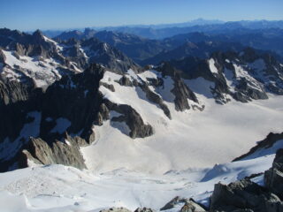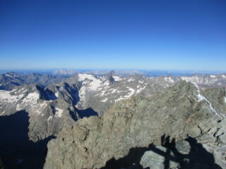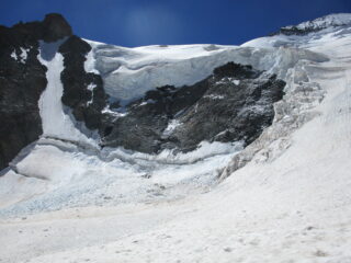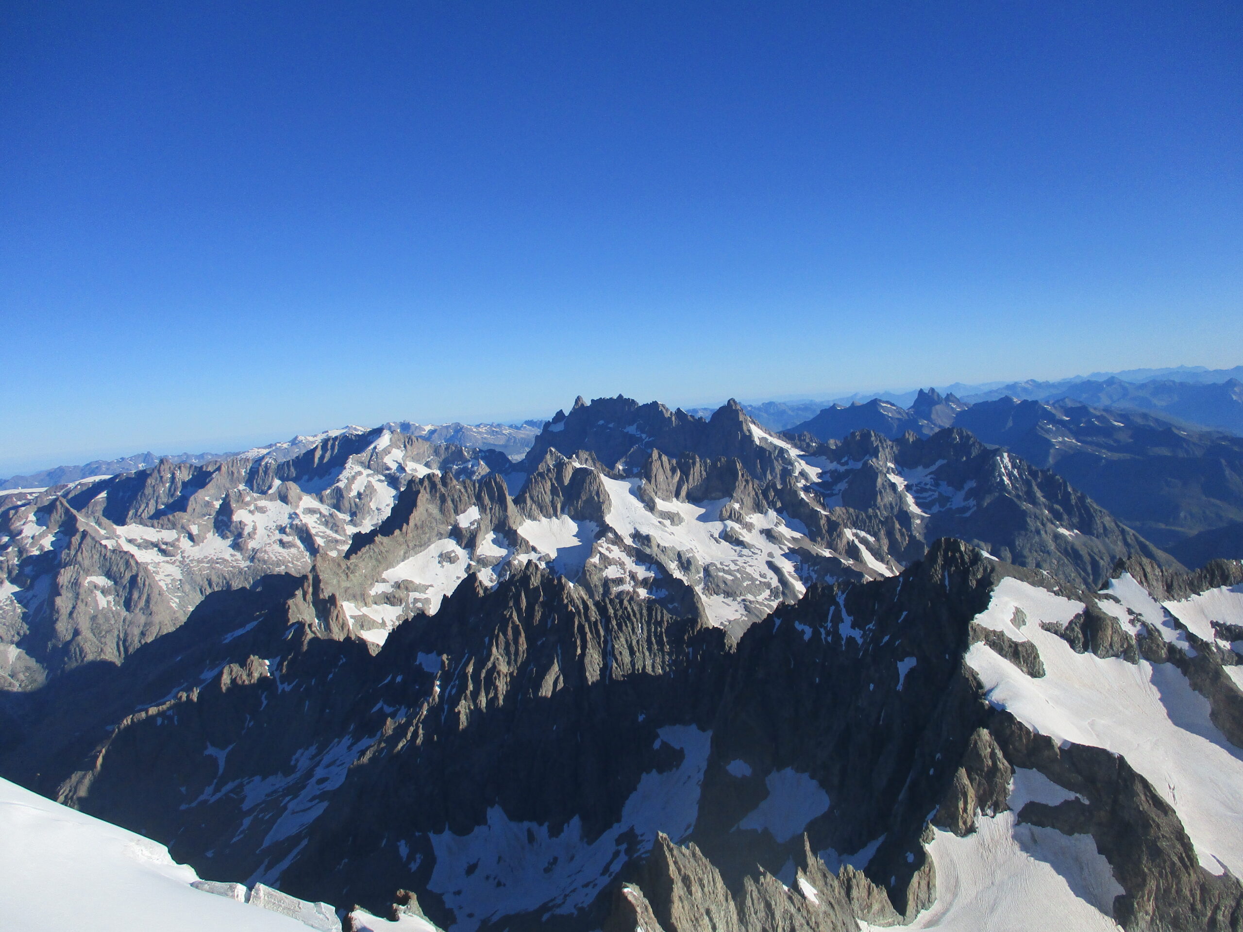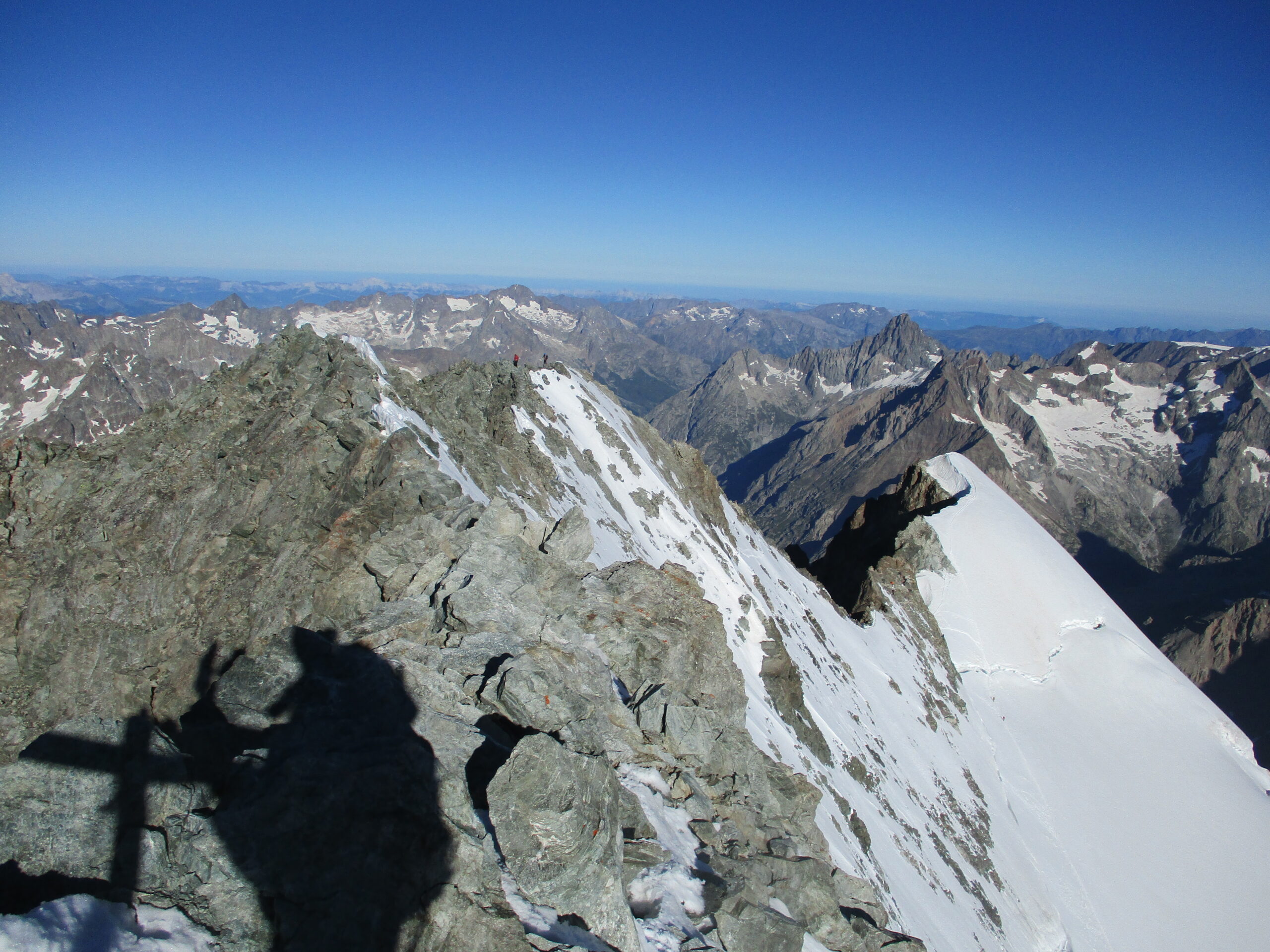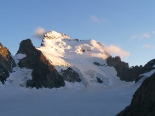 Finalmente la regina degli Ecrins, sicuramente tra le più belle salite fatte! Condizioni molto buone e giornata splendida, il temuto vento è calato di molto rispetto a domenica senza mai dar fastidio. Parte in falsopiano del ghiacciaio ancora buona, un pò di attenzione all’inizio per chi non fa il sentiero, le lingue di neve nascondono piccoli crepacci. Appena oltre il rifugio c’è un grosso buco e la nuova traccia passa più a sinistra. La traccia per il dome sale dritto per dritto e solo in alto ormai in vista del traverso si concede qualche zigzag, nel primo tratto inizia ad affiorare del ghiaccio per qualche decina di metri. Nella parte mediana si passano almeno 3-4 crepacci veramente grossi, per ora facilmente aggirabili. Terminale passabile comodamente con qualche gradino, fenditura piena di neve ma che va ampliandosi. Si raggiunge lo spigolo dalla Breche per ottima neve, la rampa successiva e la cengia verso il molare appaiono più agevoli della variante diretta tra neve e rocce, comunque tracciata. Cresta percorsa tutta in ramponi, su diverse cenge appena sotto il filo bella neve che non ostacola. Prime impennate verso il pic Lory impegnative ma sempre buone prese per le mani presso il filo, intasamento qui al ritorno per il passaggio di 3 cordate in salita. Disarrampicato fino alla calata, credo 7-8 metri, che parte appena sopra una cengia sopra la breche Lory, dove anche qui c’è una sosta con fettucce. Rientro eterno su neve ancora buona, si trova poi lungo soprattutto sulla parte piana del ghiacciaio. Cena Arcaplanet ma gestione (ex pelvoux) prodiga di info su ogni itinerario, colazione alle 3 abbondante e più che dignitosa. 4h e 40 per la salita, 1h 30 in cresta a salire e poco di più per la discesa, alle 16 all’auto con varie pause. Non si scoraggi chi chiama direttamente in rifugio e trovasse pieno, la prenotazione online è ok, abbiam prenotato online e se dà verde (disponibile) tutto ok. Meije, Pelvoux, Aleifroide, dome, Coolidge, etc. mancava la Gran Dama a coronare una notte di cometa, un’alba splendida e qualche piccolo sogno da pestaneve. Un caro grazie ai compagni di viaggio e in particolare al fortissimo Lele, salut!