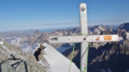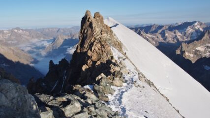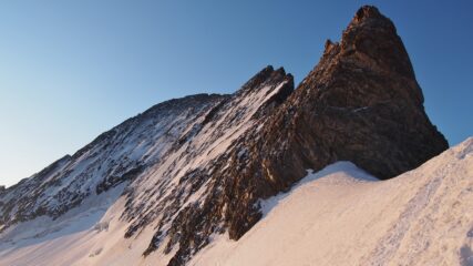 Partenza alle 4.15, salita tutta in neve, qualche grosso crepaccio che si passa bene, alla Brechè alle 7.10. Da qui vento e freddo, cresta praticamente asciutta, pochi tratti su neve, noi abbiamo tenuto i ramponi ma fattibile senza.