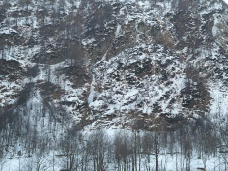 Dall’attacco superare un breve muretto a destra (aggirabile) per proseguire lungo la colata molto larga alla base fino a raggiungere un pianoro (sosta a sinistra su rocce). Da qui puntare a un canalino a destra che prosegue allargandosi fino all’uscita. Sosta su arbusti o su ghiaccio.