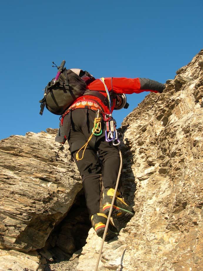Salita molto bella in ambiente spettacolare, tecnicamente non difficile ma molto aerea e mai banale, corde fisse nei punti più difficili attrezzata con chiodi e spit dove necessita.