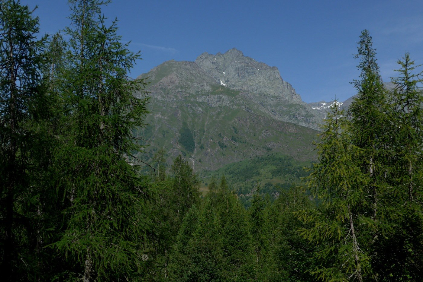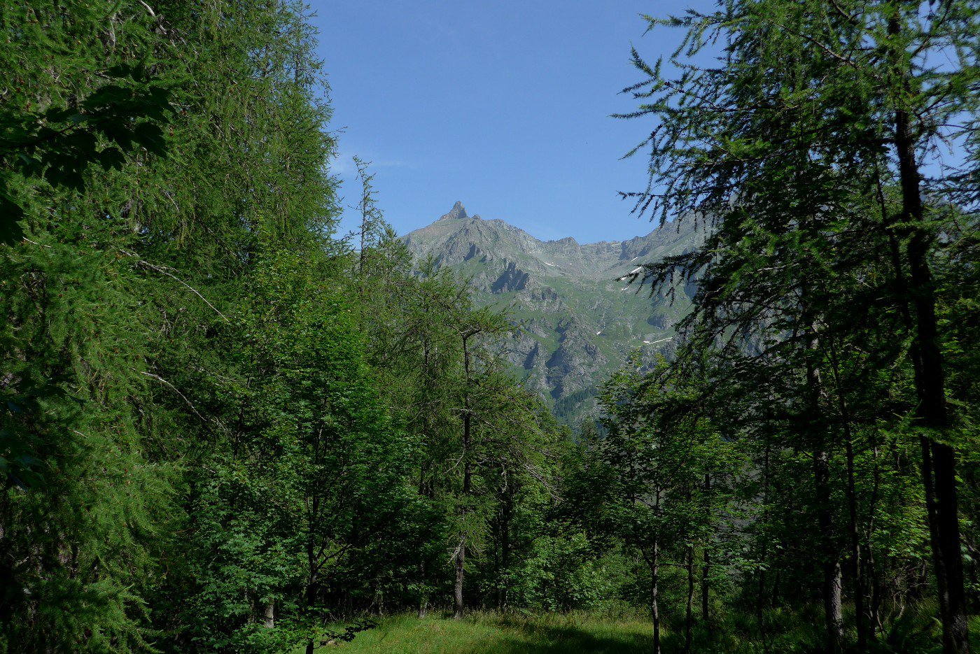 Essa sale decisamente inoltrandosi nel lariceto. Dopo una decina di minuti si incontra la deviazione, segnalata da freccia metallica rossa, che porta a sinistra.