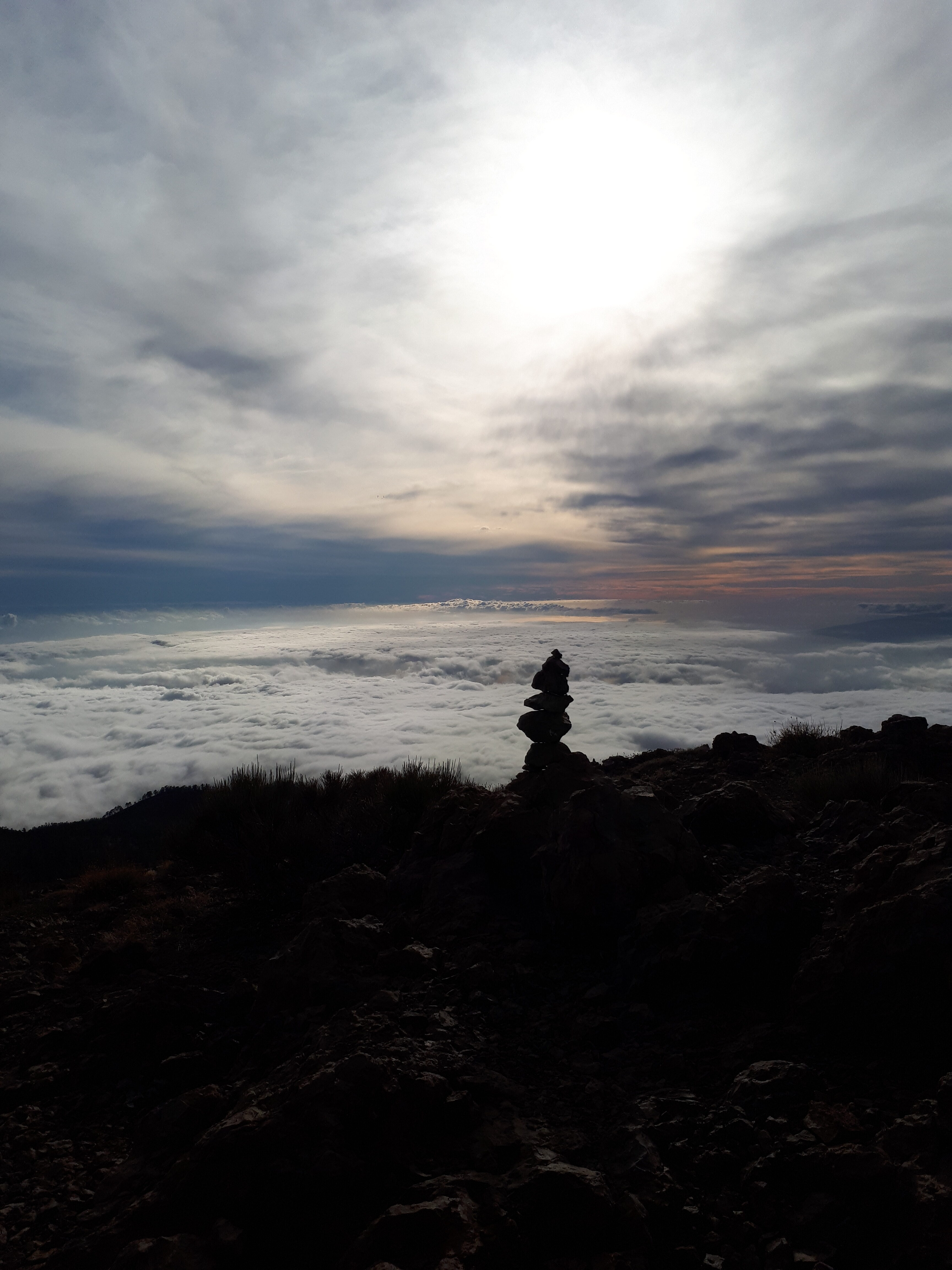 I numerosi ometti portano ad un intaglio nella roccia vulcanica, e con pochi e divertenti passi di arrampicata si raggiunge la sommità, su cui é presente una croce in legno.
