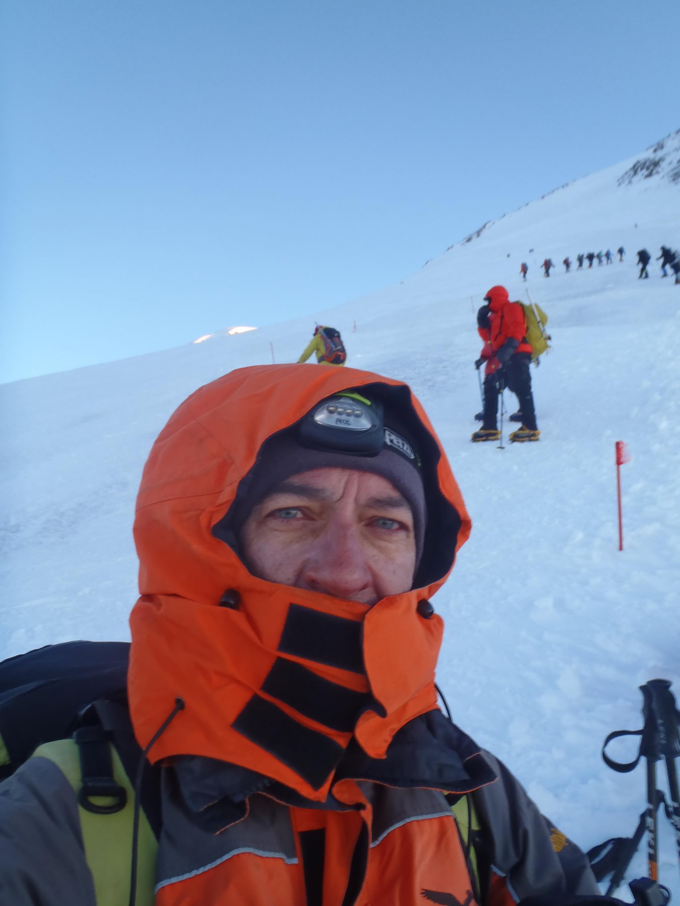 Partito alle 23.00 a piedi con un gruppo ed una guida ben più lenti di me e zigzagato in coda a tutti per “restare caldo” fino a quota 5000. Questa quota è marcata da un gatto delle nevi abbandonato e mezzo affondato nel ghiaccio.