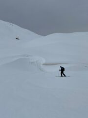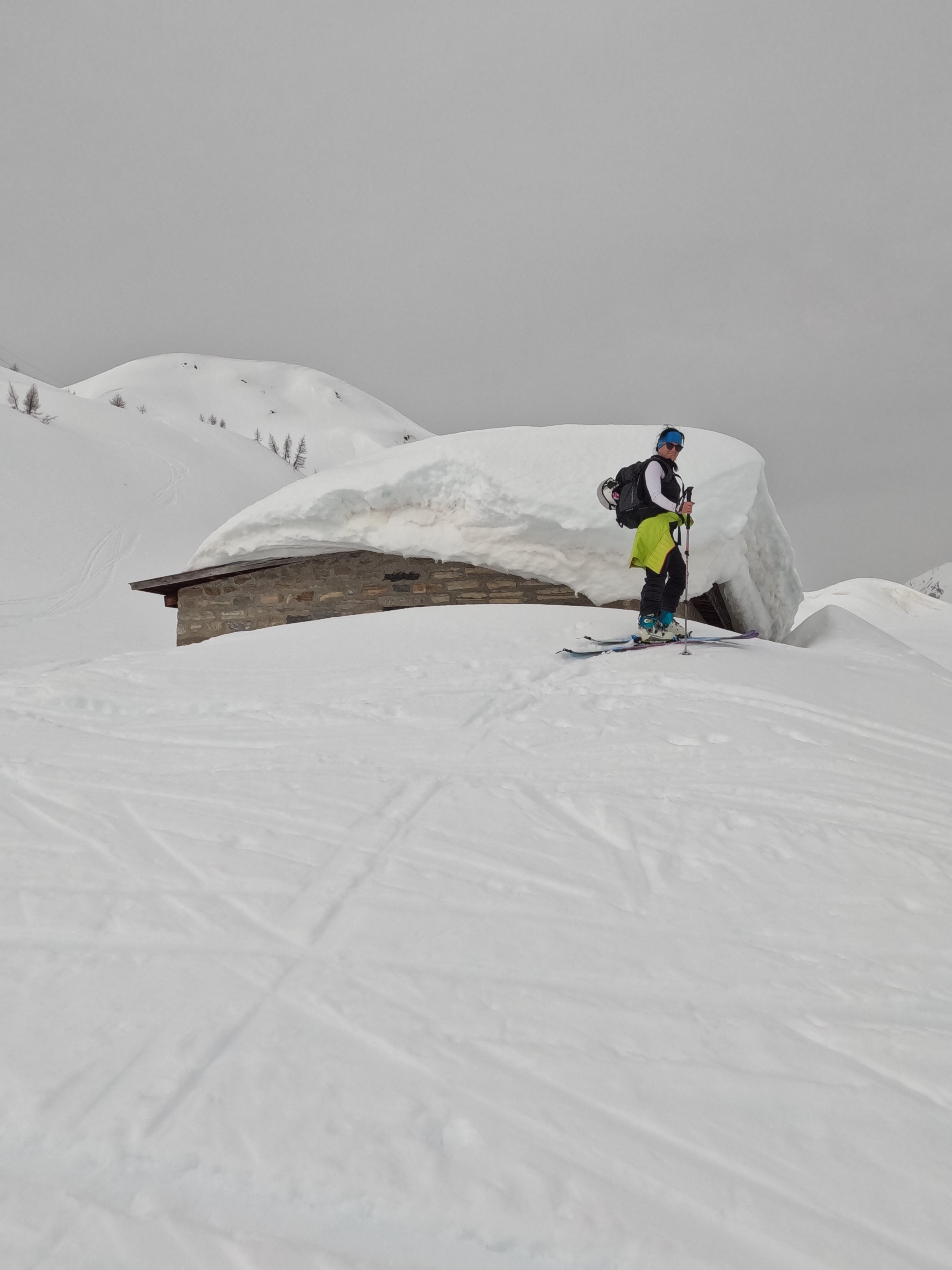 La traccia é presente ma si sfonda su di essa. Arrivati al passo di San Giacomo, il fondo migliora e si indurisce. Con noi altri 4/5 che fanno dietrofront.