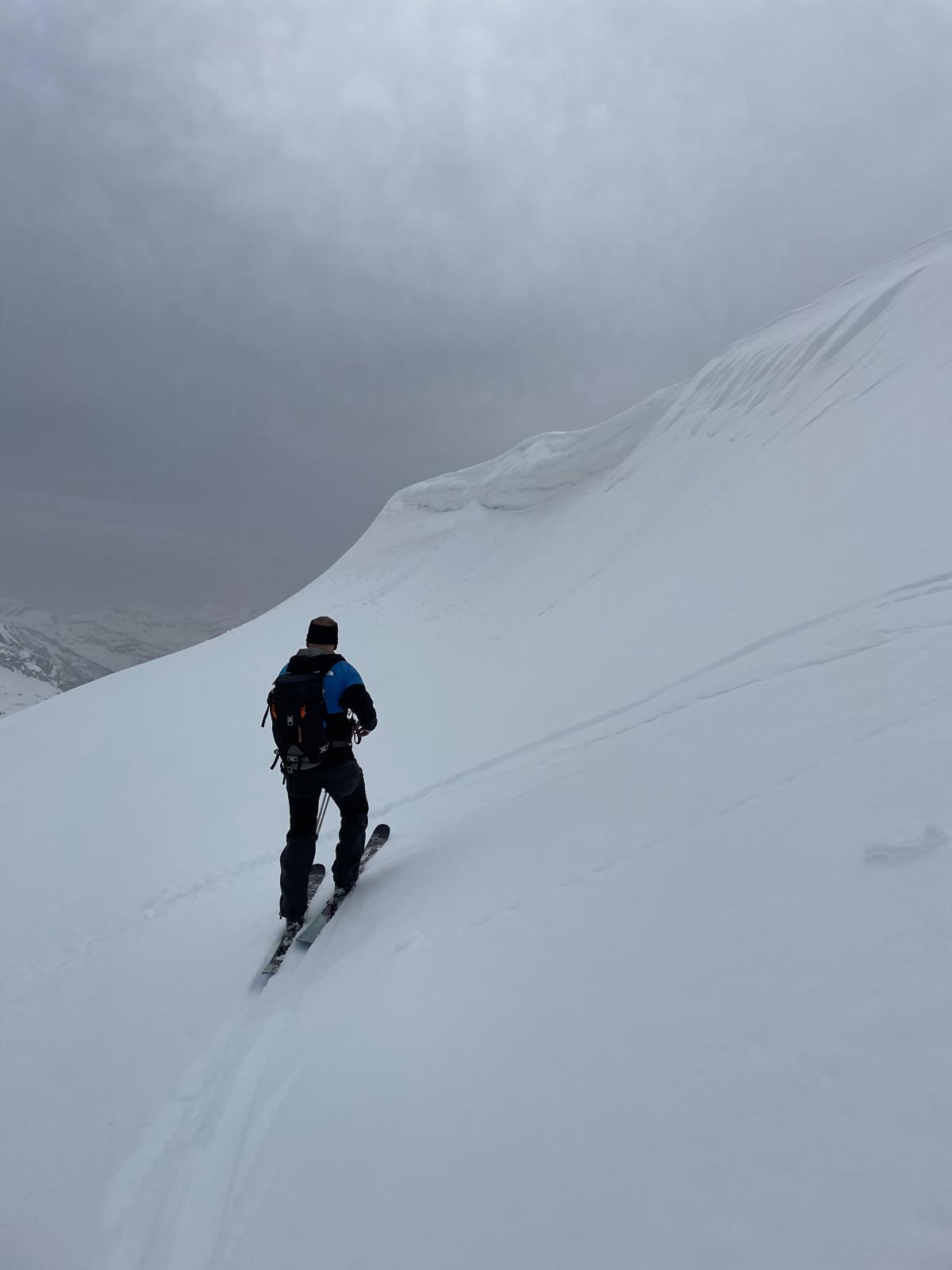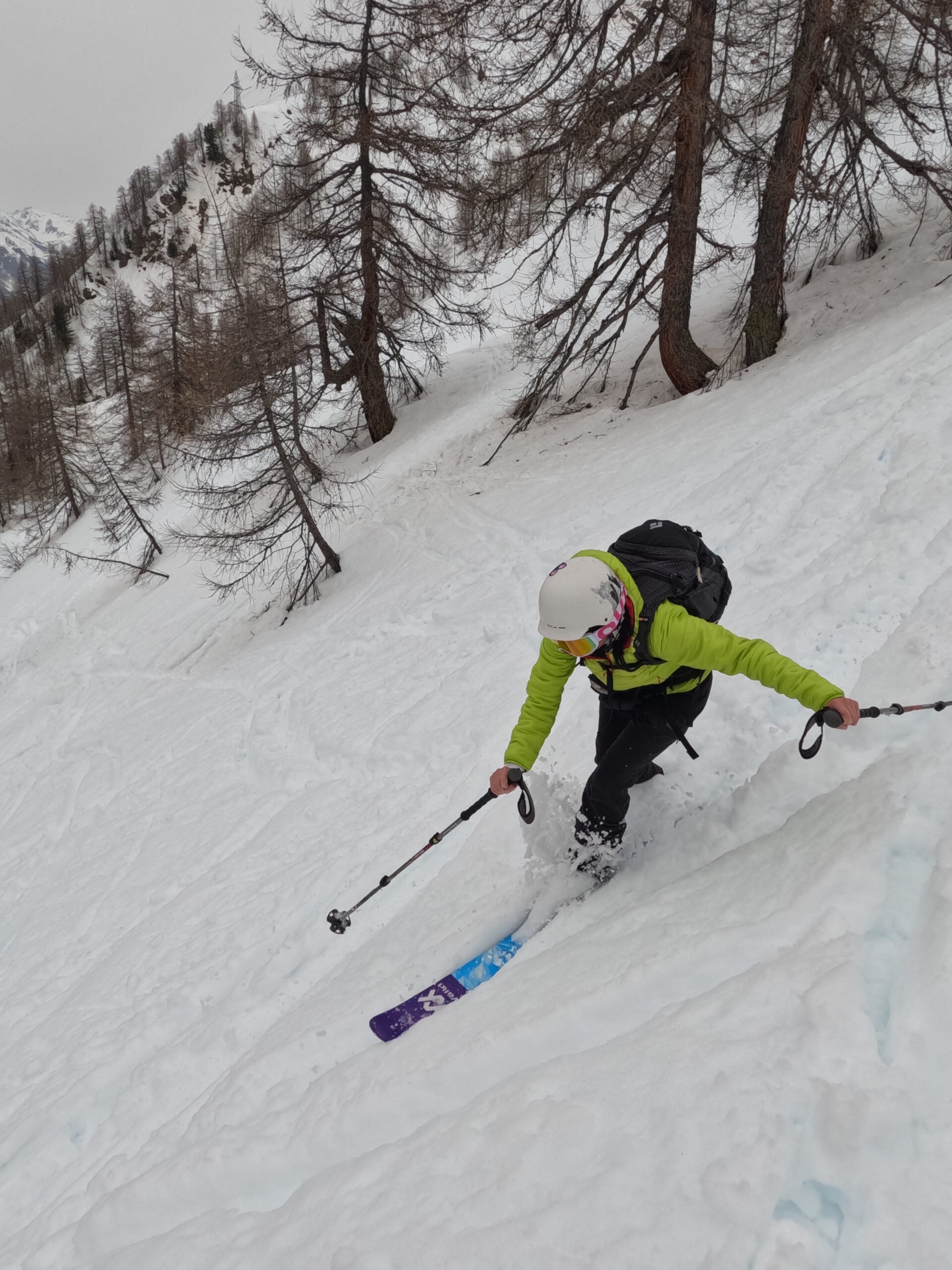 La discesa avviene più vicini alla cresta di confine. Con un lungo taglione e spesso spingendo ritorniamo al limitare del bosco. Da qui per pendii ripidi e molto carichi e cotti, arriviamo alla macchina, col volto ustionato. Cornuti e mazziati.