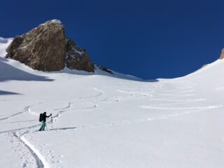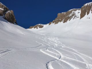 Giornata fredda. Accesso facile al rifugio Maria Luisa. Da lì abbiamo seguito il percorso per la Valrossa invece della salita classica, e poi abbiamo risalito il bellissimo pendio sud della bocchetta di Valrossa. Dal colle il percorso è molto placcato dal vento e ci siamo fermati. Discesa dal colle ottima su bella farina appena pesante. In basso per ora conviene ripellare evitando il lungo pianoro pesante di fondovalle verso il rifugio. Dal rifugio discesa su stradino come in pista.
