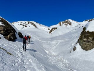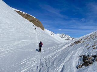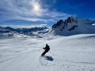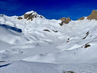 Discesa su neve primaverile non ancora completamente trasformata ovunque e tante placche da vento marce che consentono comunque una discreta sciata senza grosse fatiche. Nel complesso ci siamo divertiti! Sotto il Maria Luisa qualche taglio ormai nel marcione ma ancora ben sciabile.