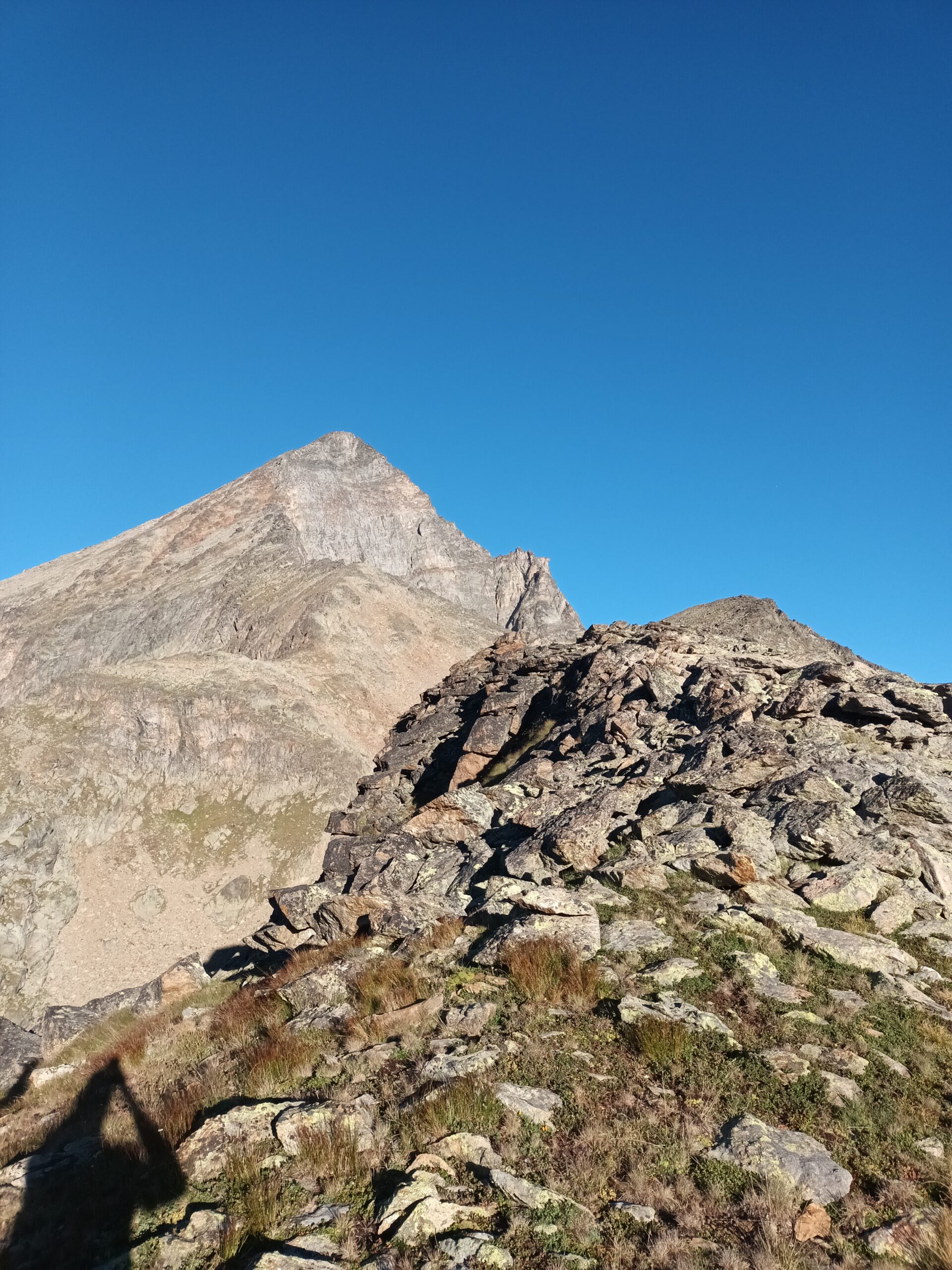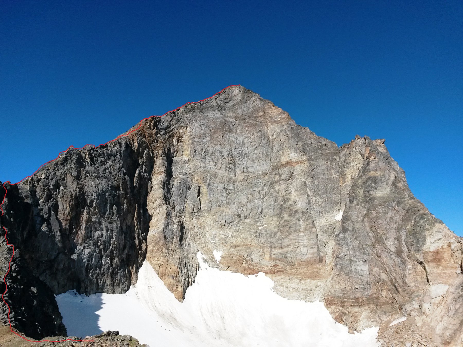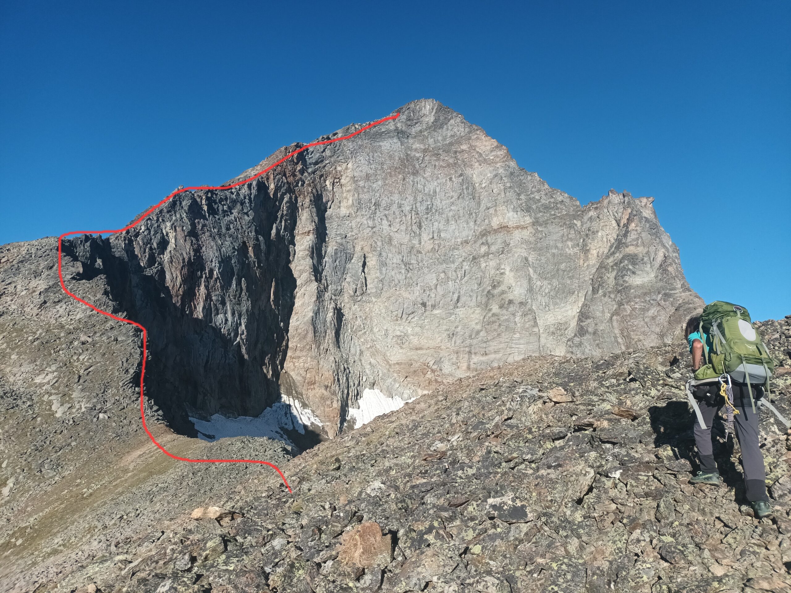 Dal Bivacco Menabreaz seguire il sentiero per il col d’Arbolle e raggiungere il lago Lungo (2632m); ad un terzo del lago, abbandonare il sentiero e dirigersi a destra con salita diagonale lungo un lieve avvallamento alla base meridionale della quota 2955m IGM. Si raggiunge così la cresta presso la quota 3110m ove è situato quel che resta della croce che ricorda i caduti del 1929 sulla parete est (ore 1.45). Da questo punto seguire fedelmente la cresta sul filo superando una serie di facili blocchi rocciosi (max II+ e III in un paio di punti evitabili) o aggirandoli almeno in parte a sinistra, sino in vetta (ore 1.45; 3.30). Difficoltà complessiva PD.