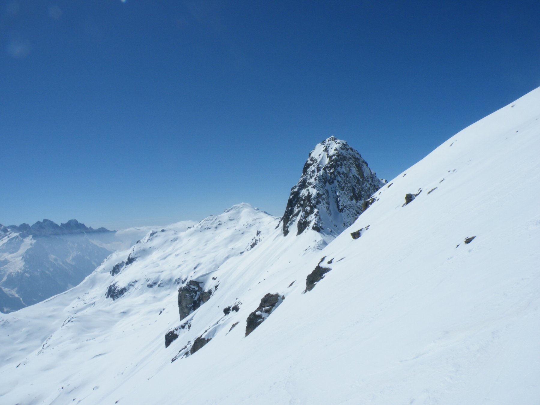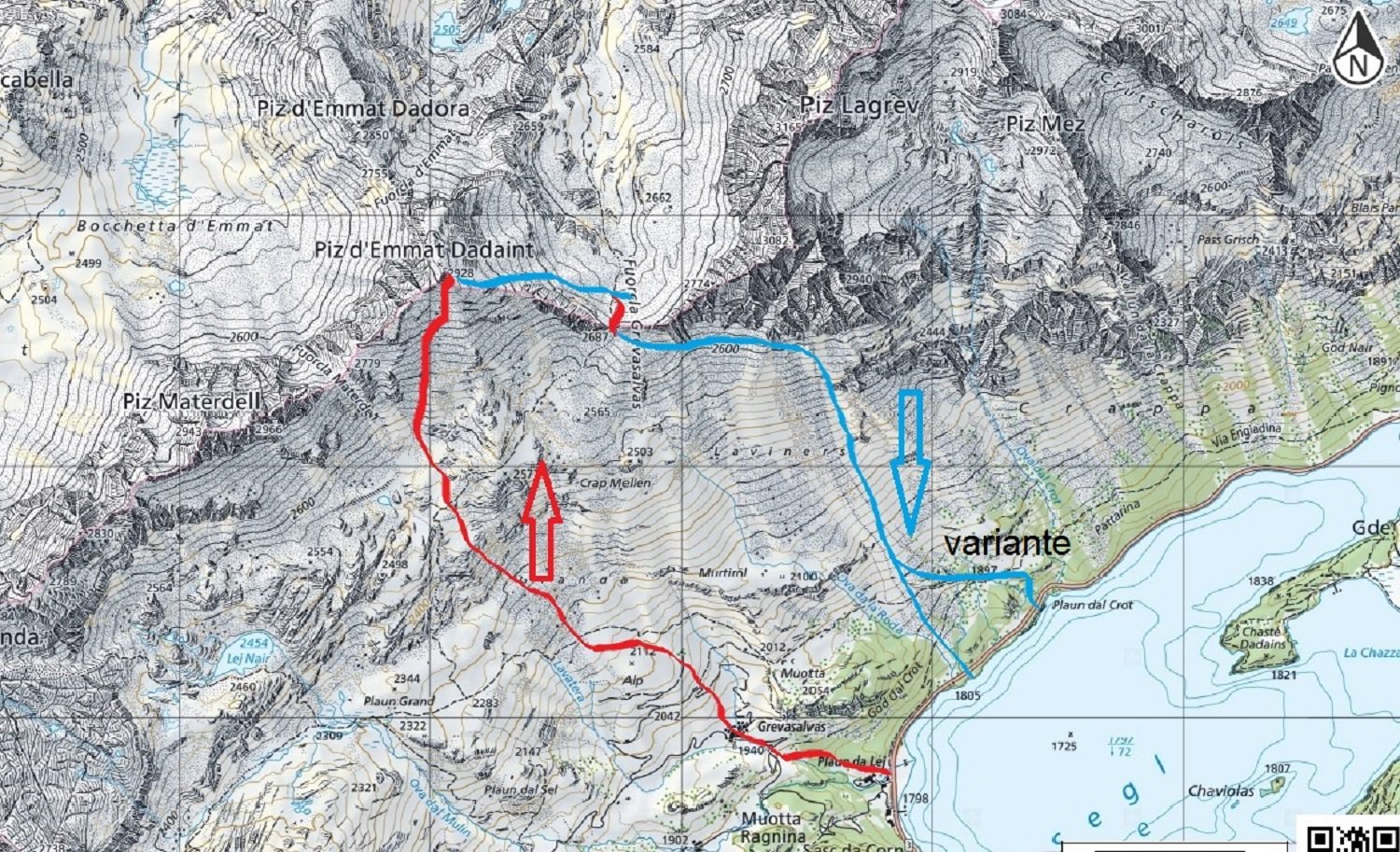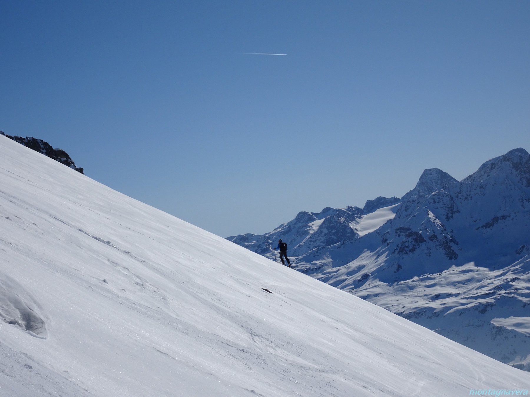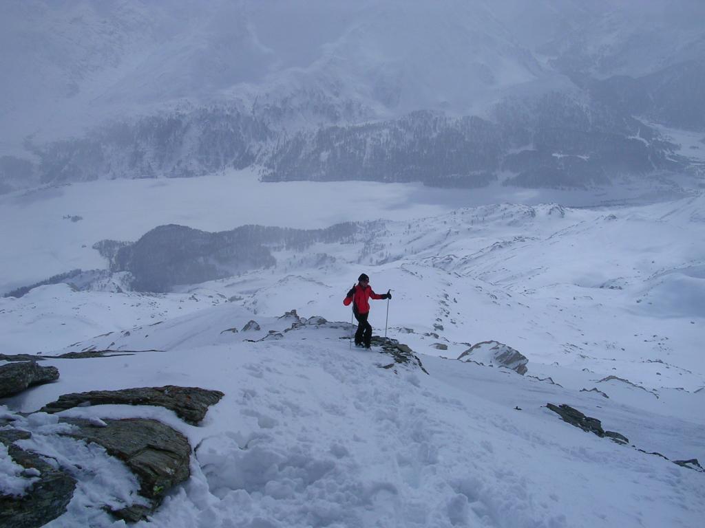 Da qui si sale per dossi e vallette verso NW, si attraversa il Plaun Grand (2325 m), si lascia a sinistra la pista spesso battuta verso il Grevasalvas e si risalgono in direzione nord est vallette e pendii, a tratti ripidi, fino ad una conca a circa 2550 m. Si sale verso la dorsale a destra e si passa da un colletto alla sua sommità (circa 2700 m), quindi si percorre l’ampio pendio finale cosparso di grossi macigni, che diventa sempre più stretto, fino agli ultimi metri da fare a piedi per la cima con grosso ometto. Volendo, si può raggiungere poche decine di metri più avanti, per cresta, stretta ed esposta, un punto più elevato di pochi decimetri.