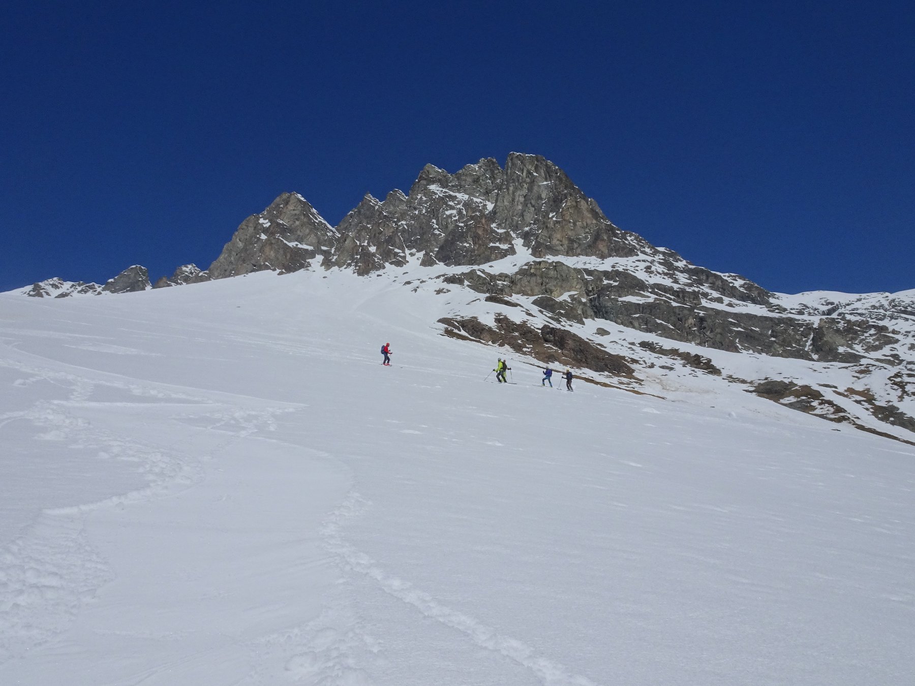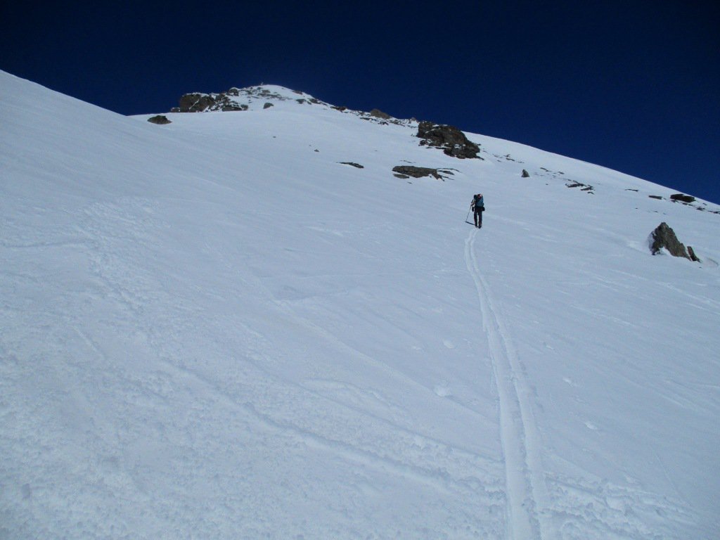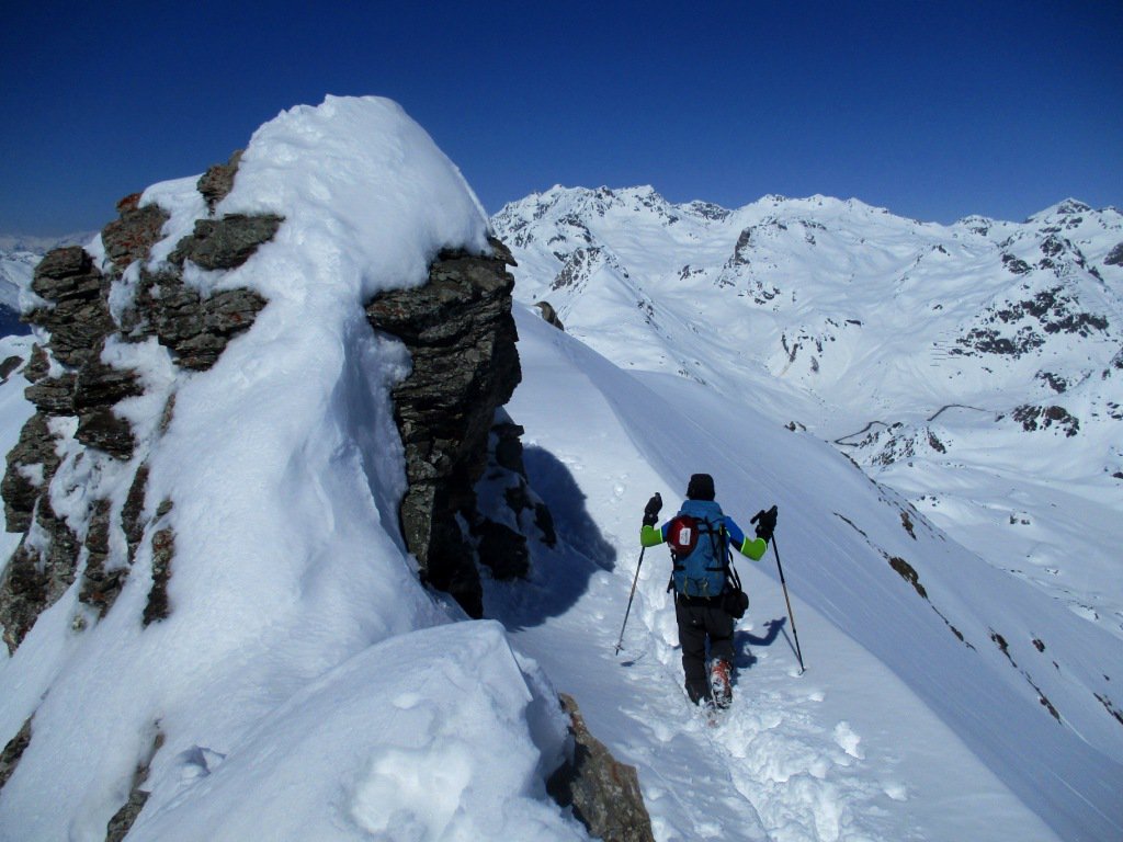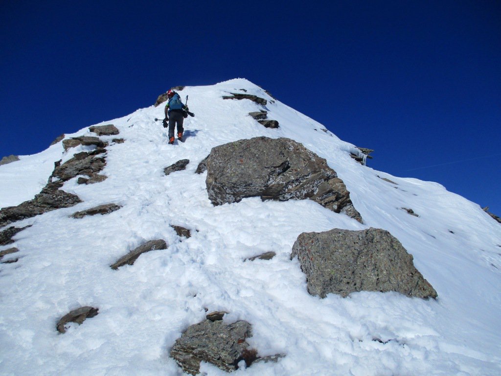 Da qui si sale per dossi e vallette verso NW, si attraversa il Plaun Grand (2325 m), si lascia a sinistra la pista spesso battuta verso il Grevasalvas e si risalgono in direzione nord est vallette e pendii, a tratti ripidi, fino ad una conca a circa 2550 m. Si sale verso la dorsale a destra e si passa da un colletto alla sua sommità (circa 2700 m), quindi si percorre l’ampio pendio finale cosparso di grossi macigni, che diventa sempre più stretto, fino agli ultimi metri da fare a piedi per la cima con grosso ometto. Volendo, si può raggiungere poche decine di metri più avanti, per cresta, stretta ed esposta, un punto più elevato di pochi decimetri.