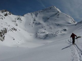 Noi siamo saliti dal Vallone di lauzanier (vedi campana). Una volta che si accetta il grande pianoro di un’ora, posso affermare che la discesa è stata superba. dalla vetta al pianoro 10cm di farina su fondo duro. Uno spettacolo. E al pianoro siamo arrivati alle 14.30. Non so quando dura. Condizioni sicure. Nella foto le nostre tracce in discesa dal colletto sulla cresta di vetta. gruppatto cai ule di Ge-sestri
