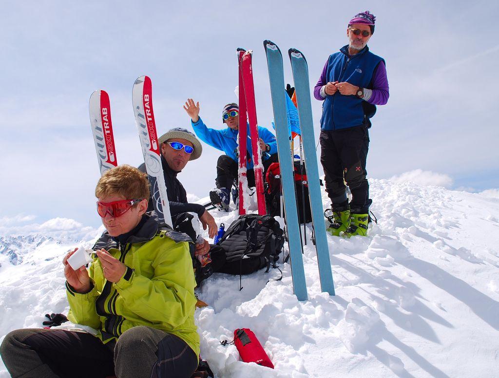 Inizio discesa alle 12,30. I primi 400 m da sballo; da 2550 a 2300 si sfonda un po’ sulle pendenze orientate ad est, poi firn e supertrasformata fino a 1920 dove si tolgono gli sci. 15′ a piedi e si è all’auto dove si festeggia con prosecco e verduzzo.