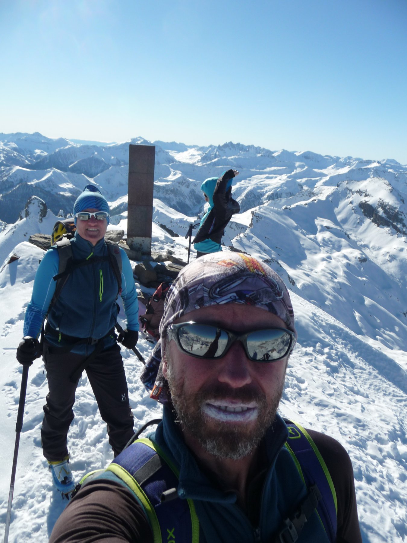 Partiti da Argentera su buona traccia che passa la gorgia in basso con una discreta copertura nevosa. Saliti in vetta con i ramponi la cresta finale con l’impavida in gran forma… In discesa divagazione verso i Tre Vescovi ma fermati poco sotto la vetta vista una bella cornice (ci son passati in mille dalle tracce) ma a me non ispirava… Voglio mica perdermi il cenone di Bartolo… :). In discesa passati all’estrema destra del vallone con discesa a piedi per passare salto ghiacciato.