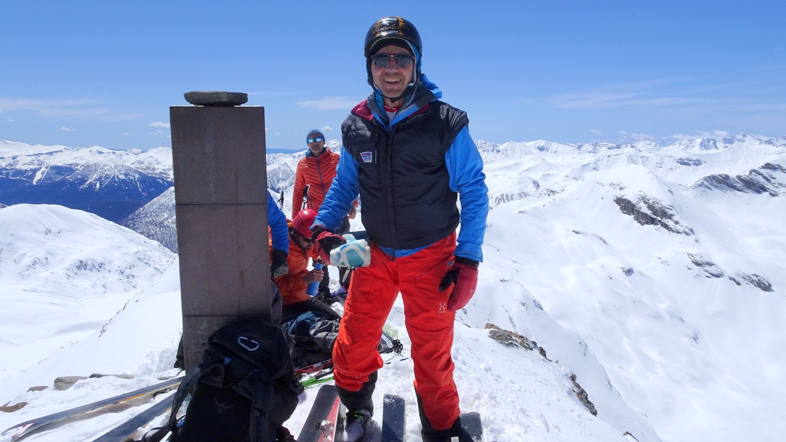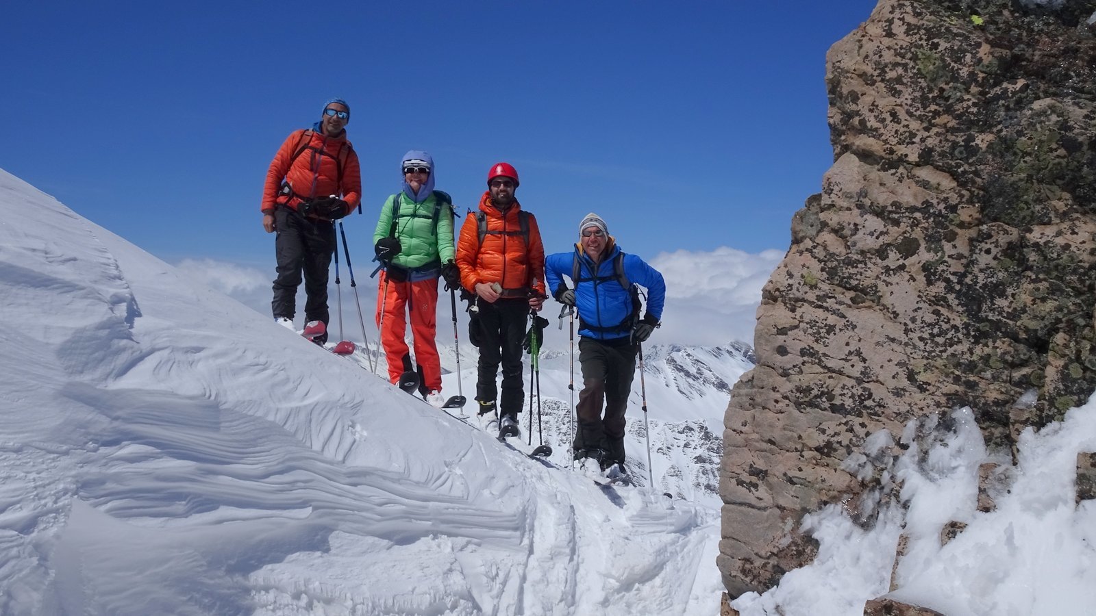 Prima del colle che adduce alla cresta di vetta abbiamo fatto un tratto di pochi metri con sci in mano , facendo le peste per superare un pezzo troppo ripido da salire con gli sci con i quali abbiamo raggiunto la vetta , panorama molto bello con innevamento notevole su tutte le cime ed in basso sufficiente sino a 2000mt.
