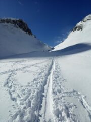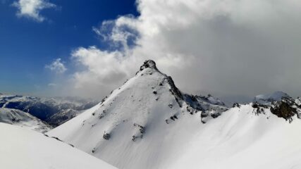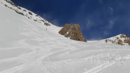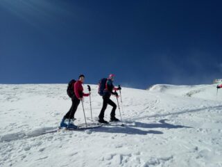 Partiti su 5 cm di neve fresca che in cima arrivano a 10/15 cm. Vento forte e freddo su tutto il percorso. Ultimo tratto di cresta prima della cima su neve dura e ghiacciata. In discesa alcuni di noi scesi dalla diretta che dal colletto porta direttamente al pianoro in uscita dalla Gorgia. Altri scesi per l’itinerario di salita. Su entrambi i percorsi neve fresca su fondo duro.