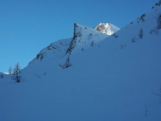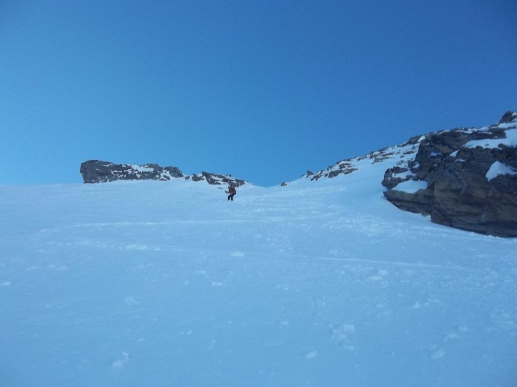 Gita presa al volo date le condizioni favorevoli,quel pò di farina che basta perché il percorso non sia pericoloso,assenza di vento e freddo intenso,tolto gli sci in salita due volte,la prima per superare la gola del primo pendio ripido,ancora un po magro di neve,la seconda dopo il pianoro per sicurezza salendo il più diritto possibile onde evitare il traversone anche se pareva sicuro era abbastanza carico.in discesa evitato il traverso scendendo la piacevole e ripida gola che muore nel pianoro sottostante.