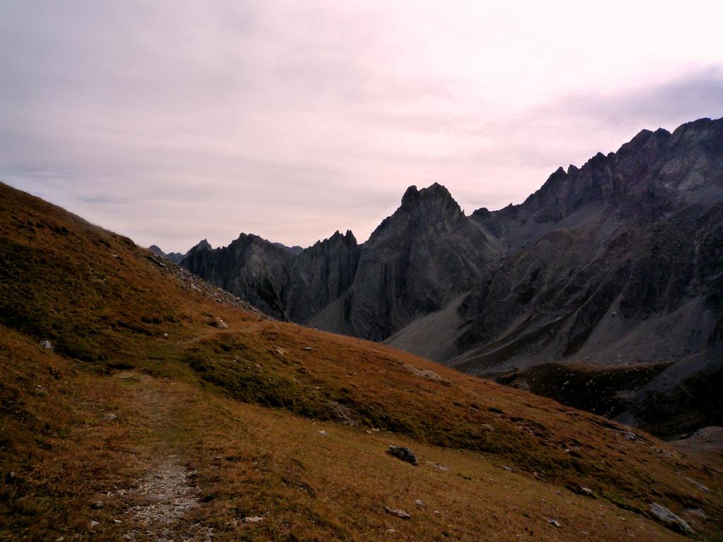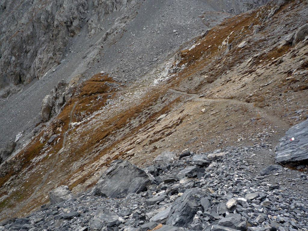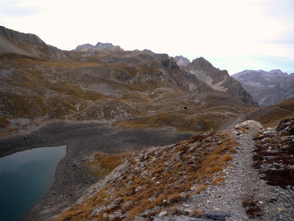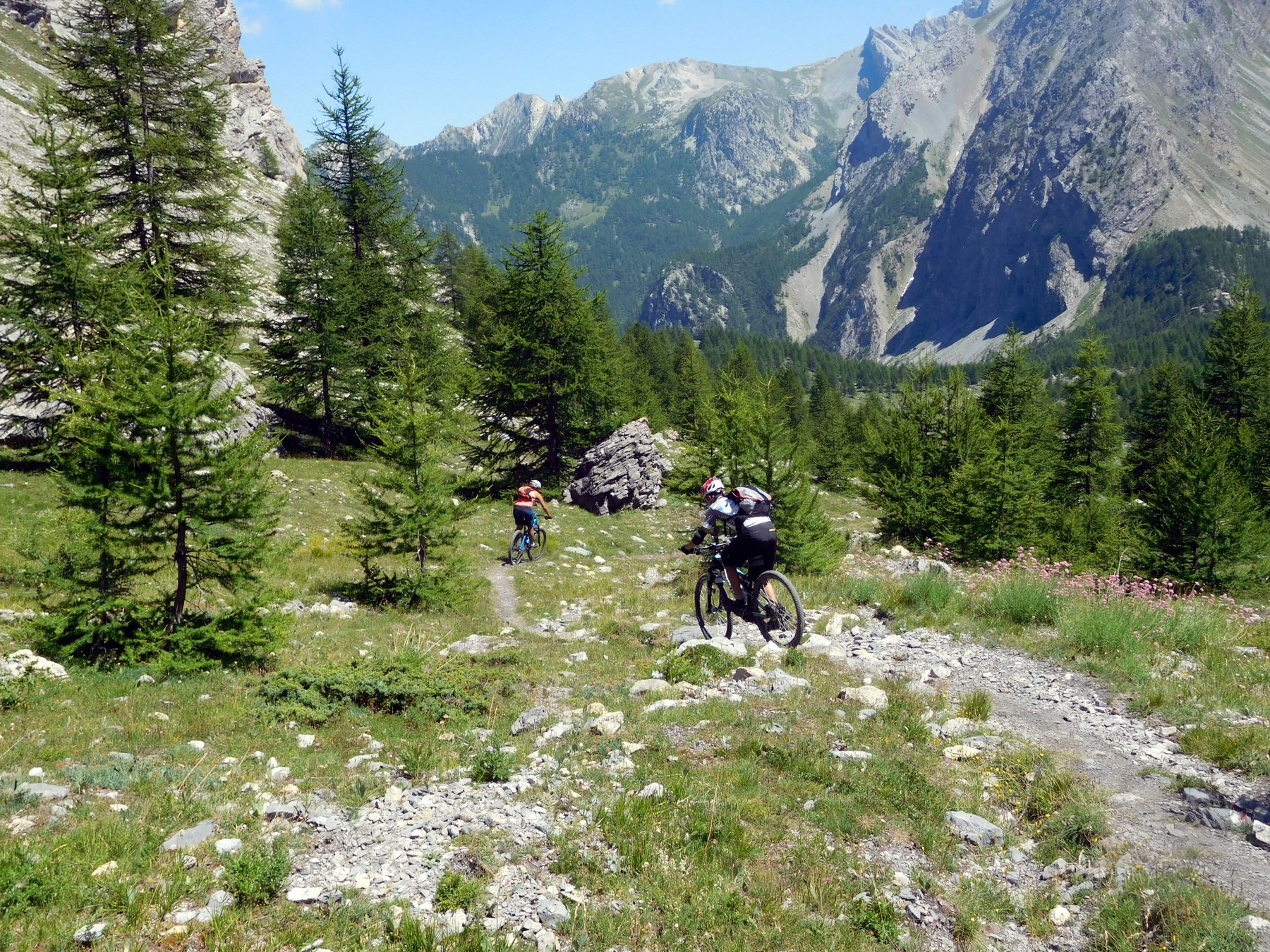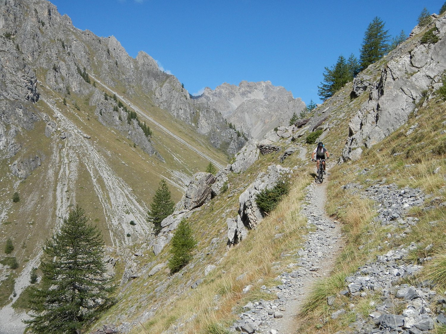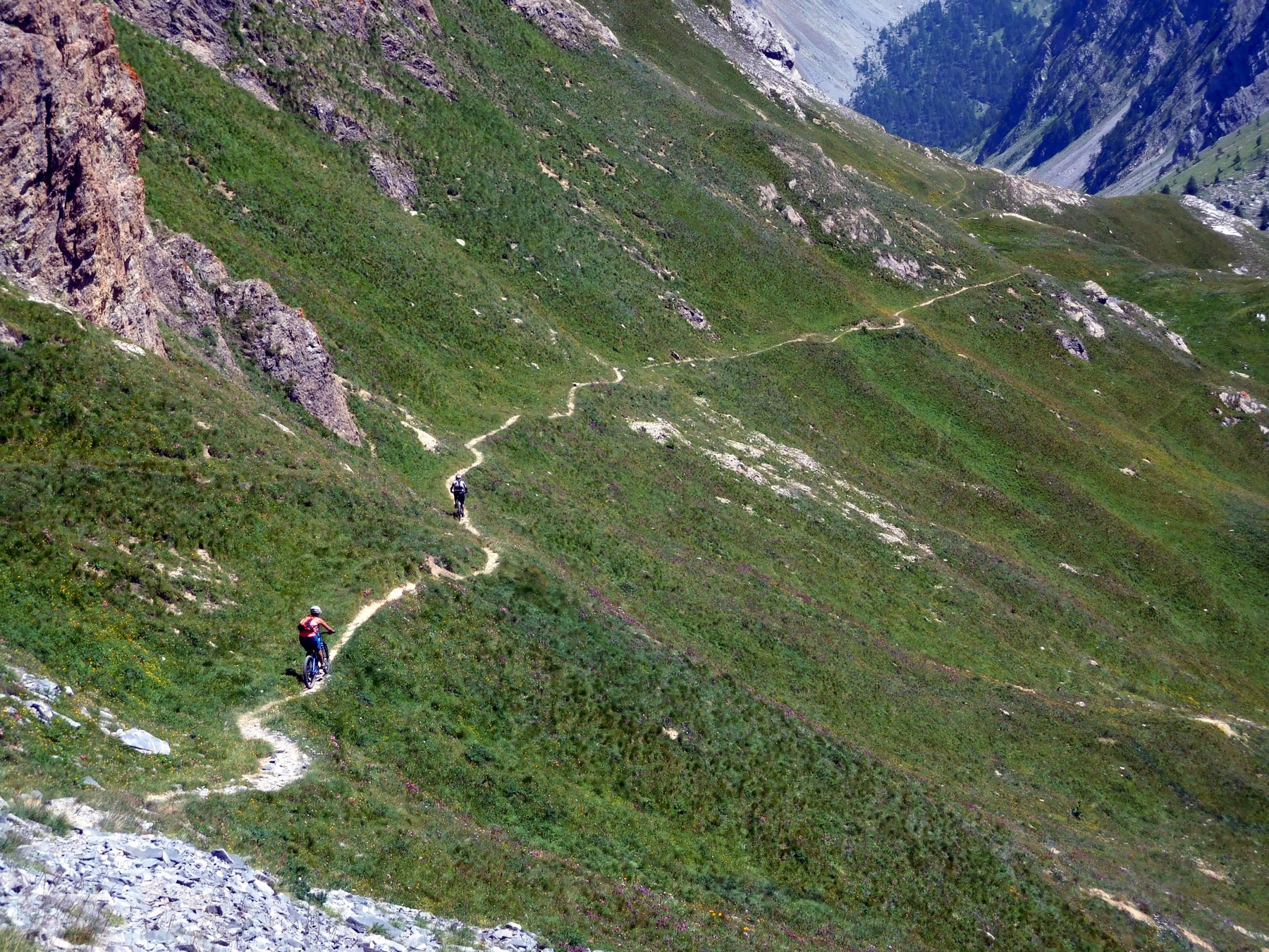 Si va a sinistra in salita sulla carrareccia e la si abbandona 50m più sù per un sentiero a sinistra con indicazioni: “Lago Visaisa, Il Colletto, Colle di Enchiausa”, poco ciclabile, almeno finché non transita sopra il lago Visaisa, sulla sua sinistra salendo, e ridiventa bellissimo, con dei bei traversi ascendenti completamente ciclabili, anche se si deve prestare un pò di attenzione a causa della frequente esposizione.