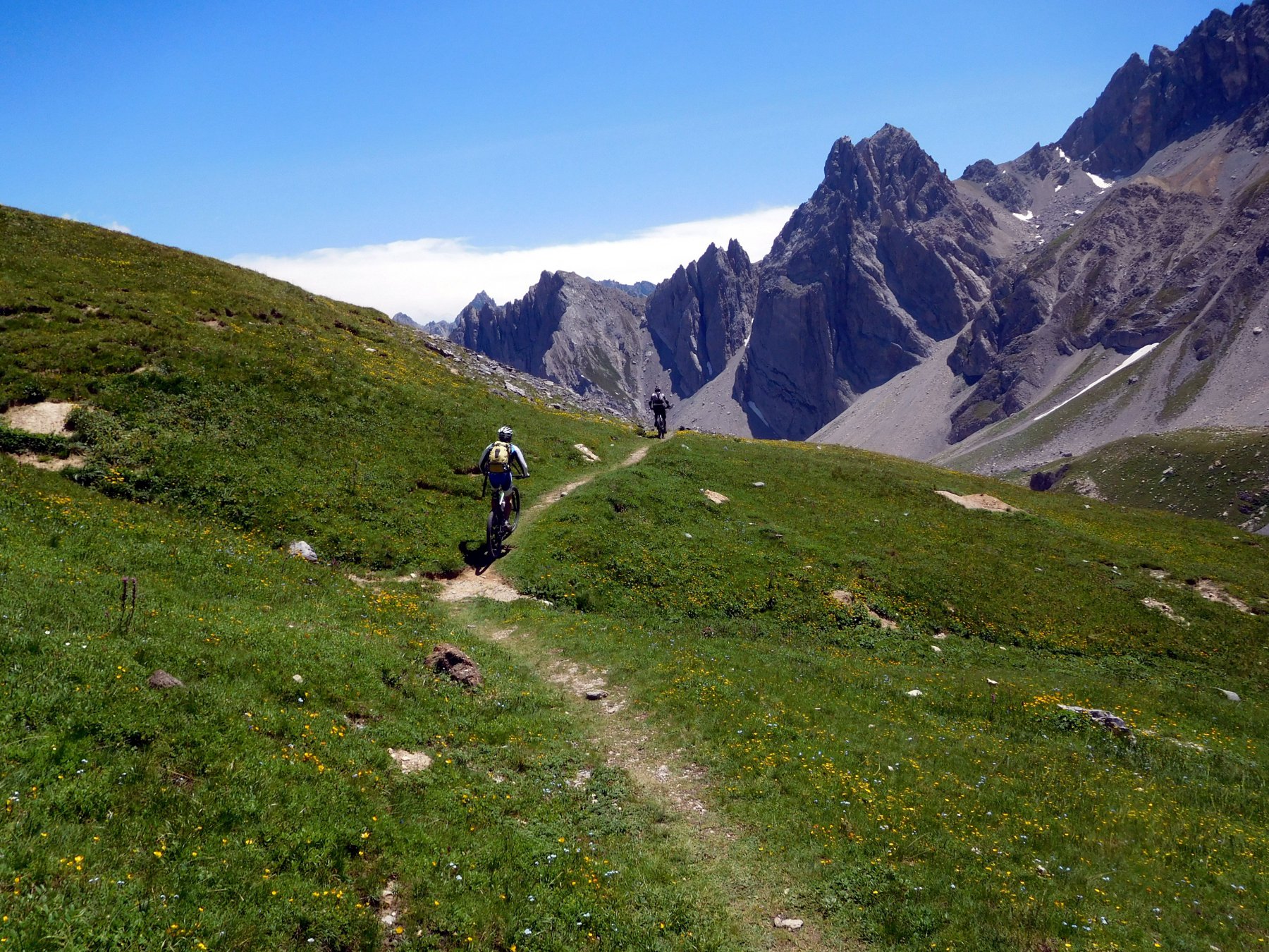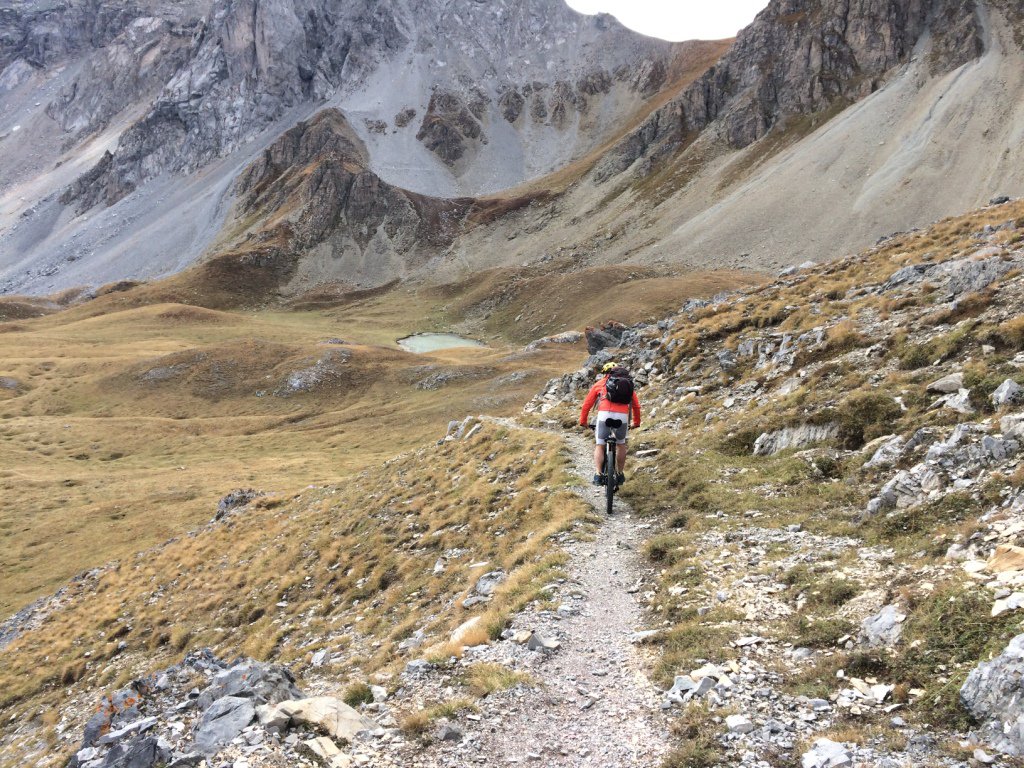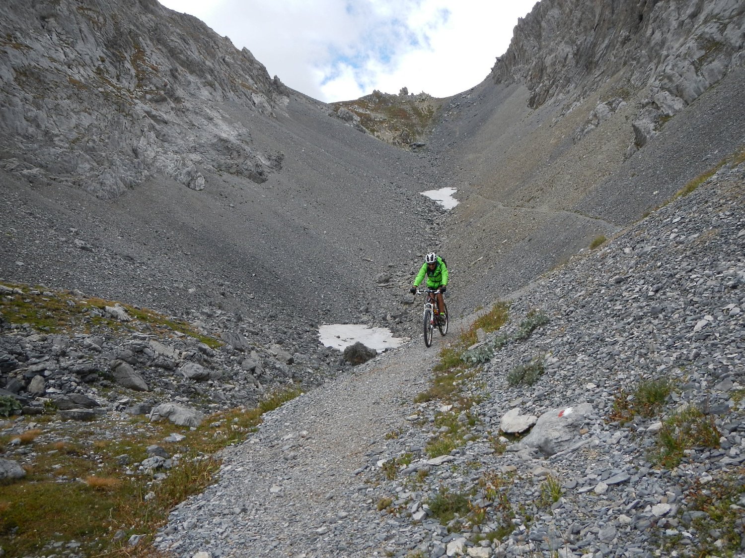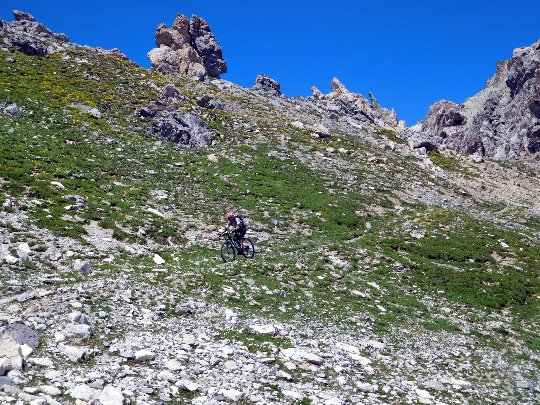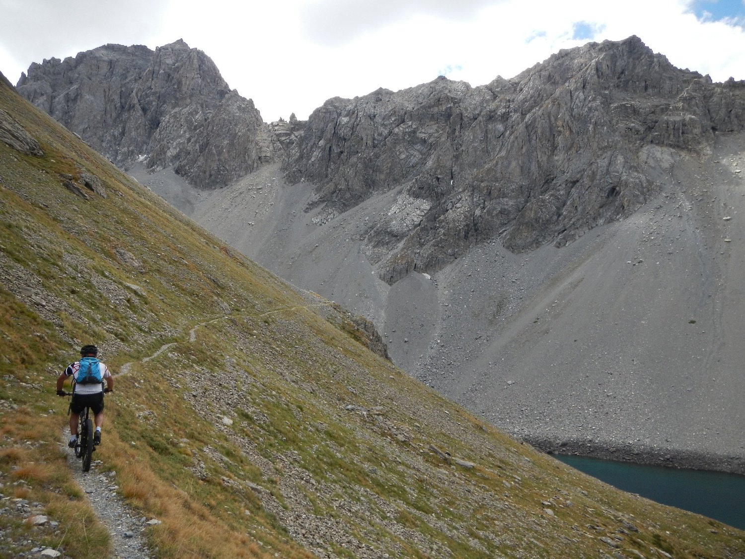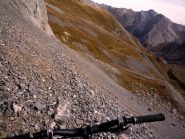 In vista del Bivacco si prende il sentiero che va a sinistra, sempre pedalabile su traversone che passa sopra il lago Apsoi e si continua in sella fin che si può sù per il canalone dell’Enchiausa.