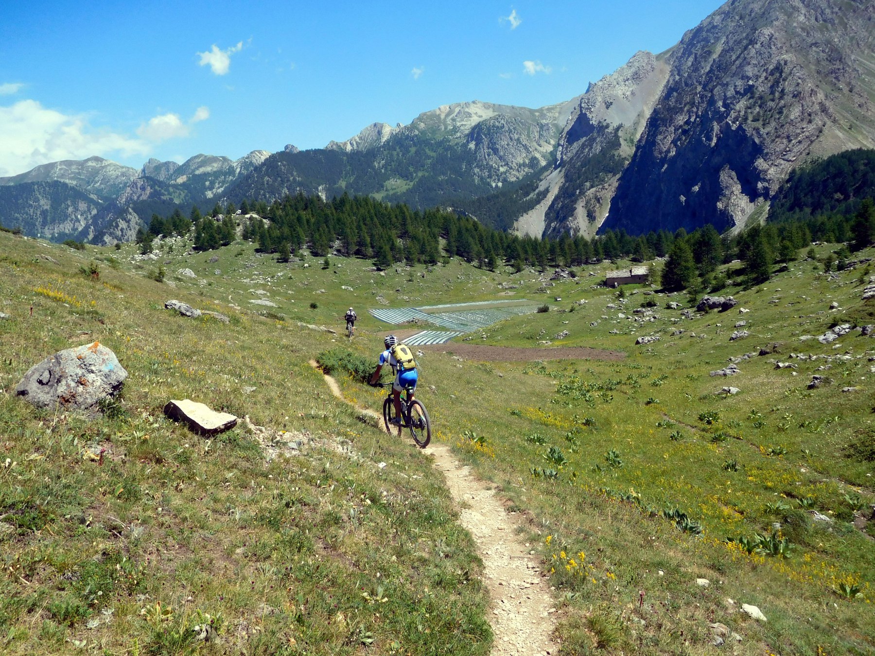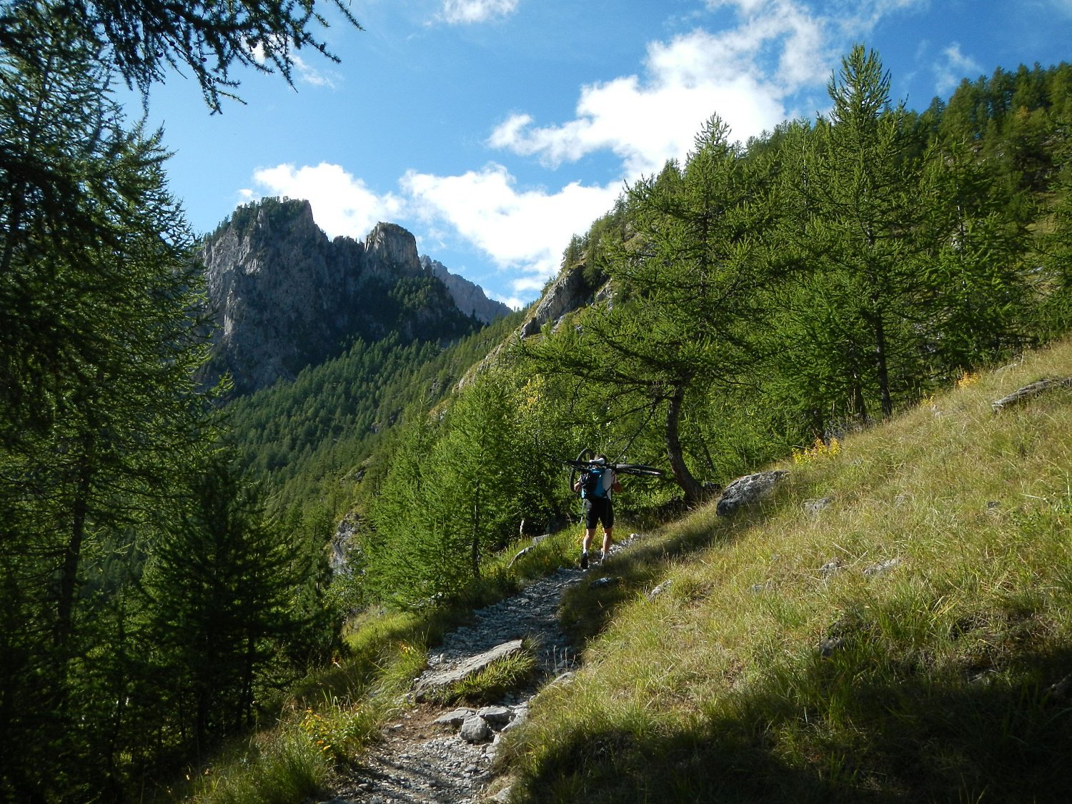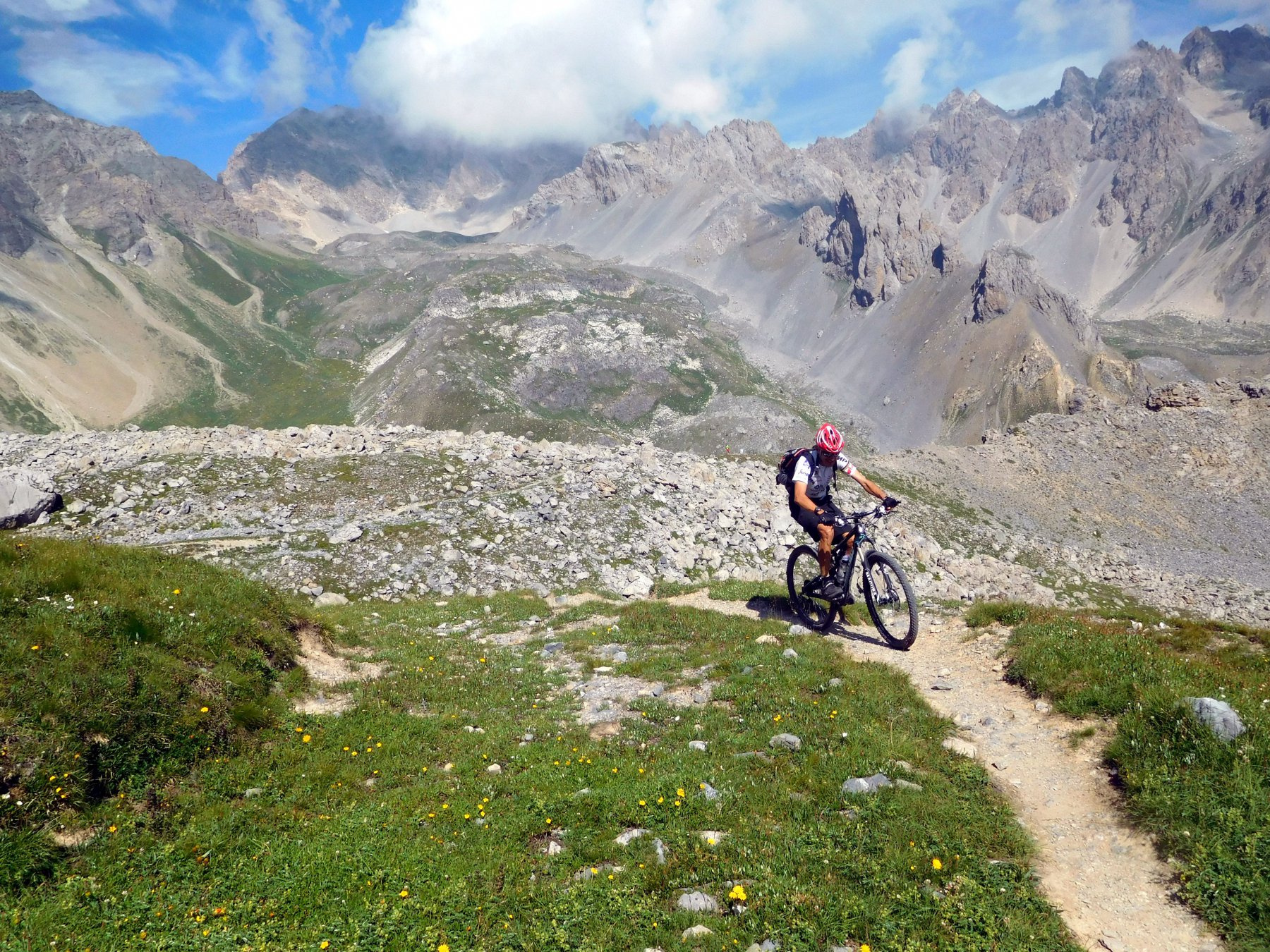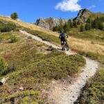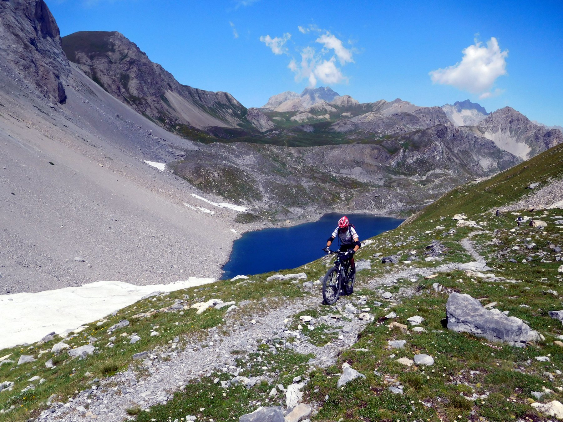 In vista del Bivacco si prende il sentiero che va a sinistra, sempre pedalabile su traversone che passa sopra il lago Apsoi e si continua in sella fin che si può sù per il canalone dell’Enchiausa.