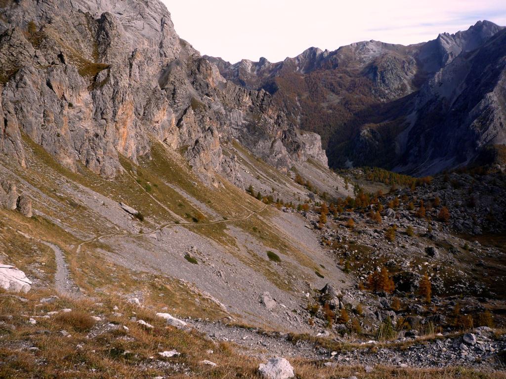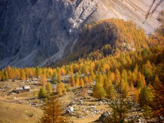 Siscende al di là sul bel sentiero tra i larici, che ha qualche breve tratto che può essere pantanoso e con fondo brutto, ma per la maggioranza, con qualche brevissima risalita, é divertente e non difficile ed arriva ad incrociare la sterrata che sale da Saretto, nei pressi delle sorgenti del Maira (1650).