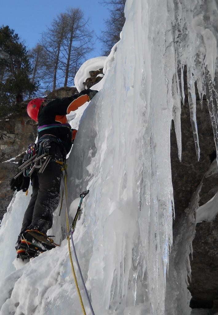bella cascata facile per iniziare la stagione. Le tante cordate hanno fatto la traccia per l’avvicinamento e pulito la cascata. Prima sosta su 2 chiodi da collegare, seconda sosta su grossa abalakov naturale, terza sosta su albero.