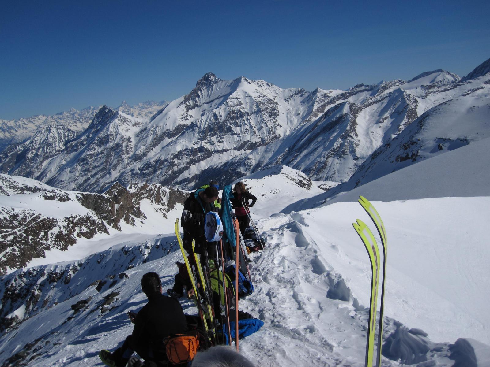 Oggi giornata spettacolare con pochissima ventilazione in cima e naturalmente molti skialp sul percorso, ma essendo partiti abbastanza presto siamo arrivati in cima per primi e quindi ci siamo goduti un’ottima discesa trovando ancora spazi vergini.