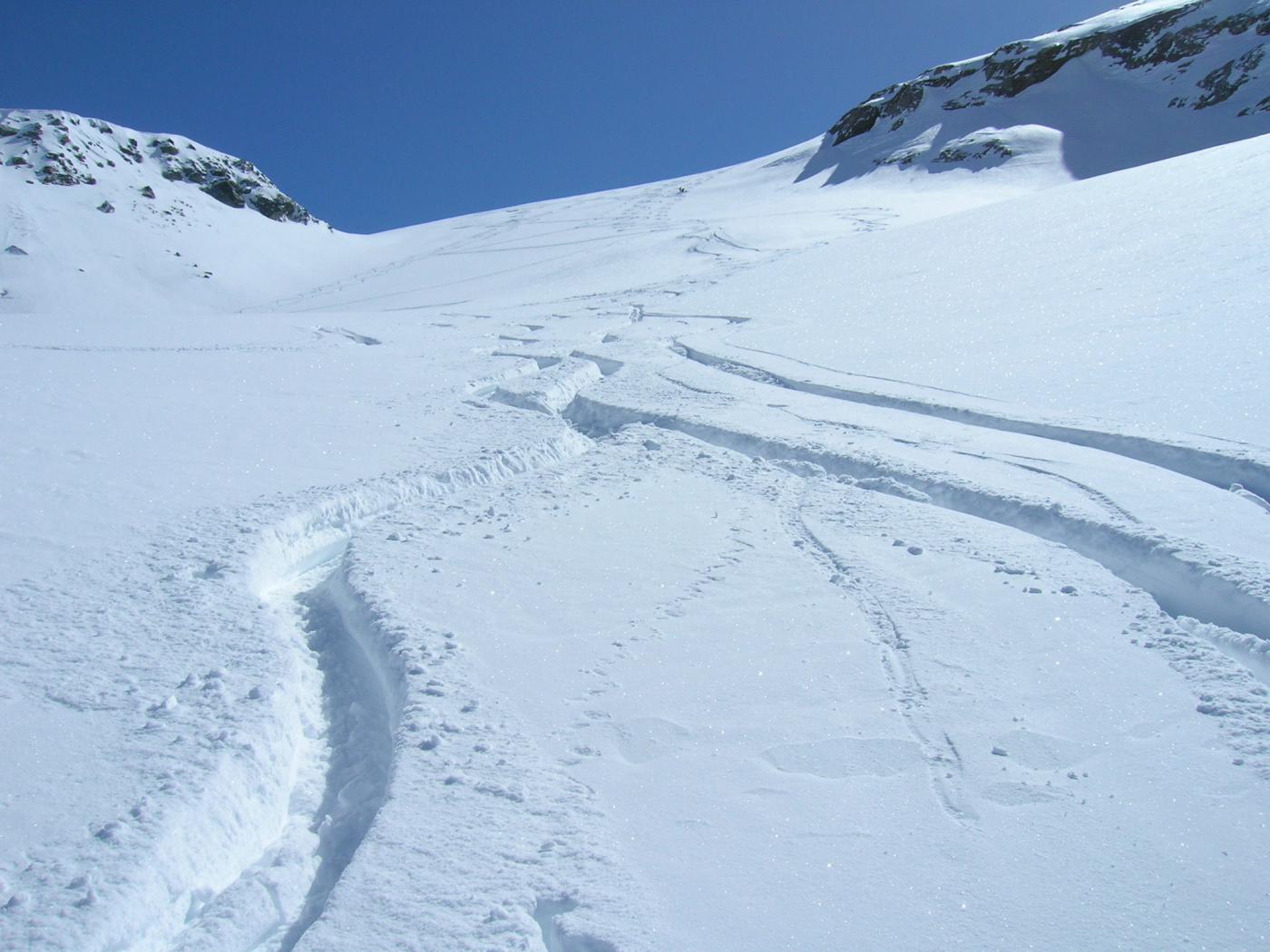 Il versante sud lato opposto della valle ha slavinato tutta la mattina mentre nel nostro vallone i pendii ci sono parsi sicuri,nessun assestamento, anke se nn ci siamo fidati più di tanto a verificare i tratti più ripidi vista la molta neve presente.